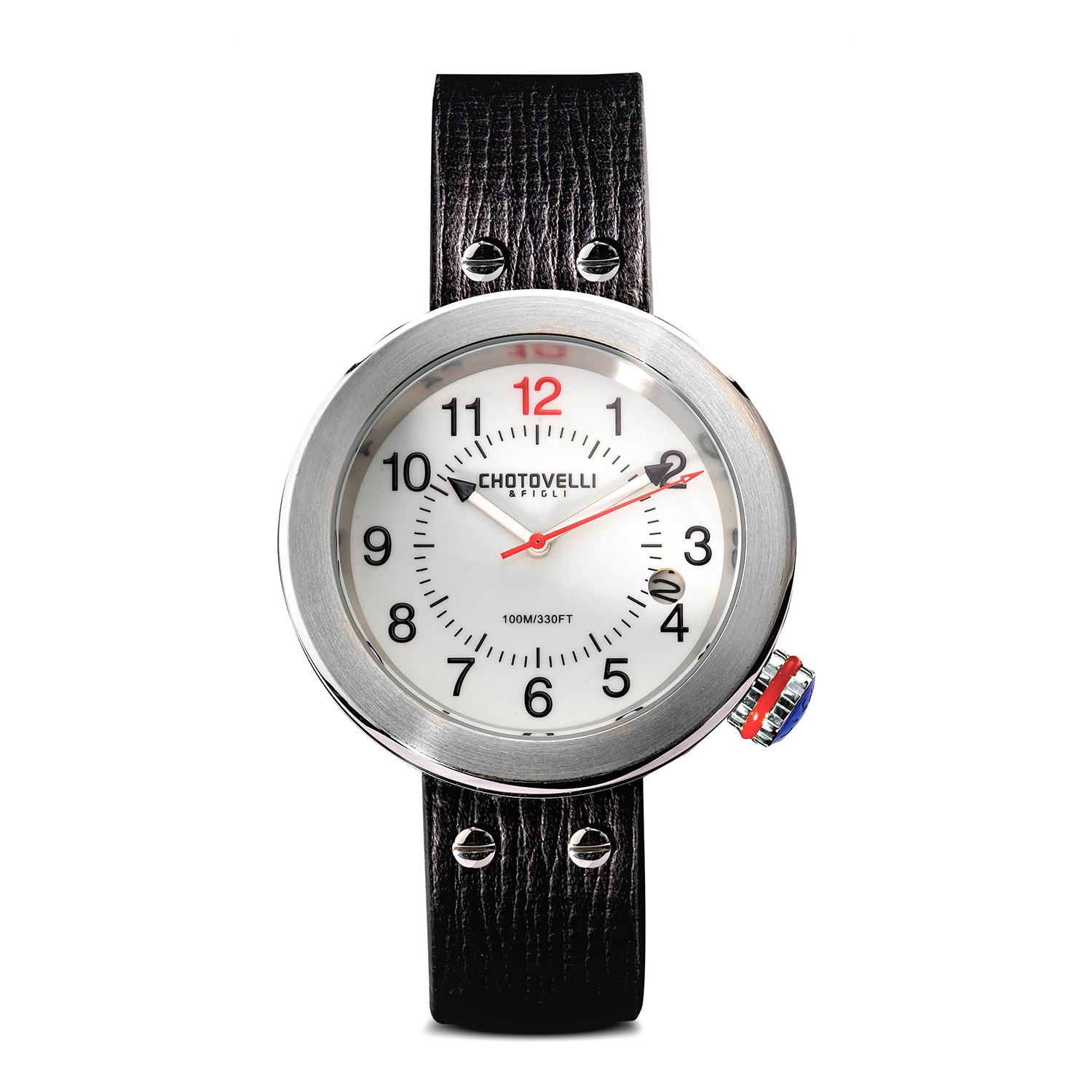 Inspired by vintage gauges and speedometers made by the Italian iconic car maker Alfa Romeo, the Chotovelli Gauge Quartz comes with a 13.10 mm thick case and a shiny finished stainless steel and black diamond-like-carbon. The strap is uncompromising, handcrafted to fit perfectly in the case. No lugs, just four visible screws. Luminous elements are unnecessary, a distraction, nothing superfluous detracts from the functions this watch performs.