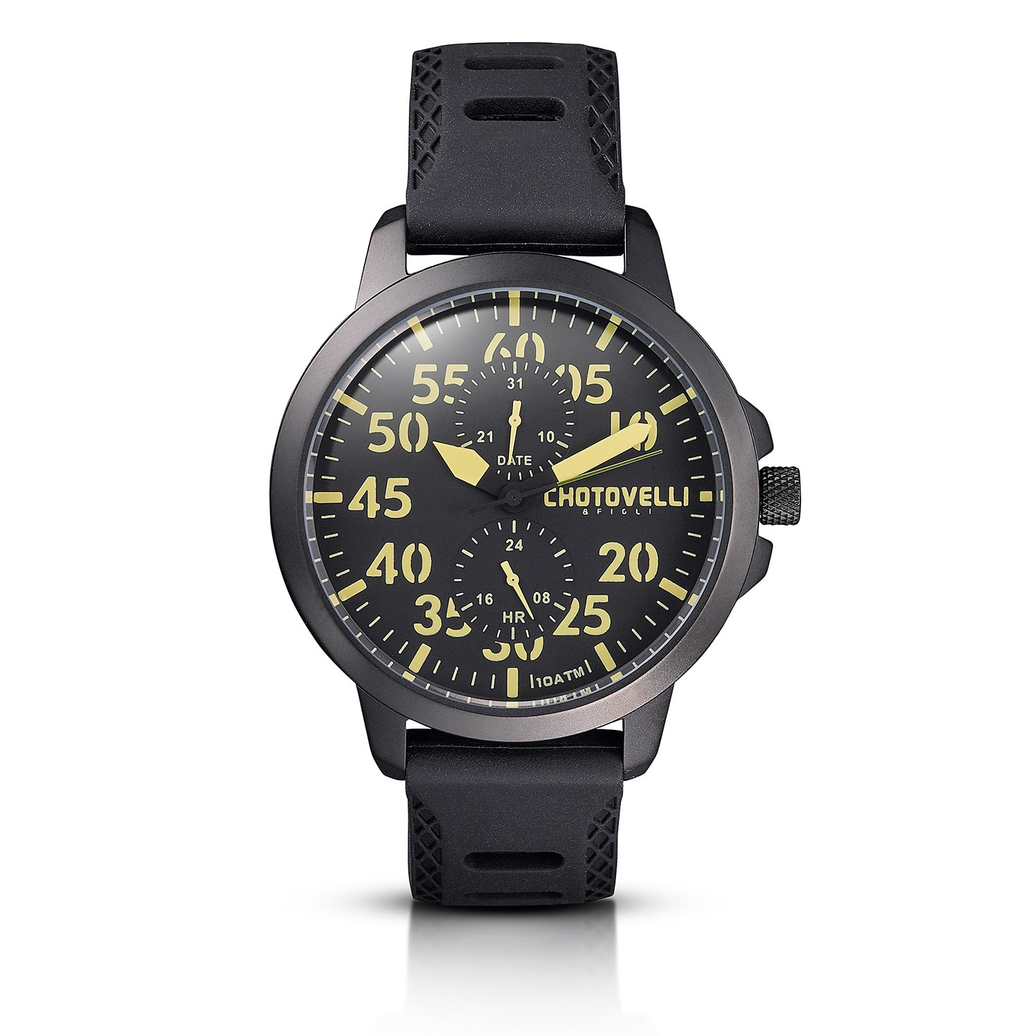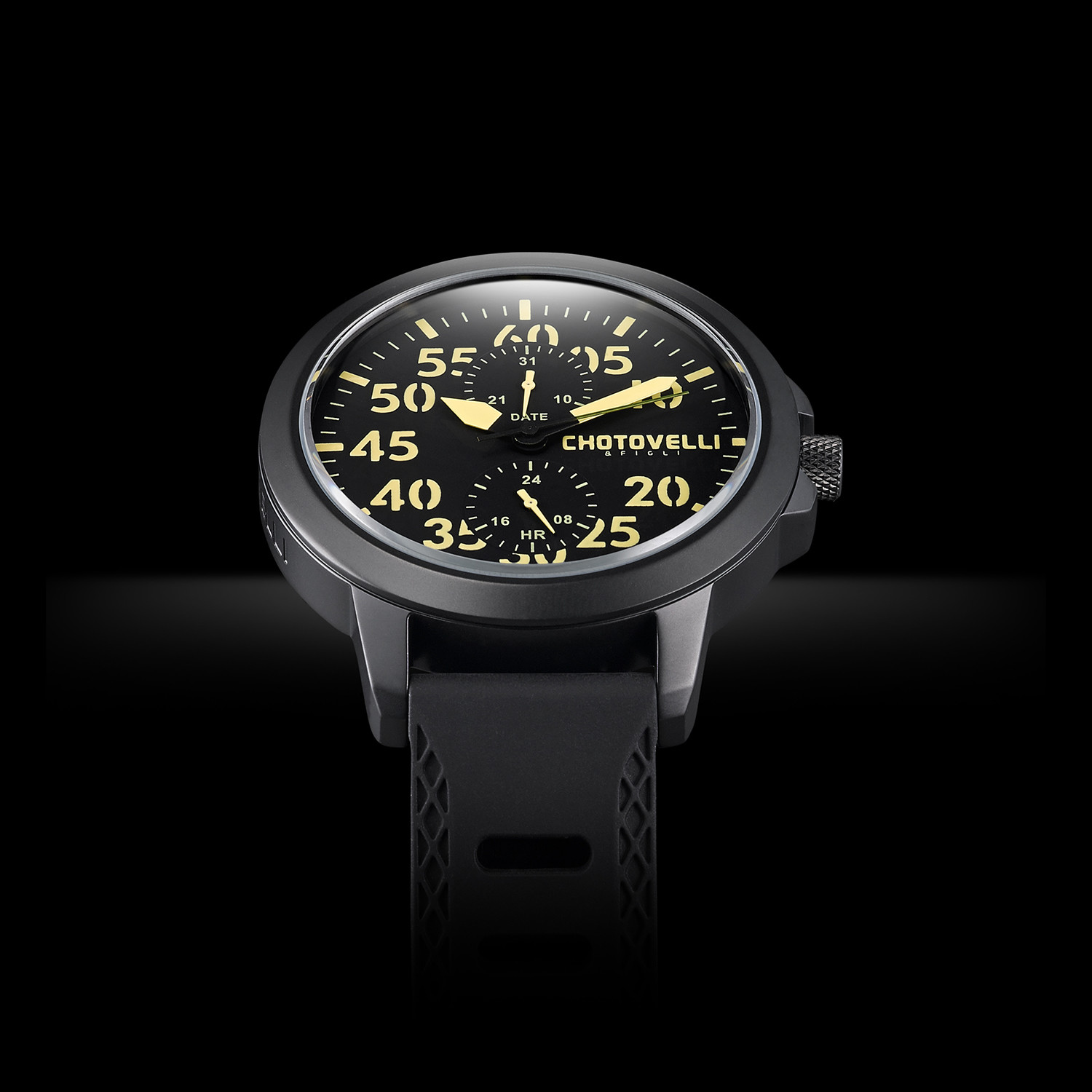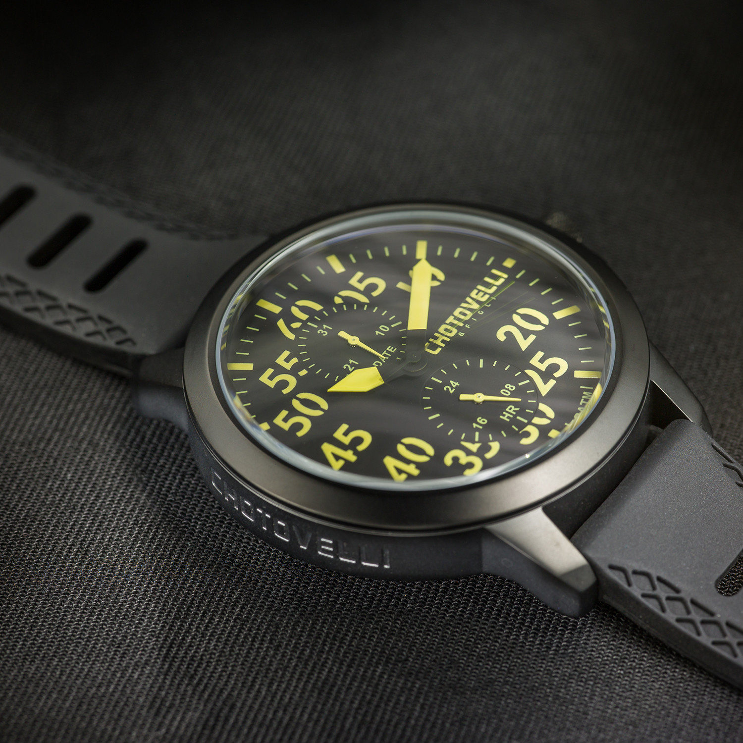 Chotovelli & Figli are third generation watchmakers from Torino. They manufacture pilot watches designed and inspired by gauges and speedometers made by the Italian car and aviation industry. Their family-made pieces are built on a rich heritage of craftsmanship, quality, and precision.