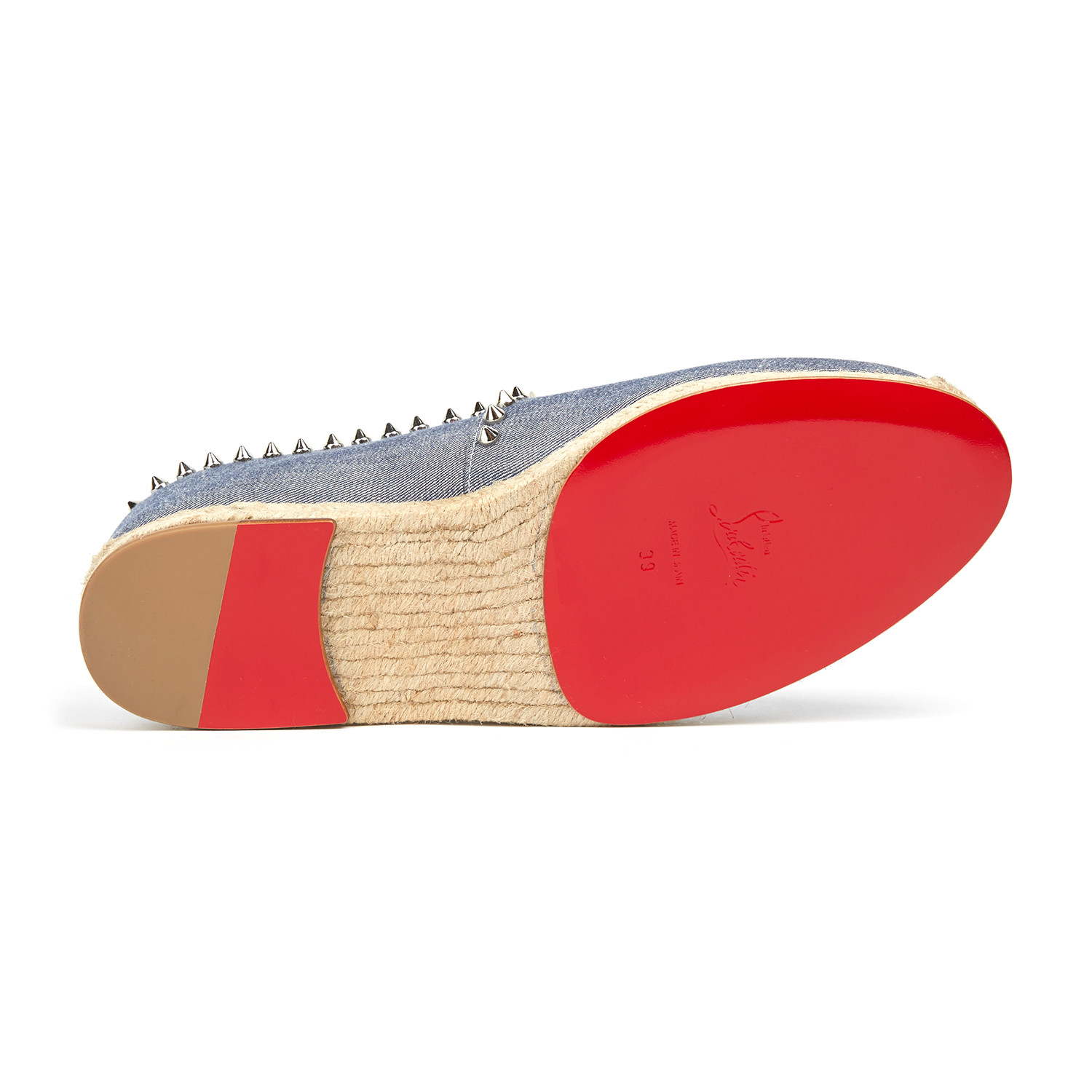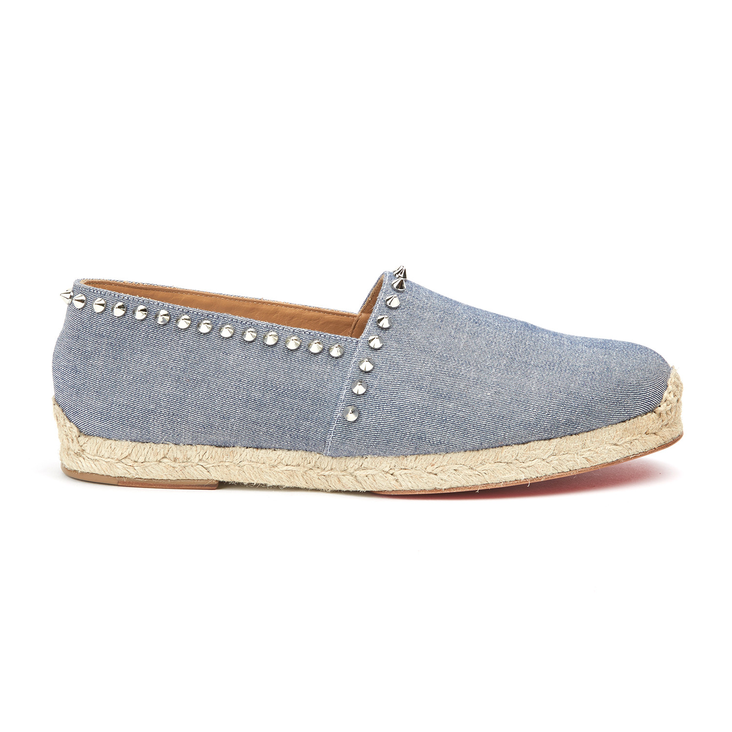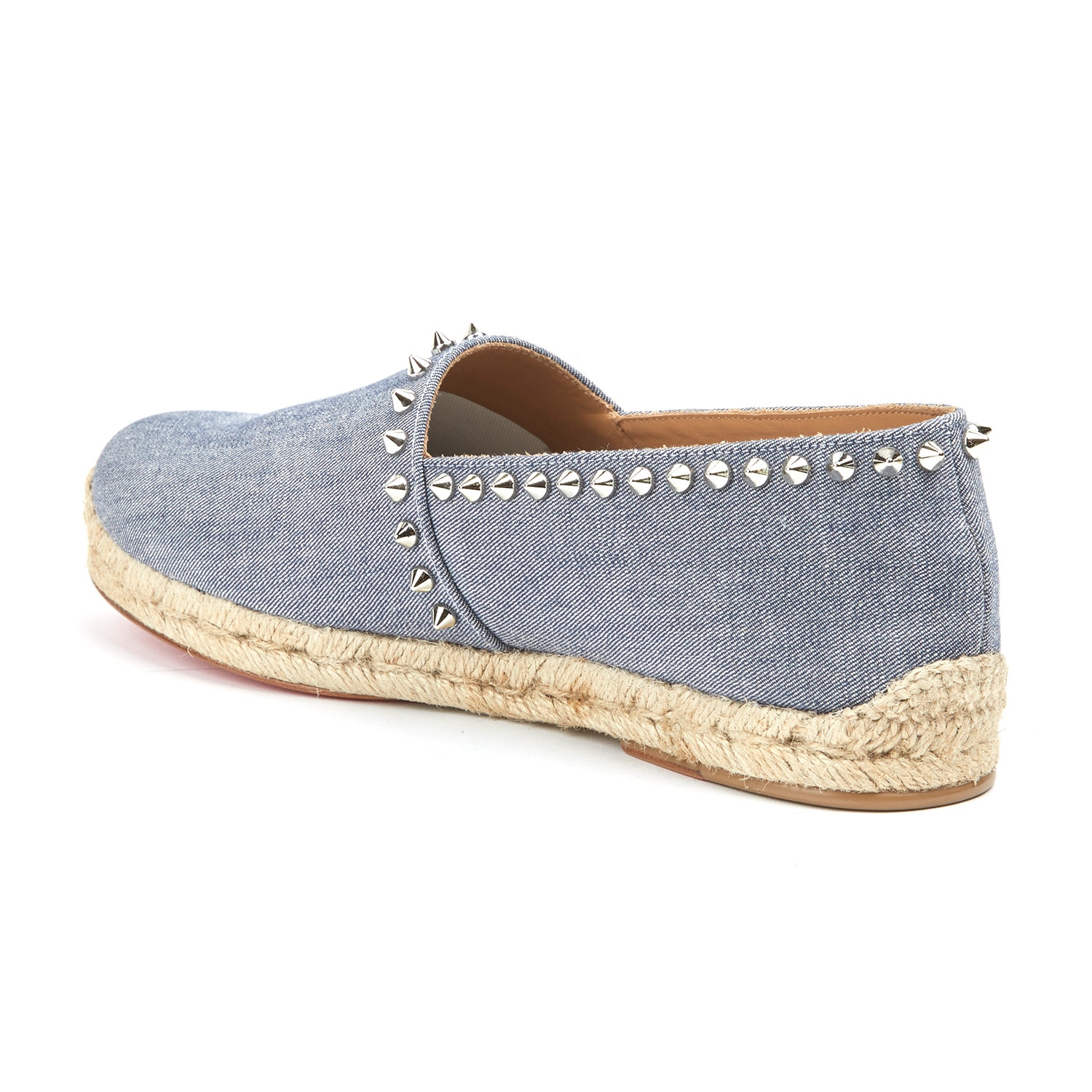 The Melides Casa Flat is a versatile off-duty style for all seasons. This slip-on espadrille in light blue denim and signature light gold spikes is so easy to wear, you will never want to take them off. Keeping with tradition, all Louboutin espadrilles are made in Spain.