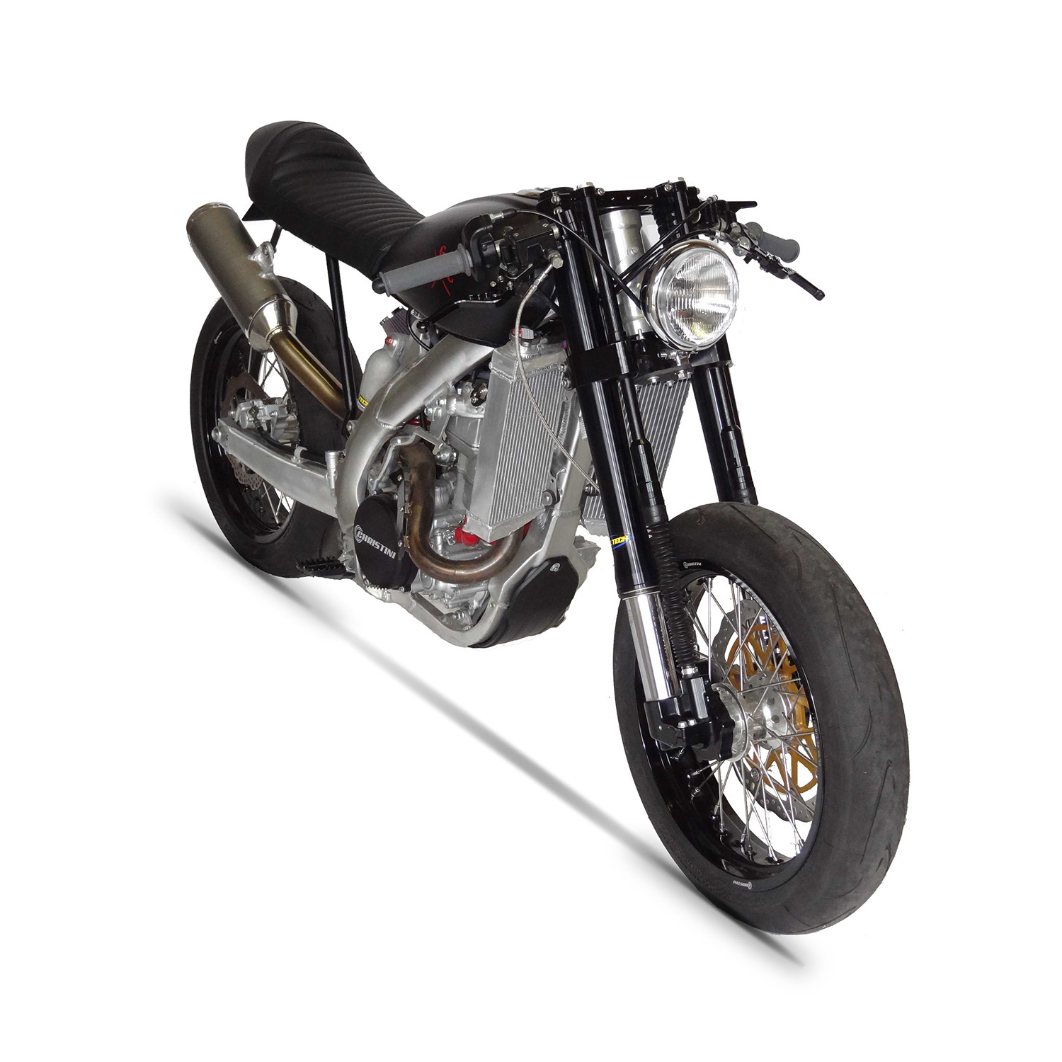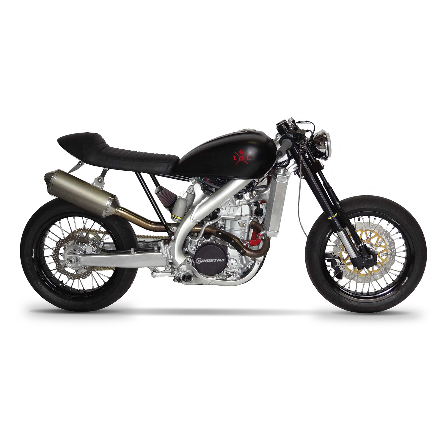 After months of collaboration between CHRISTINI and Loaded Gun Customs, the new AWD Street Racer is finally available to own. Built from a CHRISTINI AWD 450DS and modified to perfection by Loaded Gun Customs, this indomitable bike is one of only a few in existence. Loaded Gun spared no expense in turning an off-road machine into an unstoppable street racer with a Keihn FCR Carb and a custom intake with a K&N cone filter. It also features high flow radiators, performance exhaust, and tons of other upgrades.