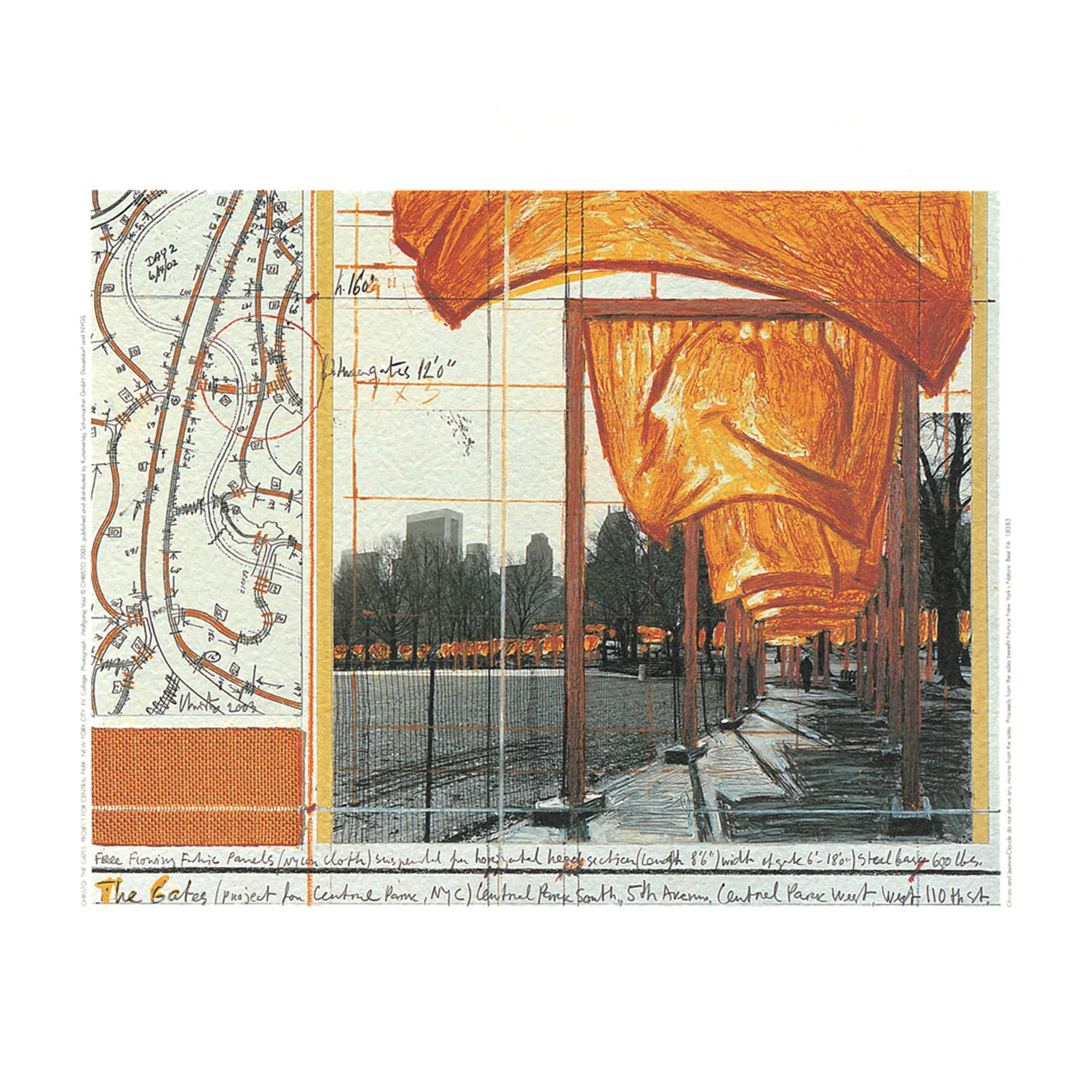 Offset lithography is a printing technique wherein the image is created from a polymer coating applied to a flexible plastic or metal plate, and transferred onto a flexible rubber sheet before being transferred to the printing surface. This method allows for malleability in the printing elements, to make sure the details are authentically replicated. This particular print features Christo and Jeanne-Claude's 2005 installation "The Gates".