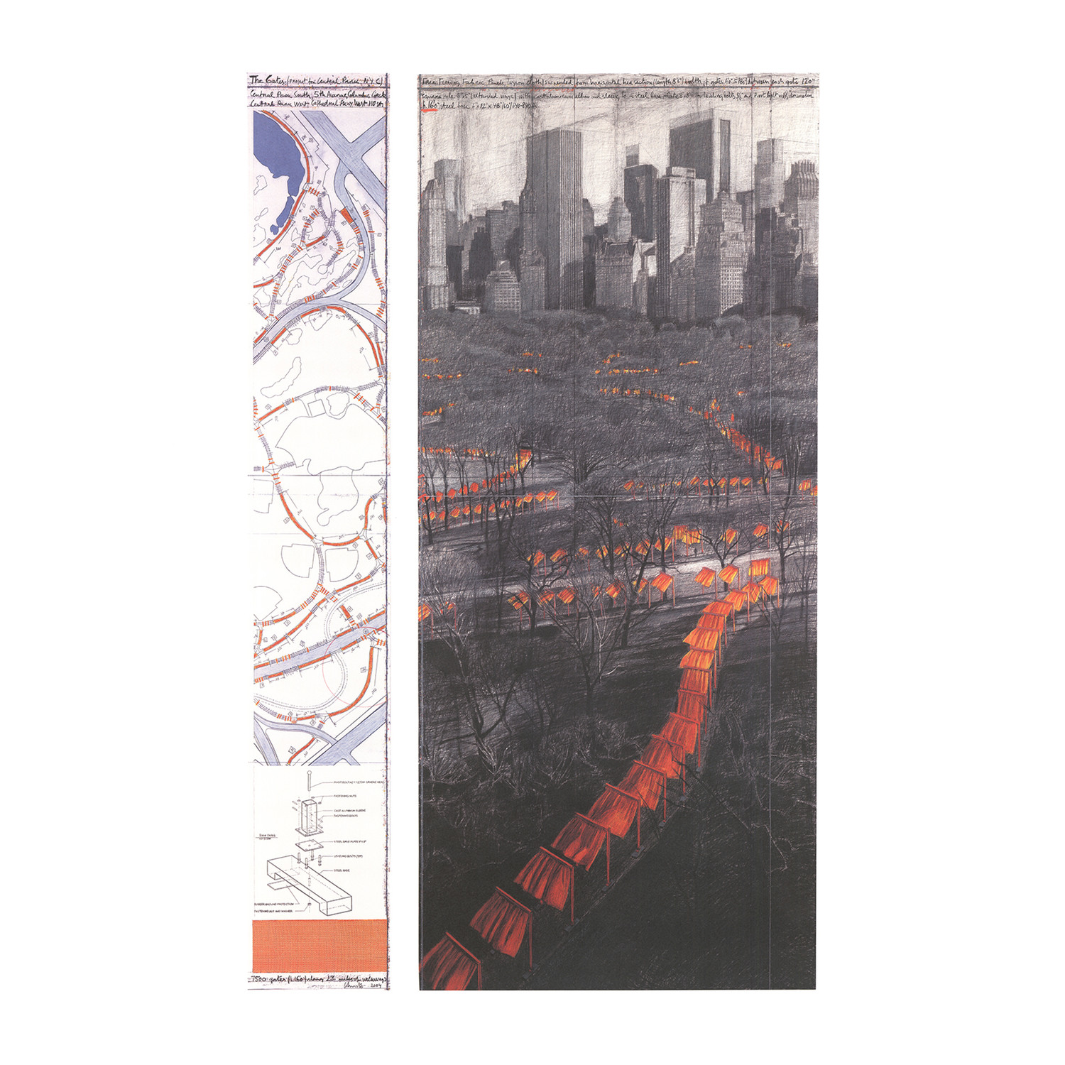 Offset lithography is a printing technique wherein the image is created from a polymer coating applied to a flexible plastic or metal plate, and transferred onto a flexible rubber sheet before being transferred to the printing surface. This method allows for malleability in the printing elements, to make sure the details are authentically replicated. This particular print features Christo and Jeanne-Claude's 2005 installation "The Gates".