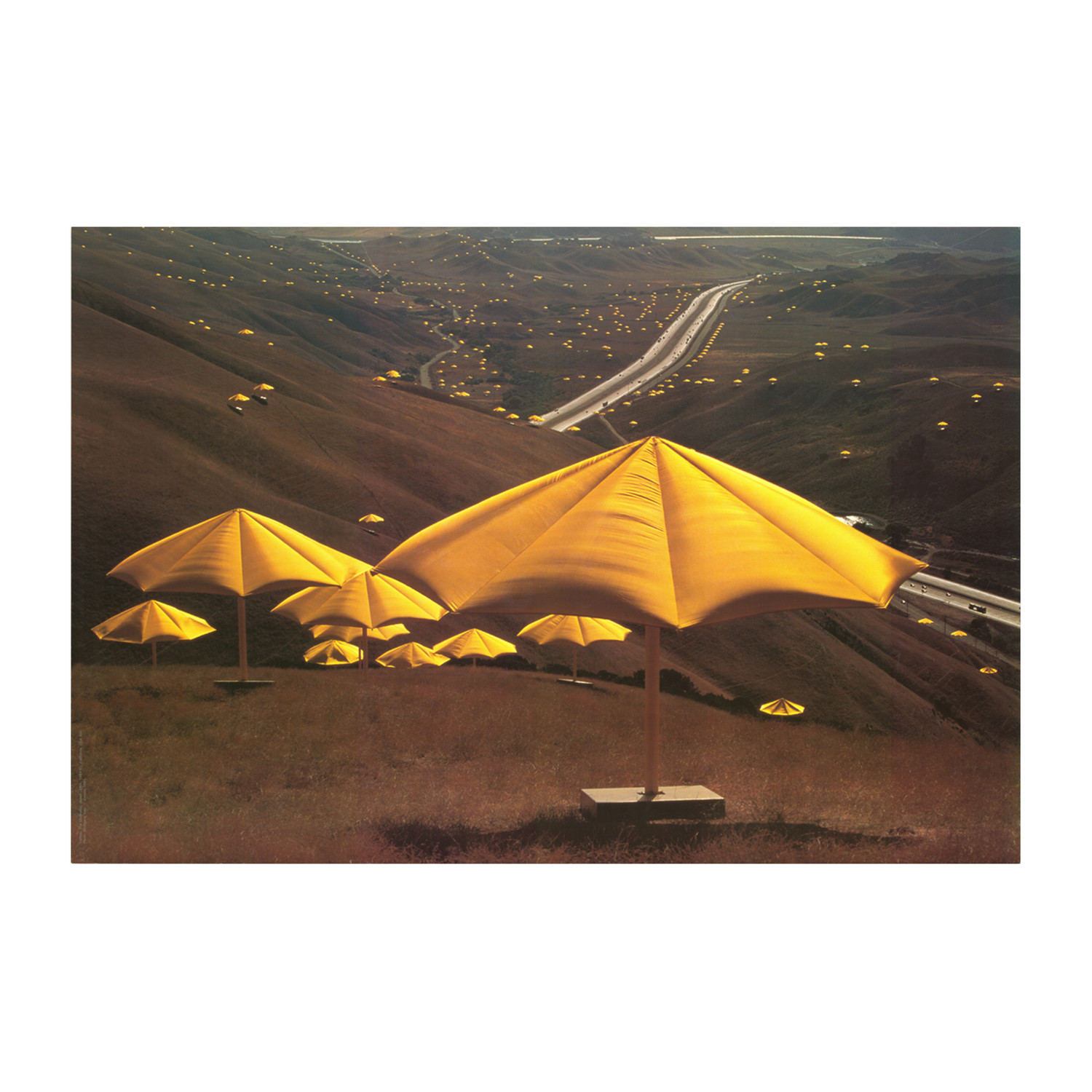 This particular print features Christo and Jeanne-Claude's installation "The Yellow Umbrellas". In October of 1991, Christo and Jean-Claude constructed an installation in two valleys, one in Japan, north of Tokyo and one in California, north of Los Angeles. 960 yellow umbrellas were stretched along the length of the Californian valley, and 920 blue umbrellas along the valley in Japan. The intention was to demonstrate the similarities and differences of the two valleys and the two countries.