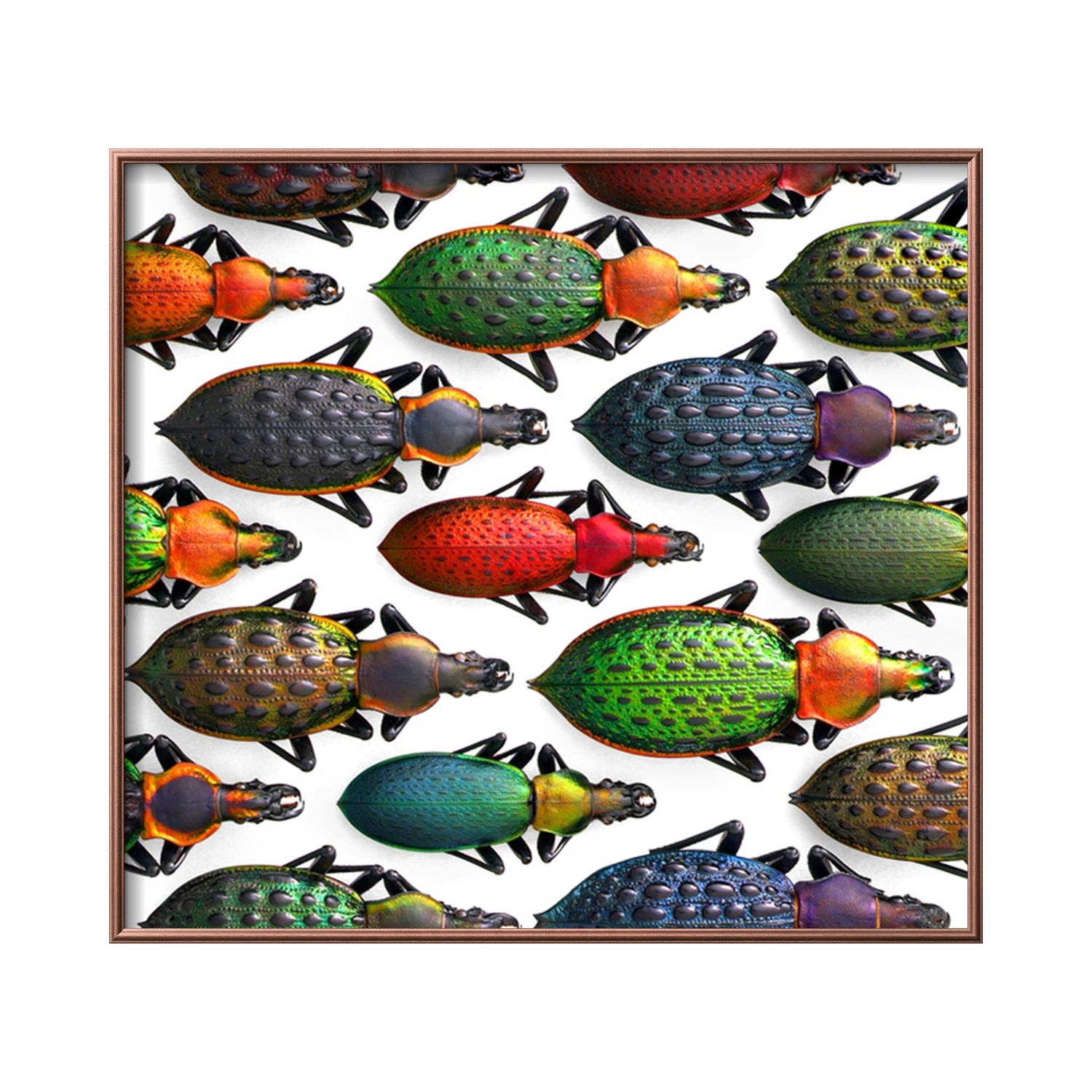This beautiful print features an incredibleAsian Ground Beetles arrangement by natural artist Christopher Marley. Every detail of these incredible beetles is captured in this high quality photographic print, which arrives at your home with a copper frame and mounting hardware already included. There's no better way to celebrate the iridescence of insects in your home.