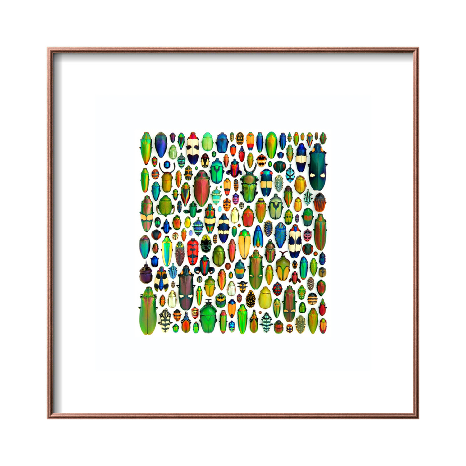 This beautiful print features an incredibleColeoptera Mosiac arrangement by natural artist Christopher Marley. Every detail of these incredible beetles is captured in this high quality photographic print, which arrives at your home with a copper frame and mounting hardware already included. There's no better way to celebrate the iridescence of insects in your home.