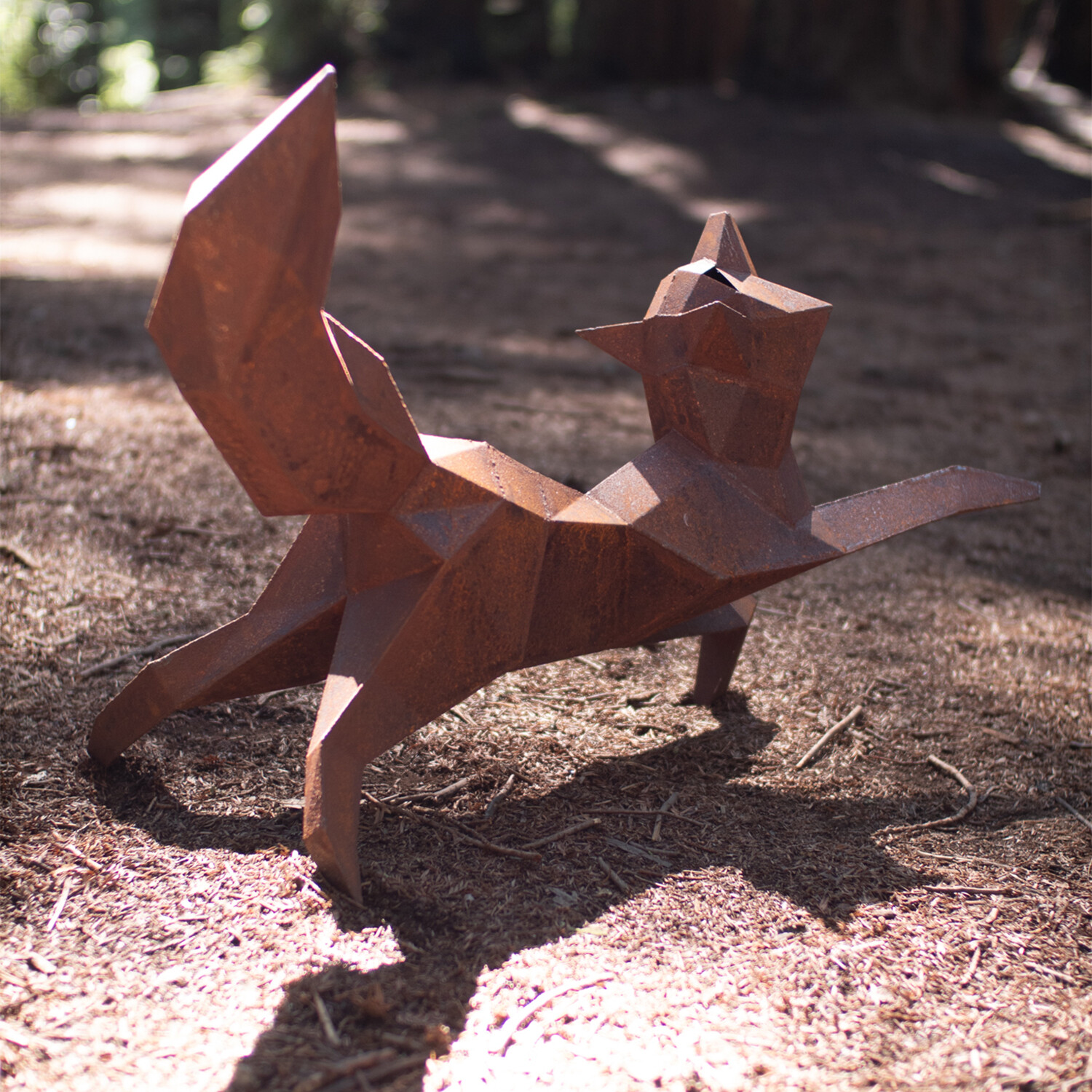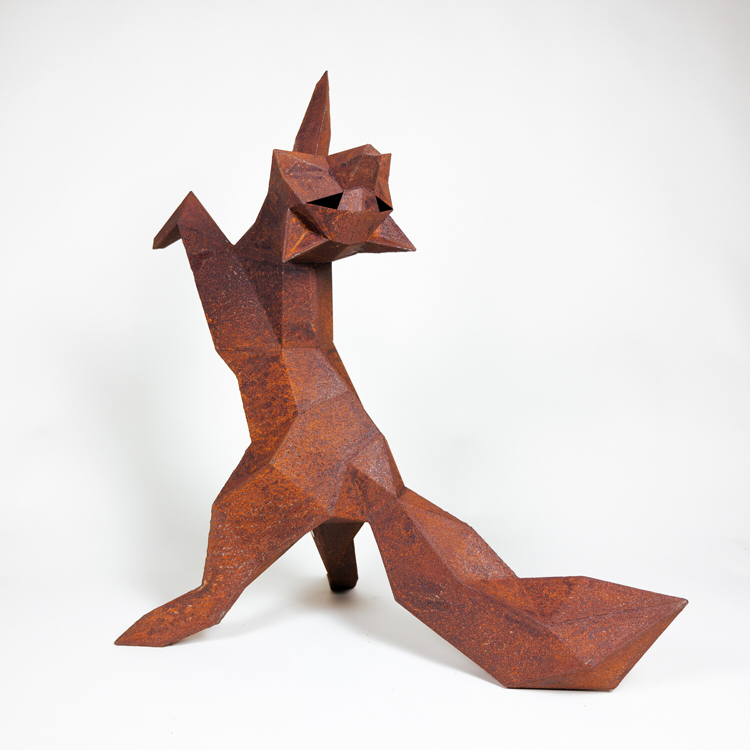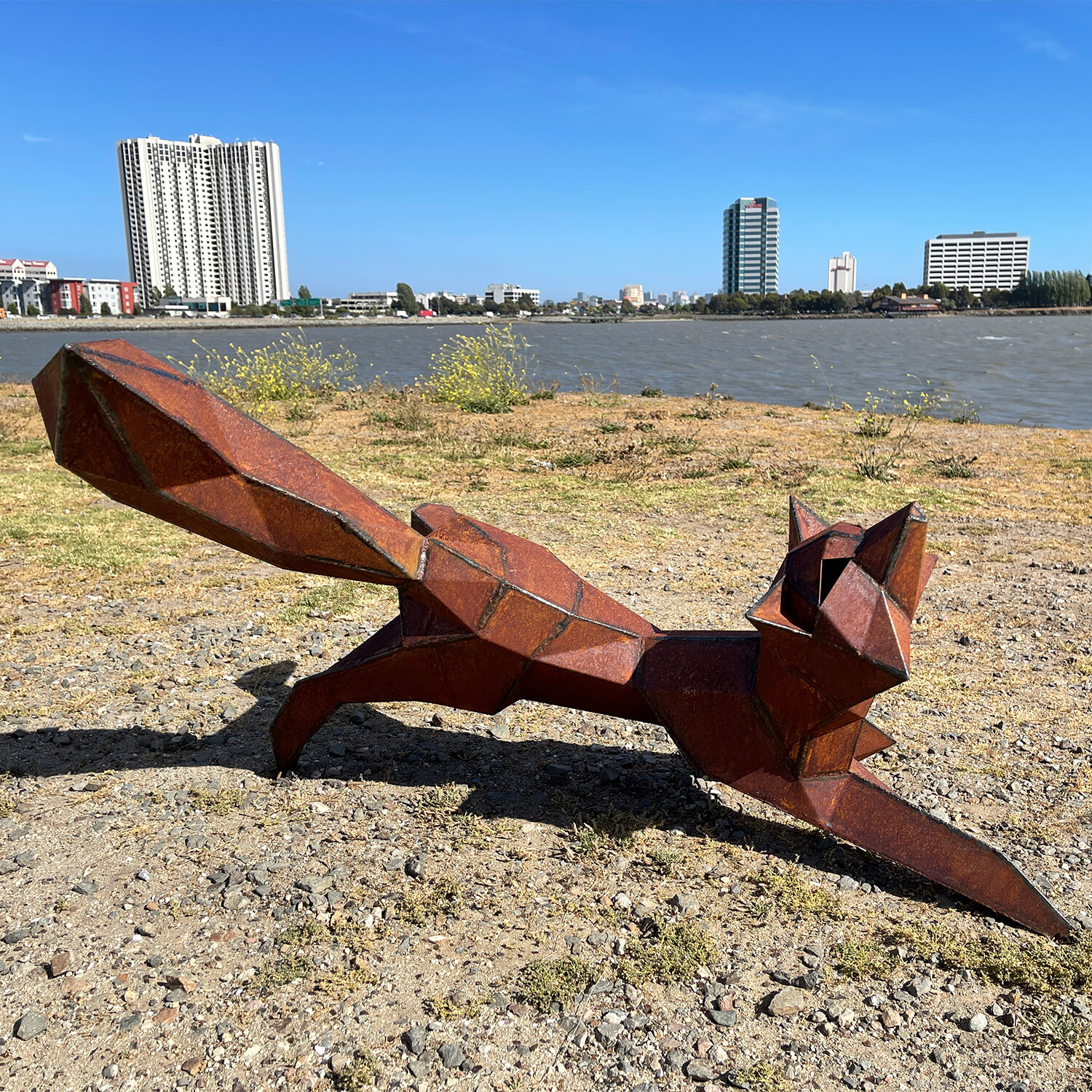 Each unique sculpture is designed and handcrafted in Martin's studio in Oakland, California. They capture the playful energy of their subjects with carefully placed geometric facets. This contemporary geometric fox sculpture adds a playful element to any garden or patio and can be positioned upright or horizontal.