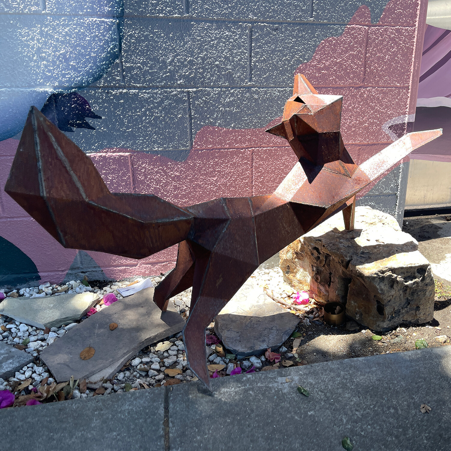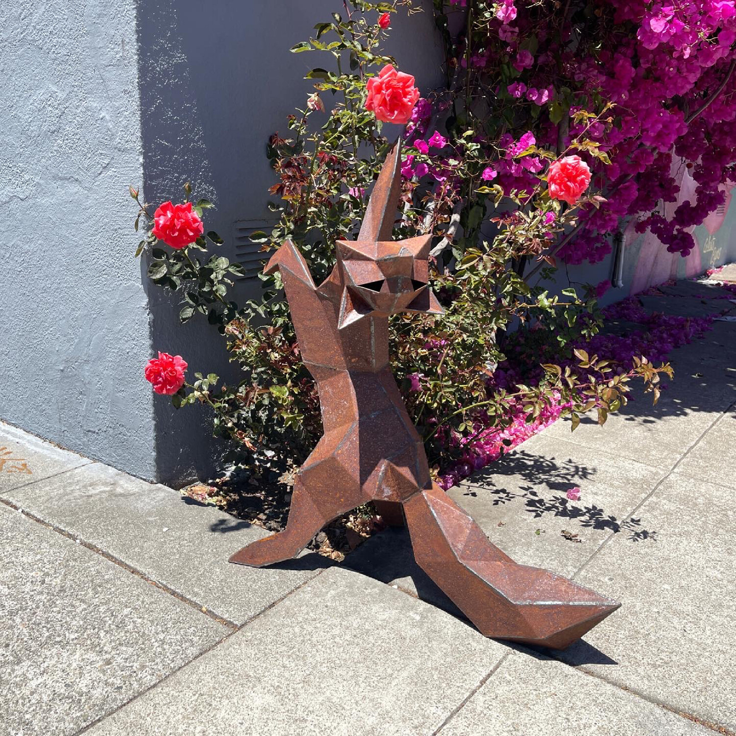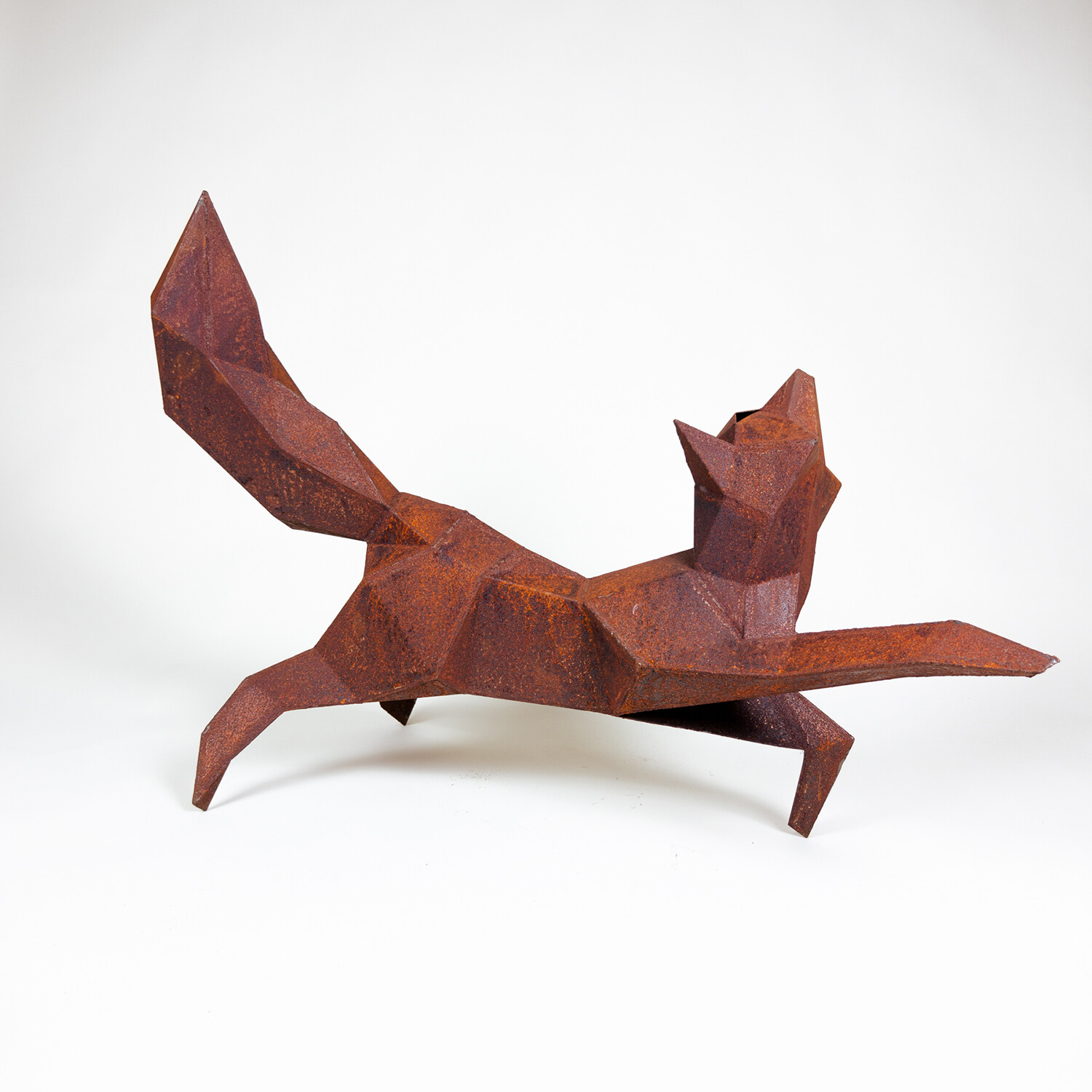 Each unique sculpture is designed and handcrafted in Martin's studio in Oakland, California. They capture the playful energy of their subjects with carefully placed geometric facets. This contemporary geometric fox sculpture adds a playful element to any garden or patio and can be positioned upright or horizontal.