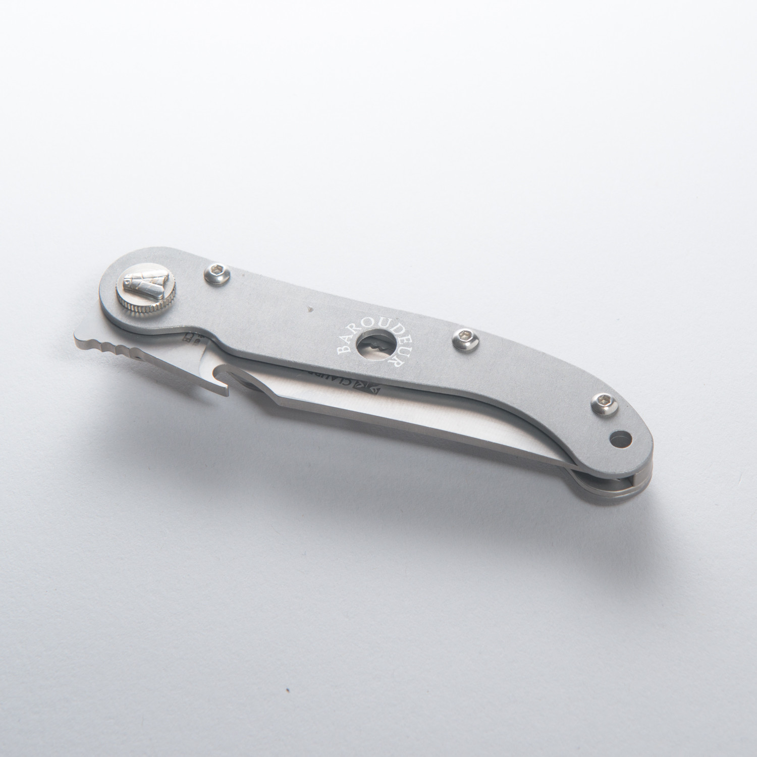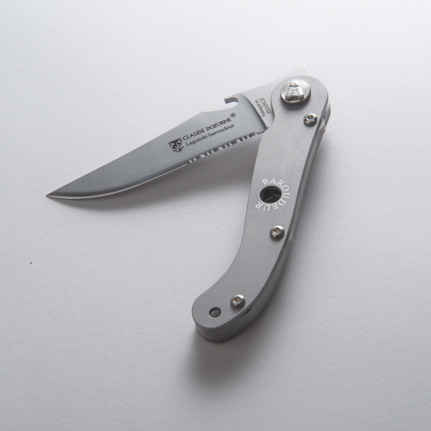 The Laguiole Baroudeur Pocket Knife features a liner lock opening system, a blade with double serration, a bottle opener on the blade, and a hole in the center which can be used as a wire cutter. Made in France, it includes a screw key to retightened the axis and offers easy one-handed opening.