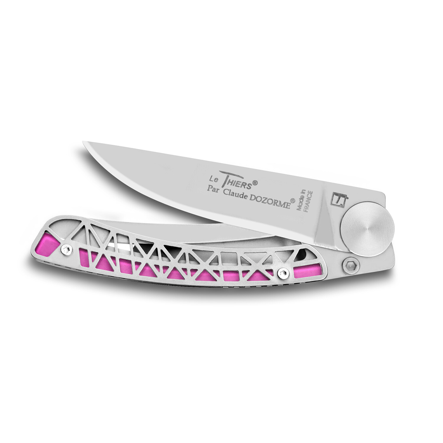 The Thiers Liner Lock Pocket Knife is an ultra-flat and lightweight model with a highly secure liner opening system, and a back clip which can be used as a money clip. Cross-braces affixed on the plexiglas handle are reminiscent of the Eiffel Tower or medieval house timbers.
