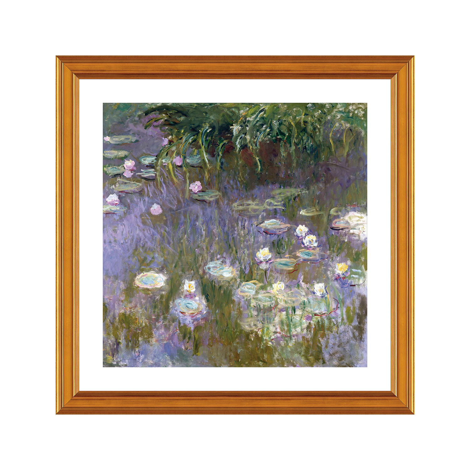 Claude Monet (1840-1926) was the founder and one of the most consistently unwavering practitioners of the French Impressionist movement. He was known for his series of oil paintings, which depicted the same scene— often the French countryside— multiple times from different perspectives in order to capture the changing of light and the passing of the seasons. In 1899, he began painting the water lilies on his estate, first in vertical views with a Japanese bridge as a central feature, and later in a famous series of large-scale paintings that would occupy him continuously for the next 20 years of his life.