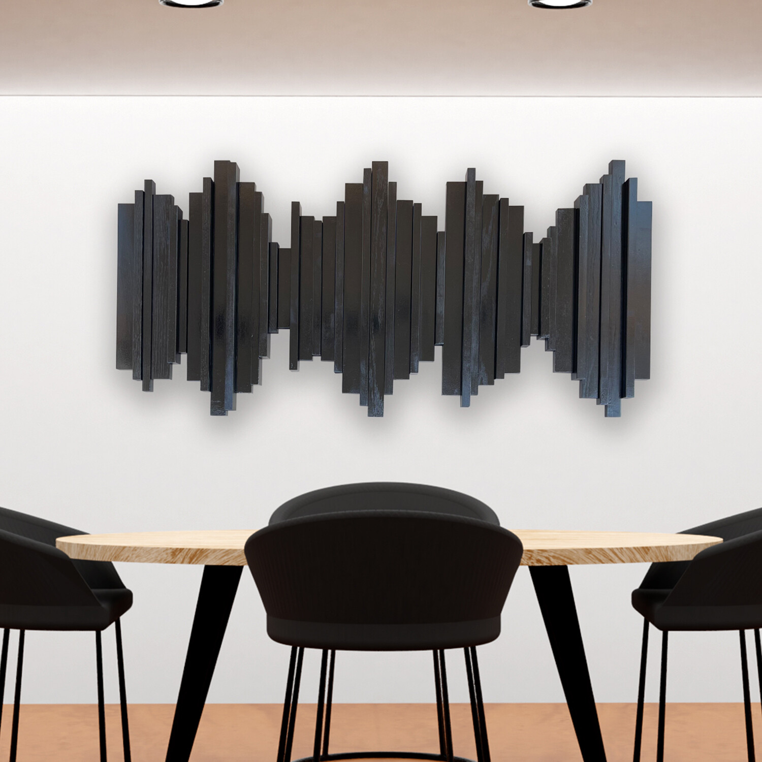 Claudia Moldovan’s art impresses, and then goes beyond to intrigue and initiate conversations. This wall sculpture represents the visual sound wave of the famous Batman quote, “It’s not who you are underneath, it’s what you do that defines you." It is made from a collection of hard and soft woods, bold stains, and vibrant paint, and diligently captures every detail of the audio note. A statement piece for your home or office, the sculpture carries a composure that is modern and yet timeless.