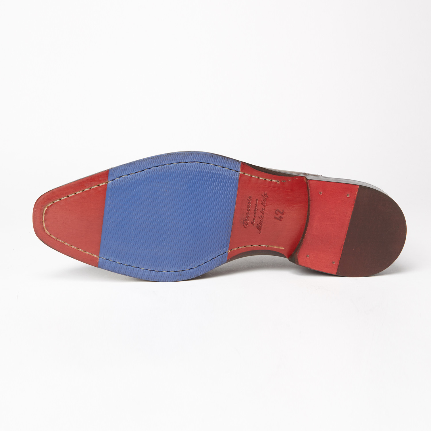 The Leather Lace-Up is a perfect dress shoe to pair with navy and camel suits. Handmade in Italy, this custom finished shoe features a medallion toe, a hessian welt, and a Bulcher-style lace-up closure.