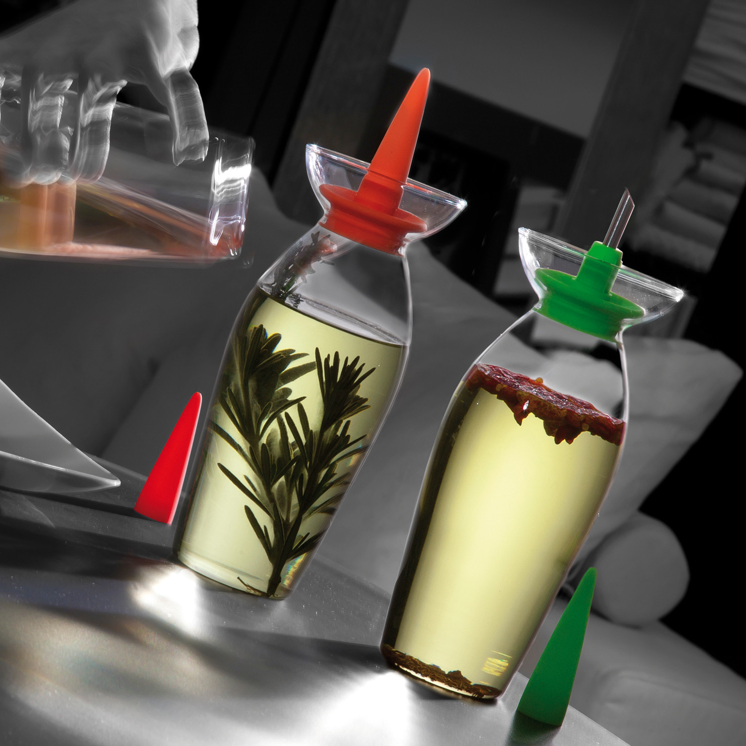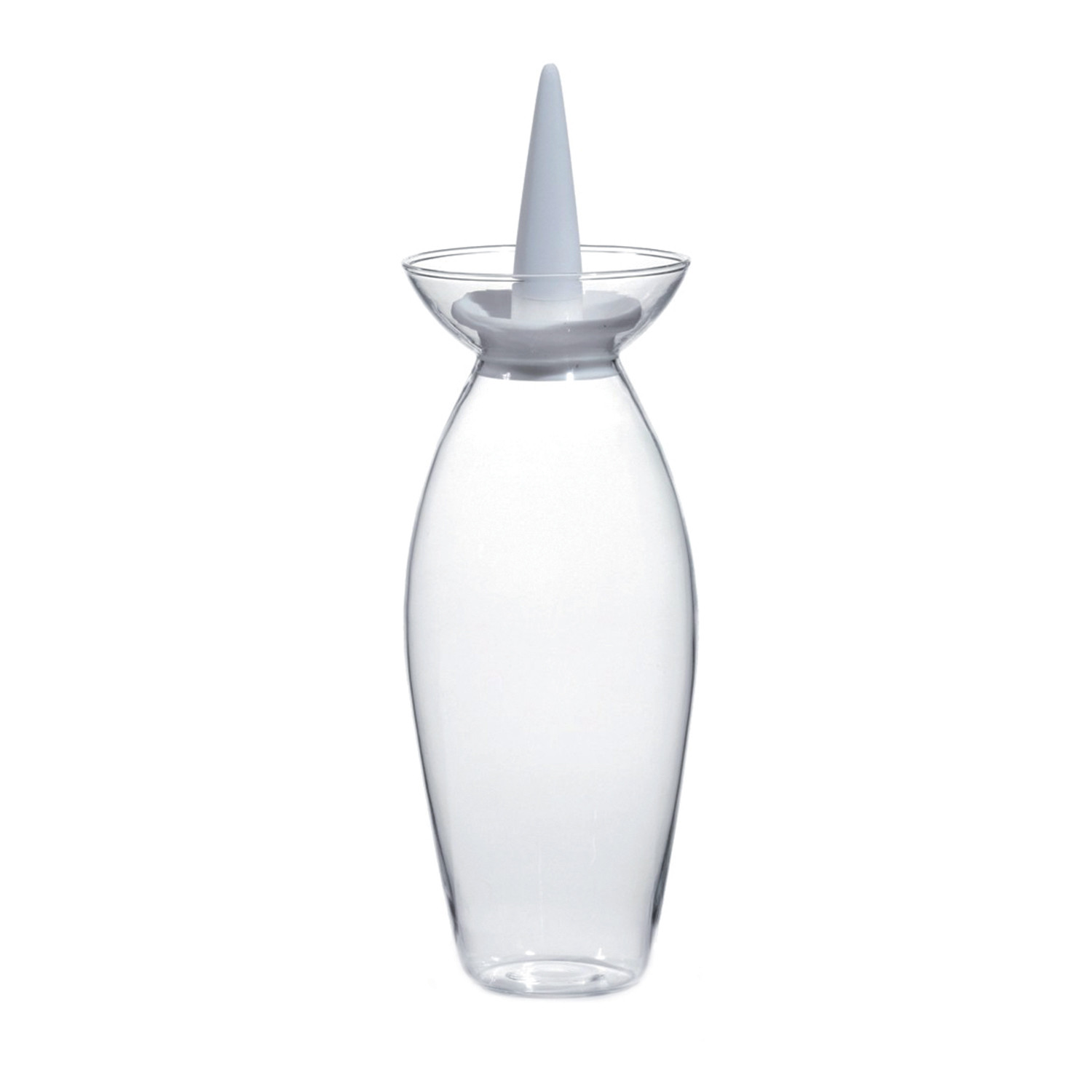 The Olea Glass Oil Cruet is made of fine blown glass, with a food-grade stainless steel spout and a silicone tip for aesthetic contrast, and peak functionality.
