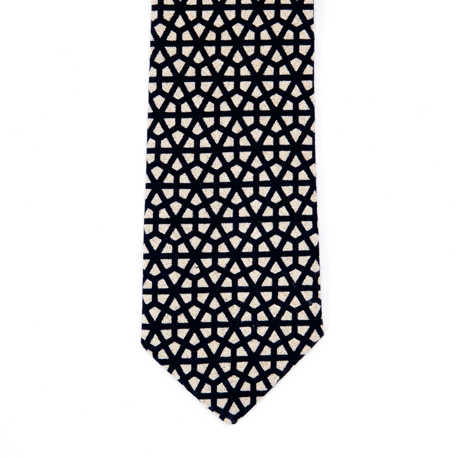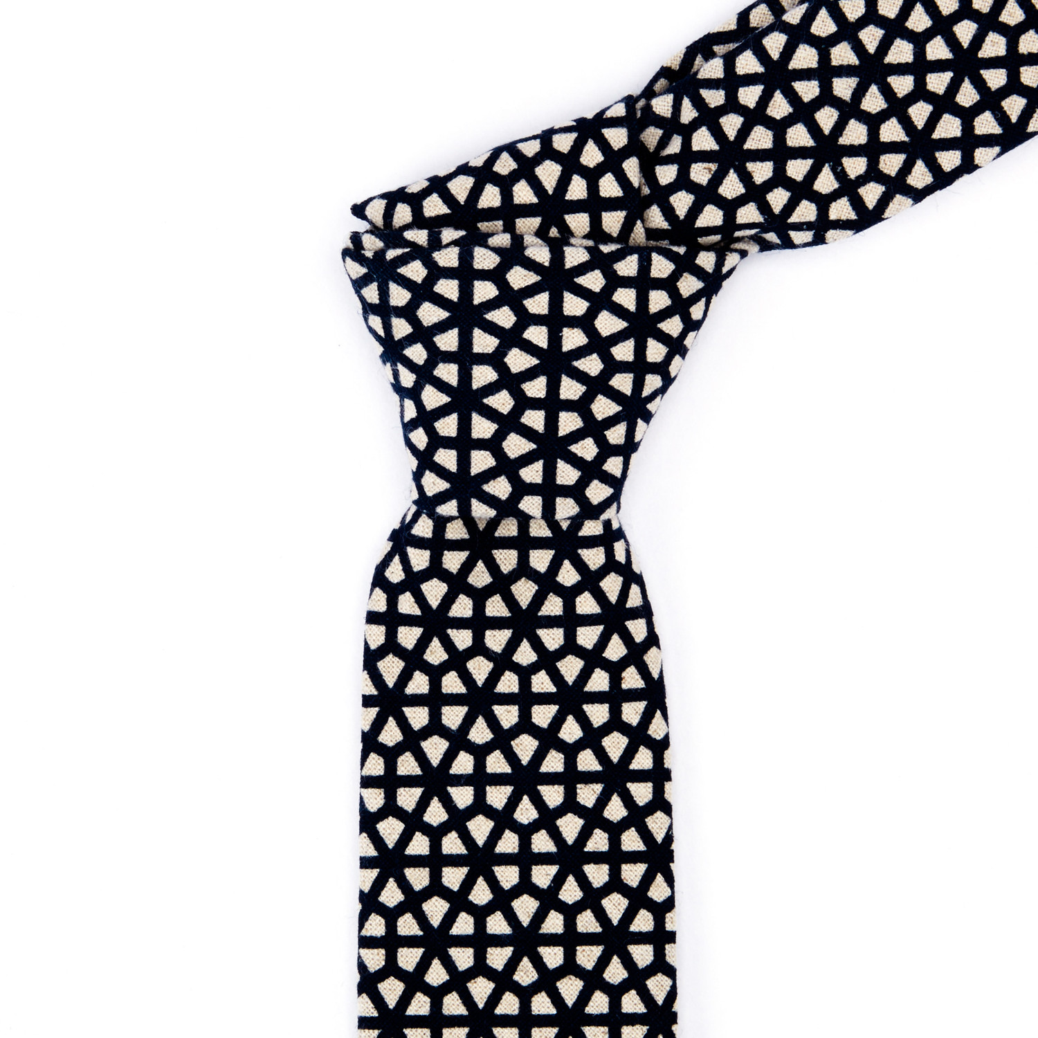 This navy and sand lattice print skinny tie is a statement-maker that's shockingly versatile. Made from a linen cotton blend, the Mr.Tambourine Man tie features contrasting navy and white stripe lining and loop.