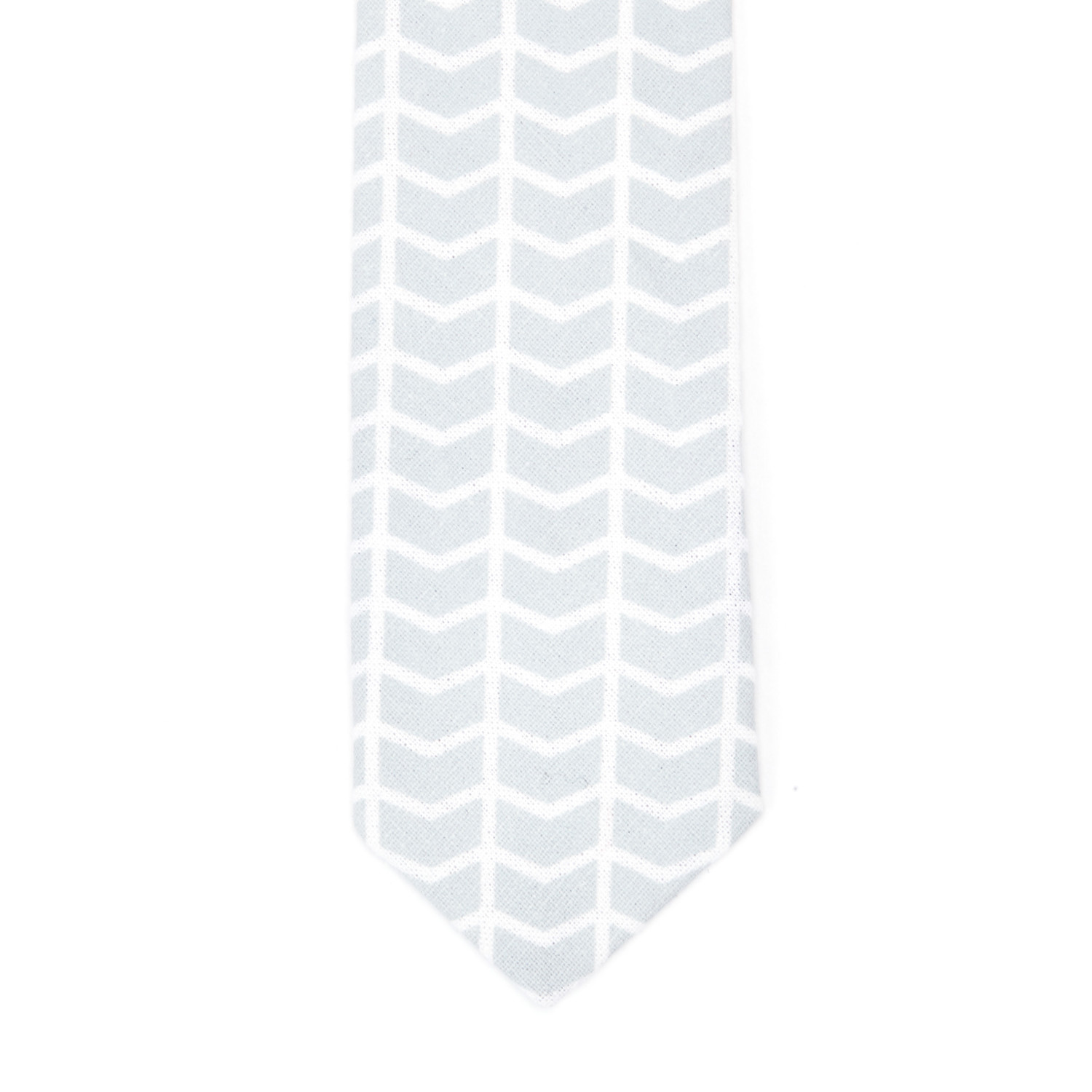 This grey and white herringbone print skinny tie is a versatile neckwear option for the Spring. Made from a linen cotton blend, the Stairway to Heaven tie features contrasting navy and white stripe lining and loop.