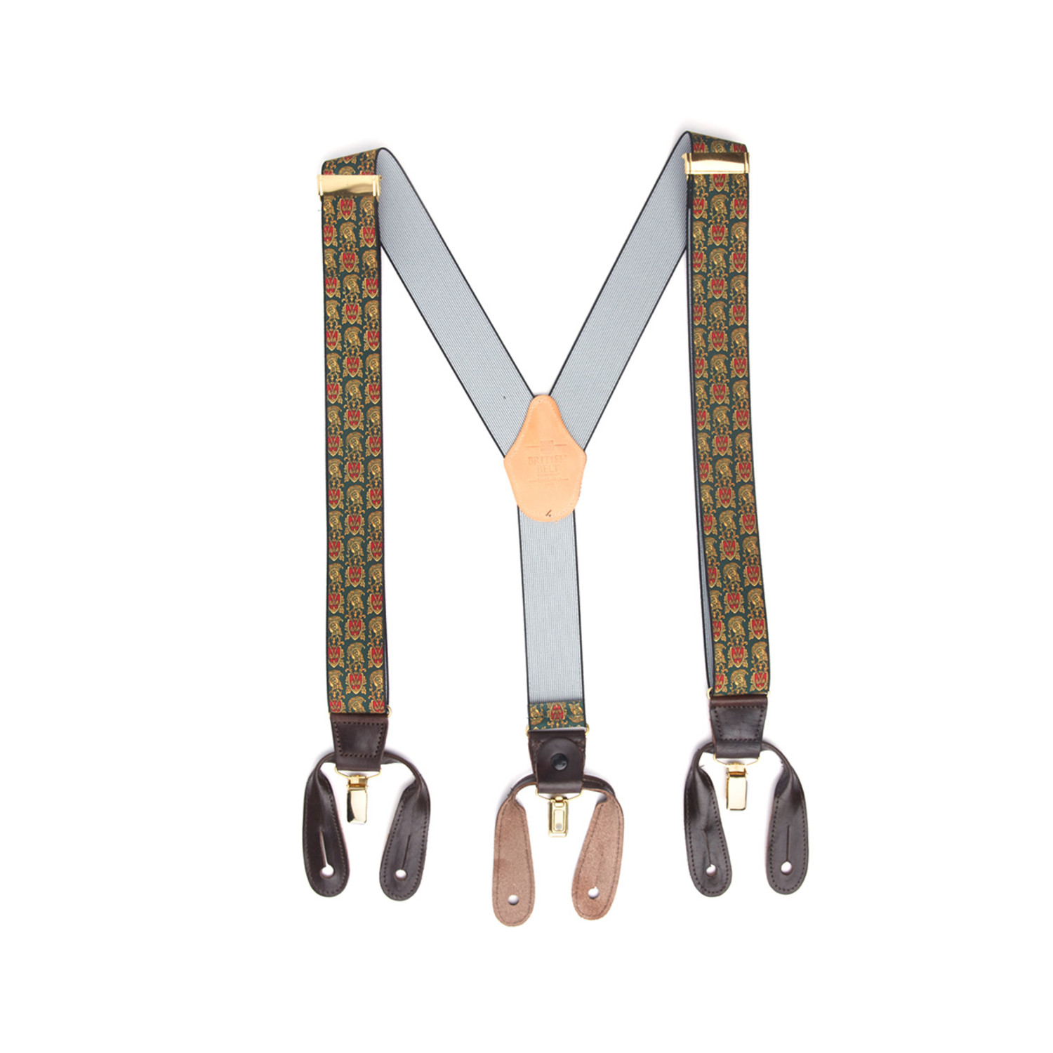 The British Belt Company's Tate Suspender in Green is produced using the best European woven elastics and leather ends. Each brace has an interchangeable metal clip and leather fastening. It's the perfect accessory for sartorial elegance, with the Tate collection distinguished by its heraldic print.