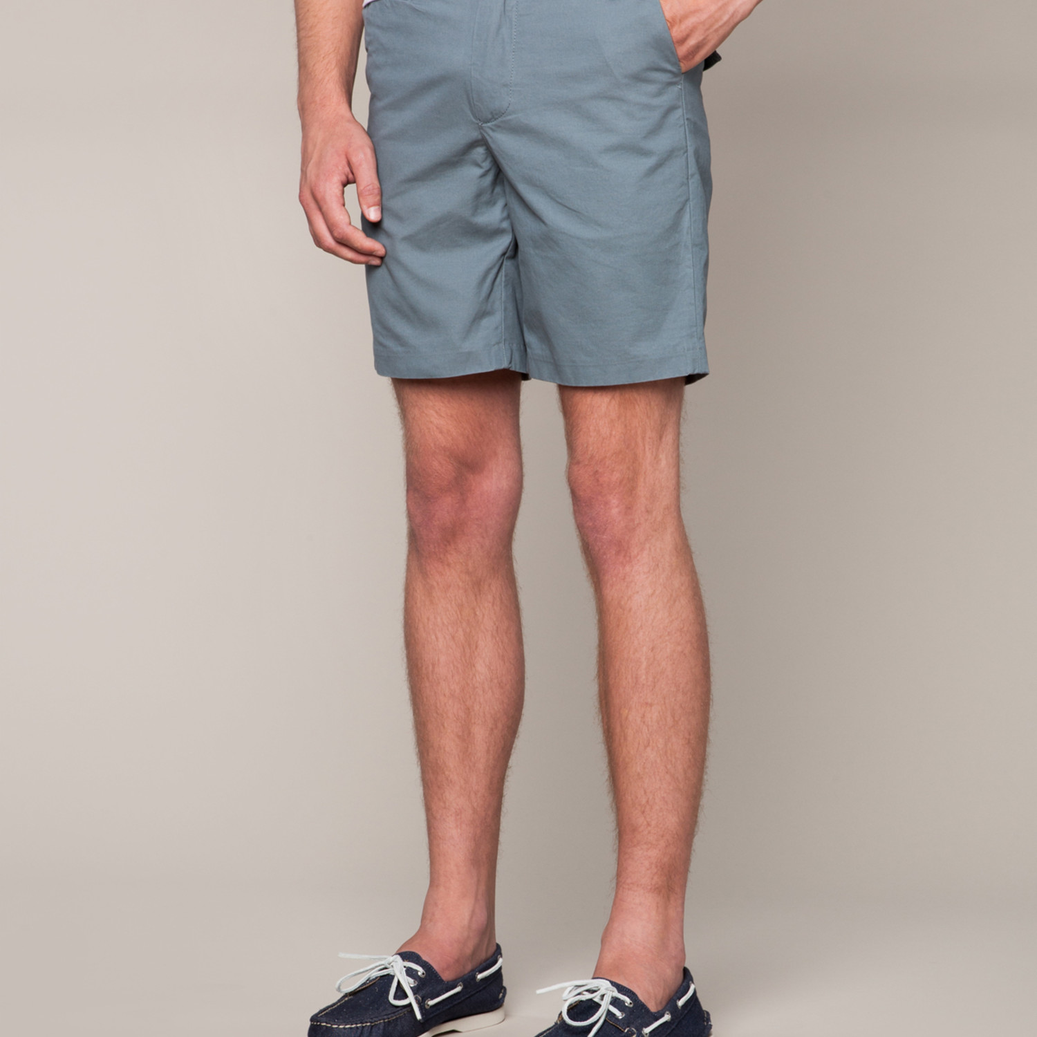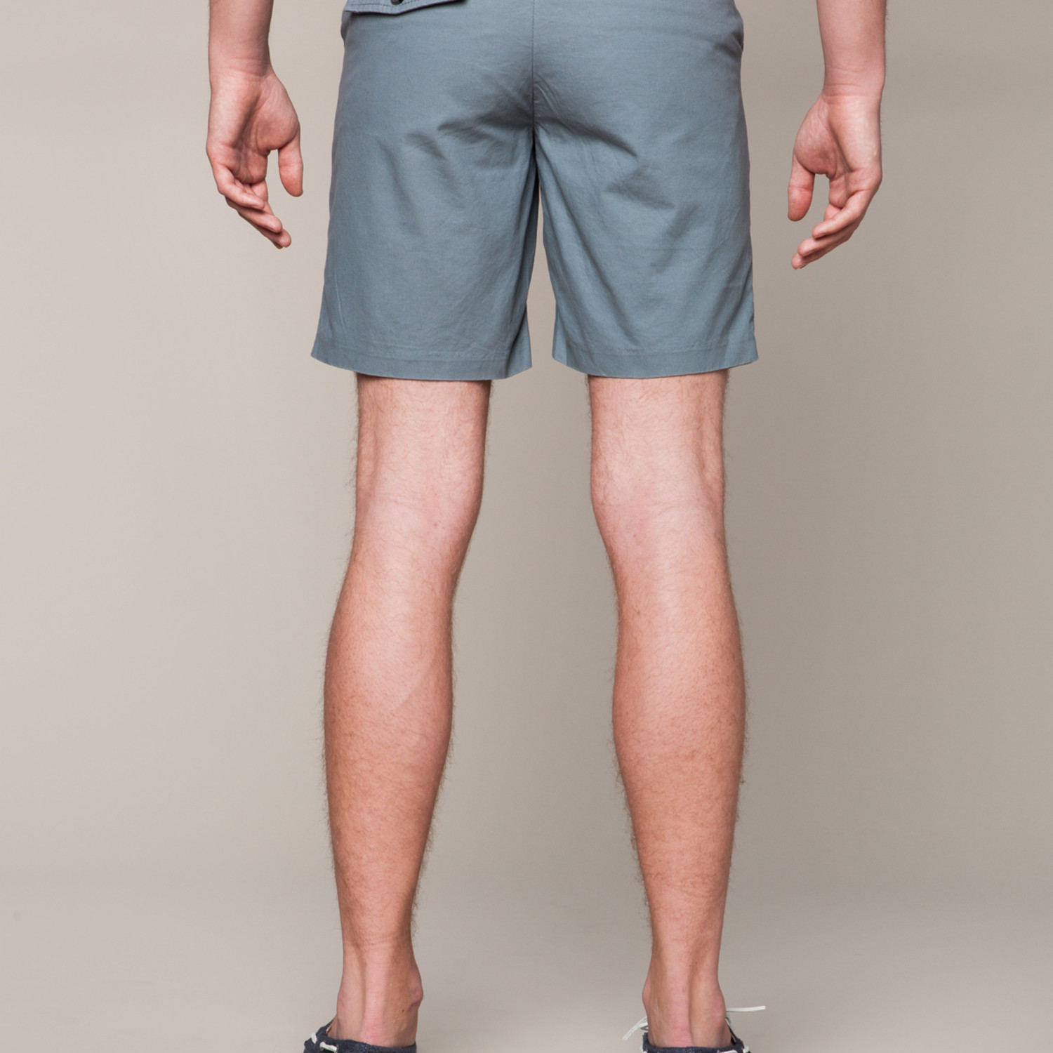 This is a Slate Tailored Chino Short, sewn with a minimal amount of top stitching. The construction is very clean with binded seam edges on the inside of a little more then 8". A high quality garment, it's a clean example of the Williamsburg Garment Company look. There are no logos, labels, patches, or rear pocket stitching to take away from the clean basic look of these pants.