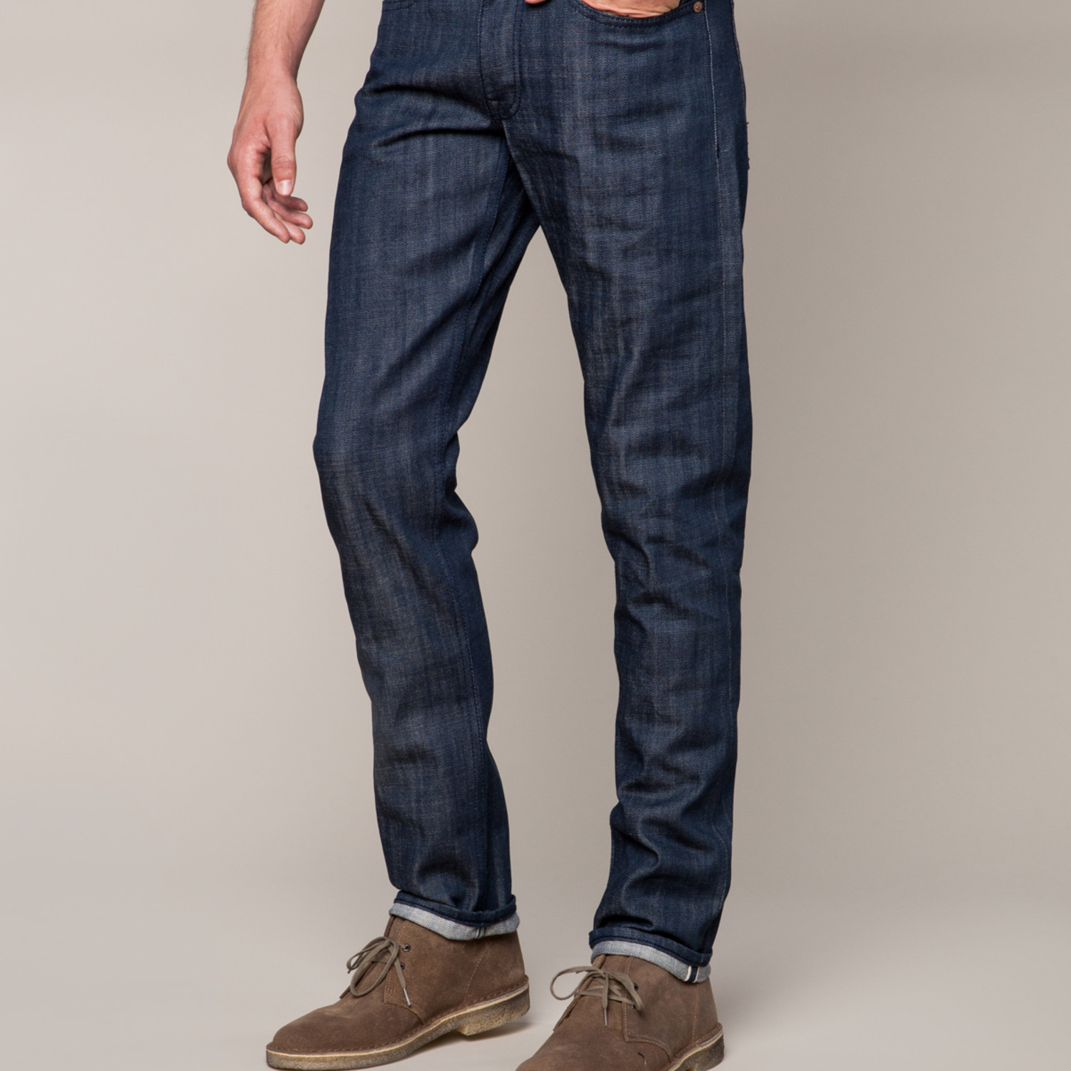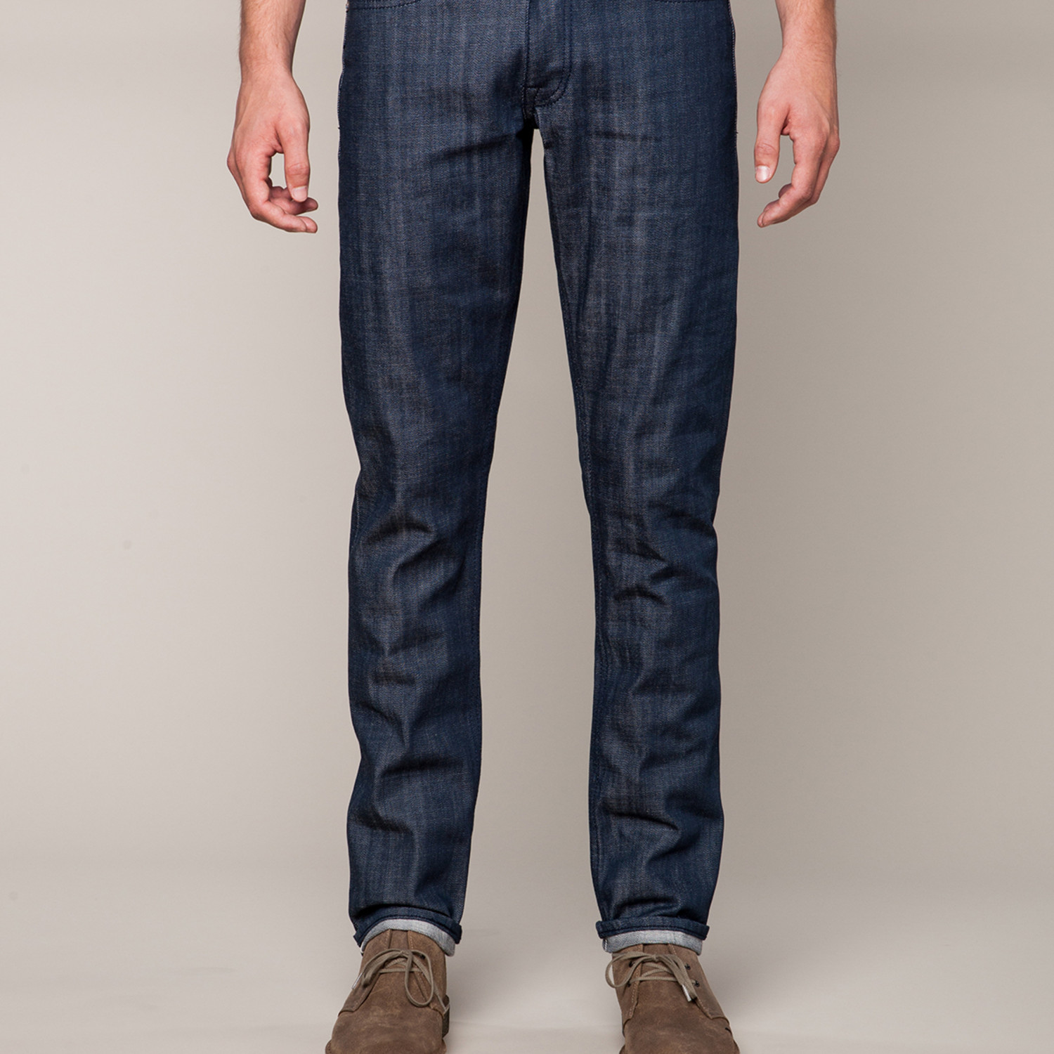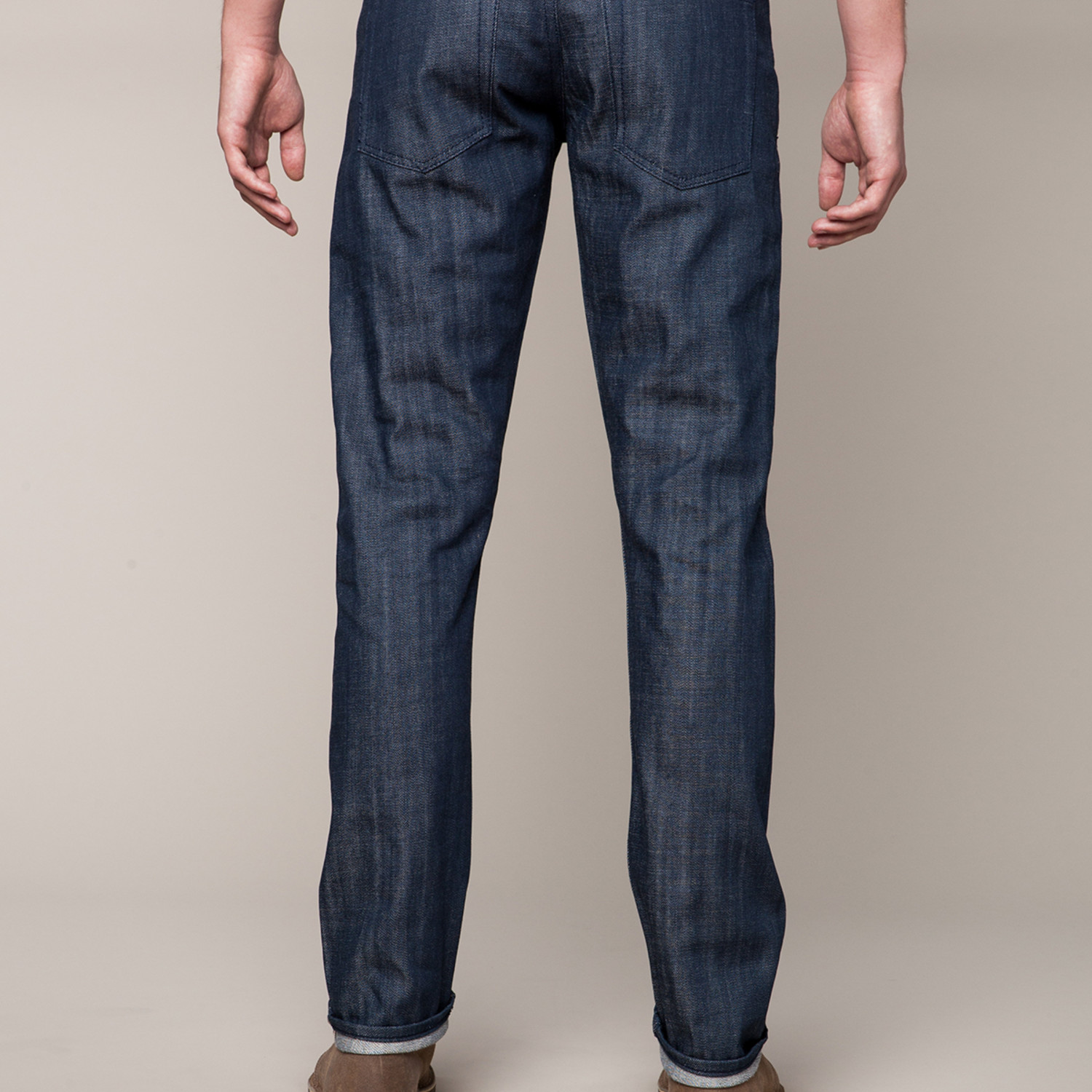 Raw denim feels stiff and unyielding at first, but will soften with time and wear. Those in the know suggest sizing down and washing very infrequently. That will allow the denim to conform to your shape and take on the personal wear lines and fading unique to you. A high quality garment, it's a clean example of the Williamsburg Garment Company look. There are no logos, labels, patches, or rear pocket stitching to take away from the clean basic look of these pants.