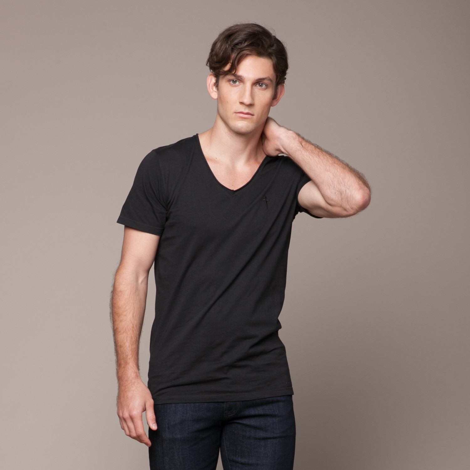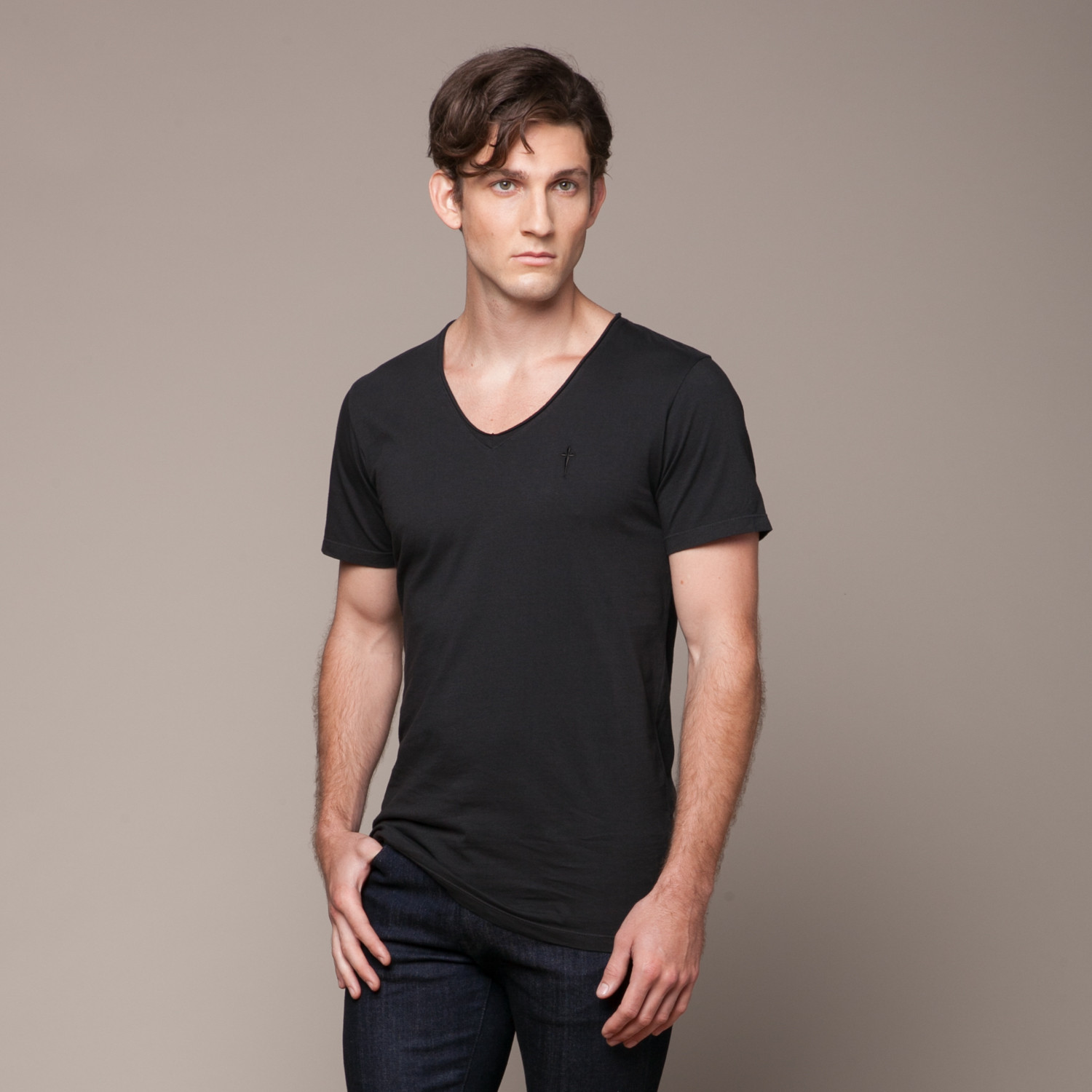 The HudsonV Tee differs from most v-necks in its juxtaposition of a visible raw hem under a classic crewneck collar. The resulting "layering" effect will have people looking at your shirt again and again. Give it a street style twist by pairing it architectural black clothes.