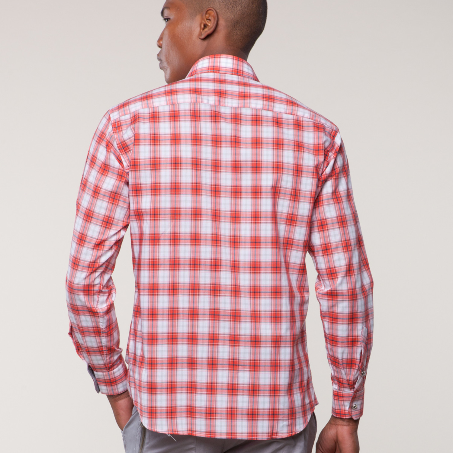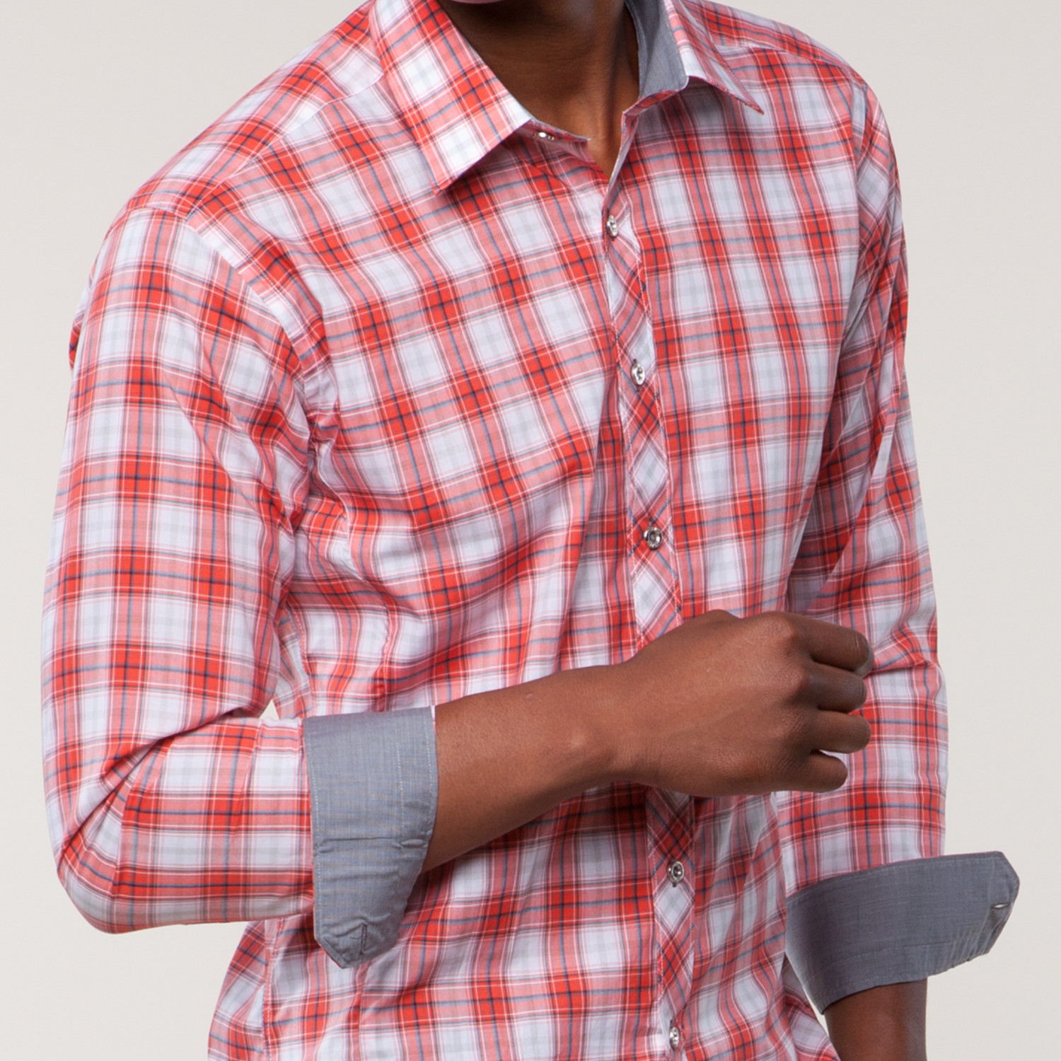 This semi-fitted long sleeve plaid button down features contrast button stitching and eye-catching solid trimming inside of the collar, cuffs, and along the button column. It pairs well with jeans or slim-fit grey or blue khakis for a clean, summery aesthetic.