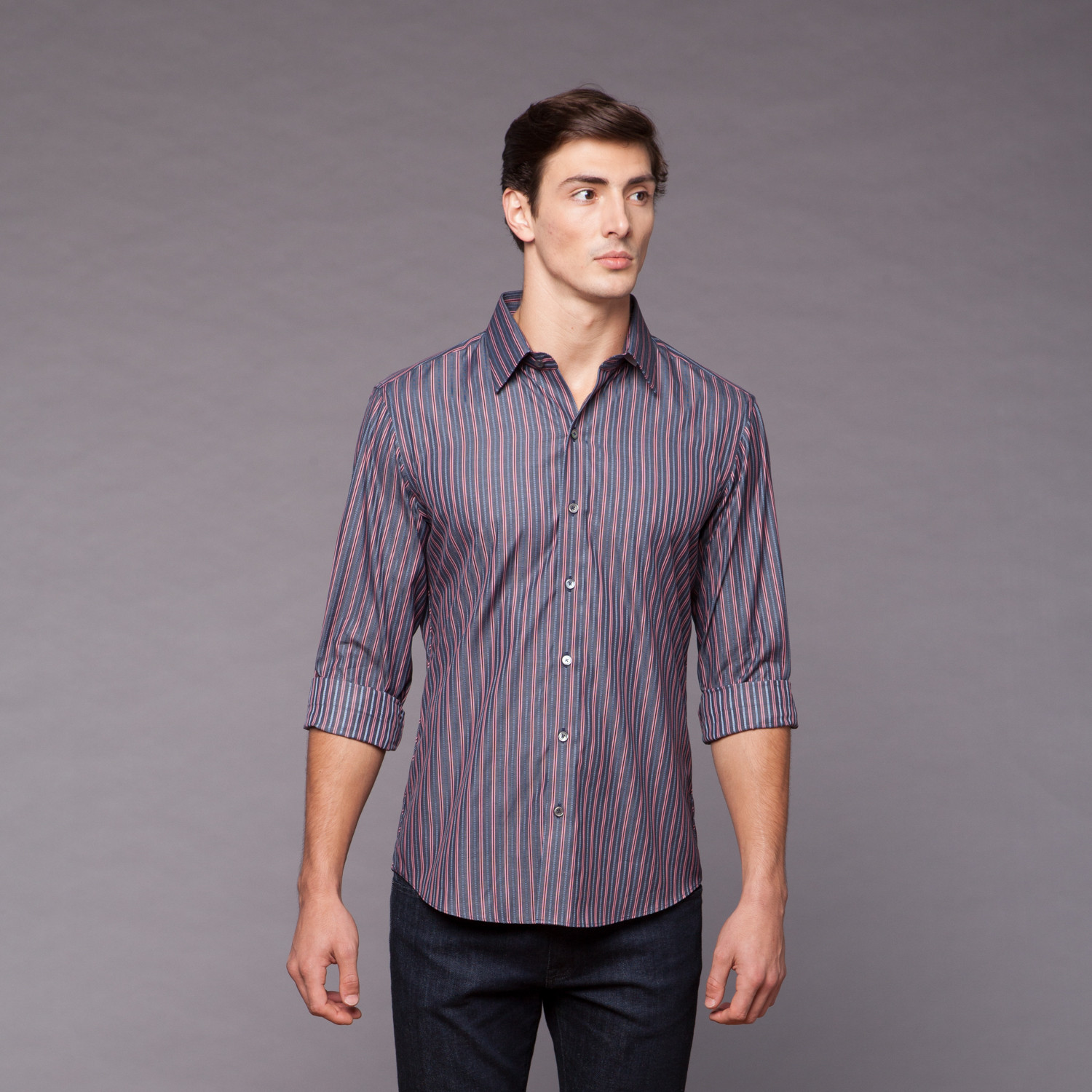 This Maddox Shirt by Zachary Prell features long sleeves, a double barrel cuff, signature sleeve-placket stitching, and a charcoal, wine and pink stripe. Incredibly well made, with a perfect fit, its point collar makes it super versatile.