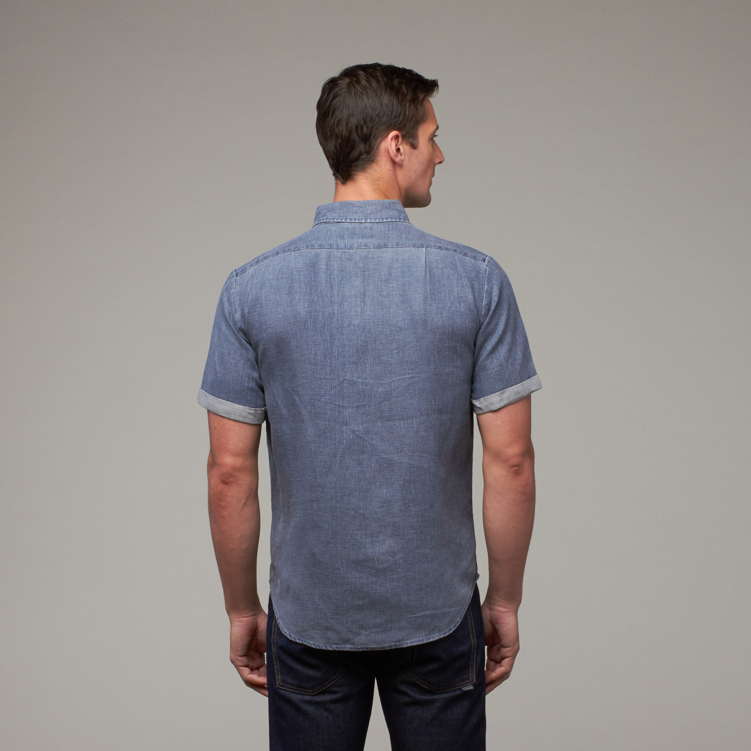 The simple yet stylish rolled sleeve button down linen shirt is designed in a light denim-colored hue with contrasting dark buttons. Wear this shirt with slim-fit black denim for a put-together summer look.