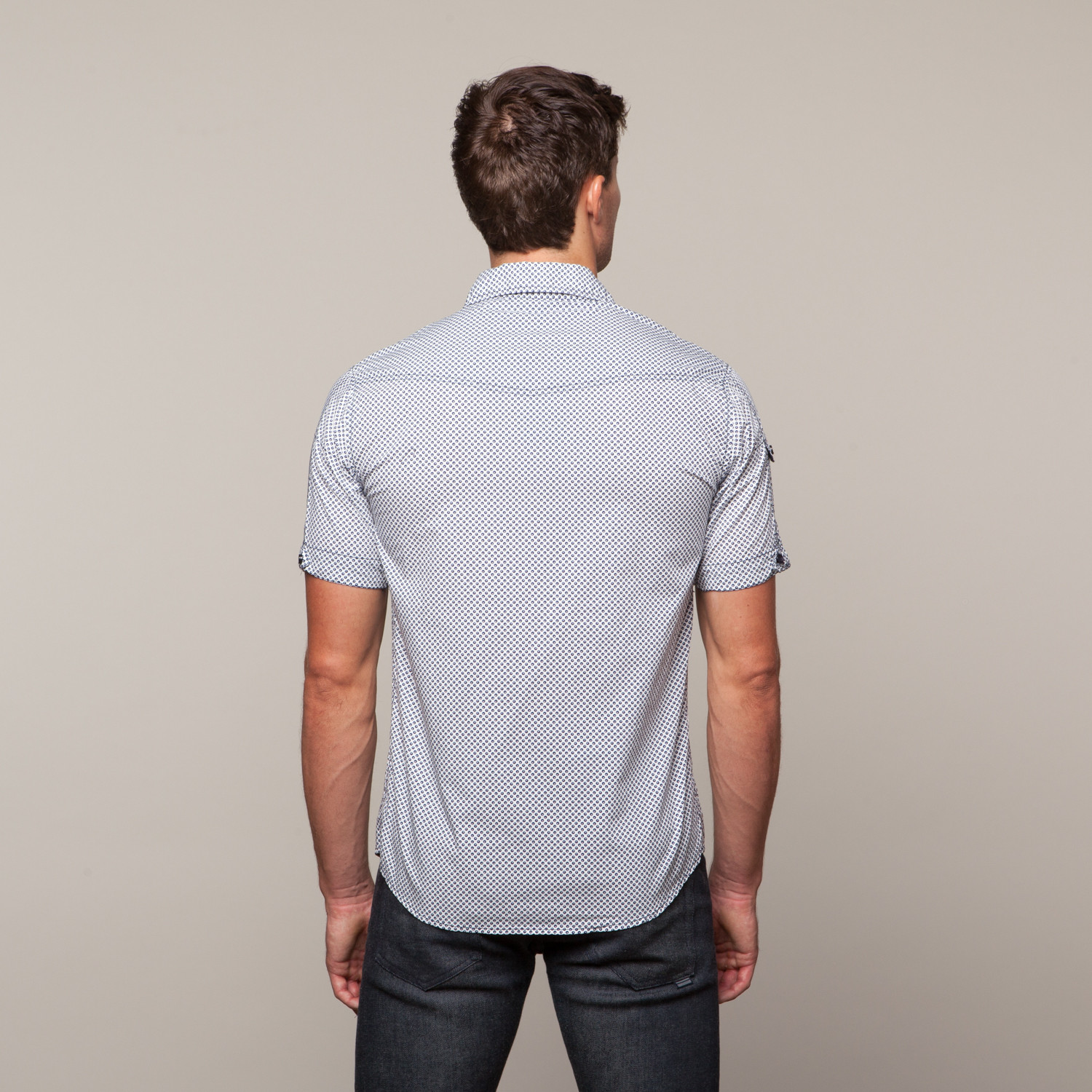This Navy Dot Short-Sleeve Button Up finds the perfect balance between racer-cool and laid-back fashionable. With a contrast inner placket in Navy, it's as flattering as it is versatile.