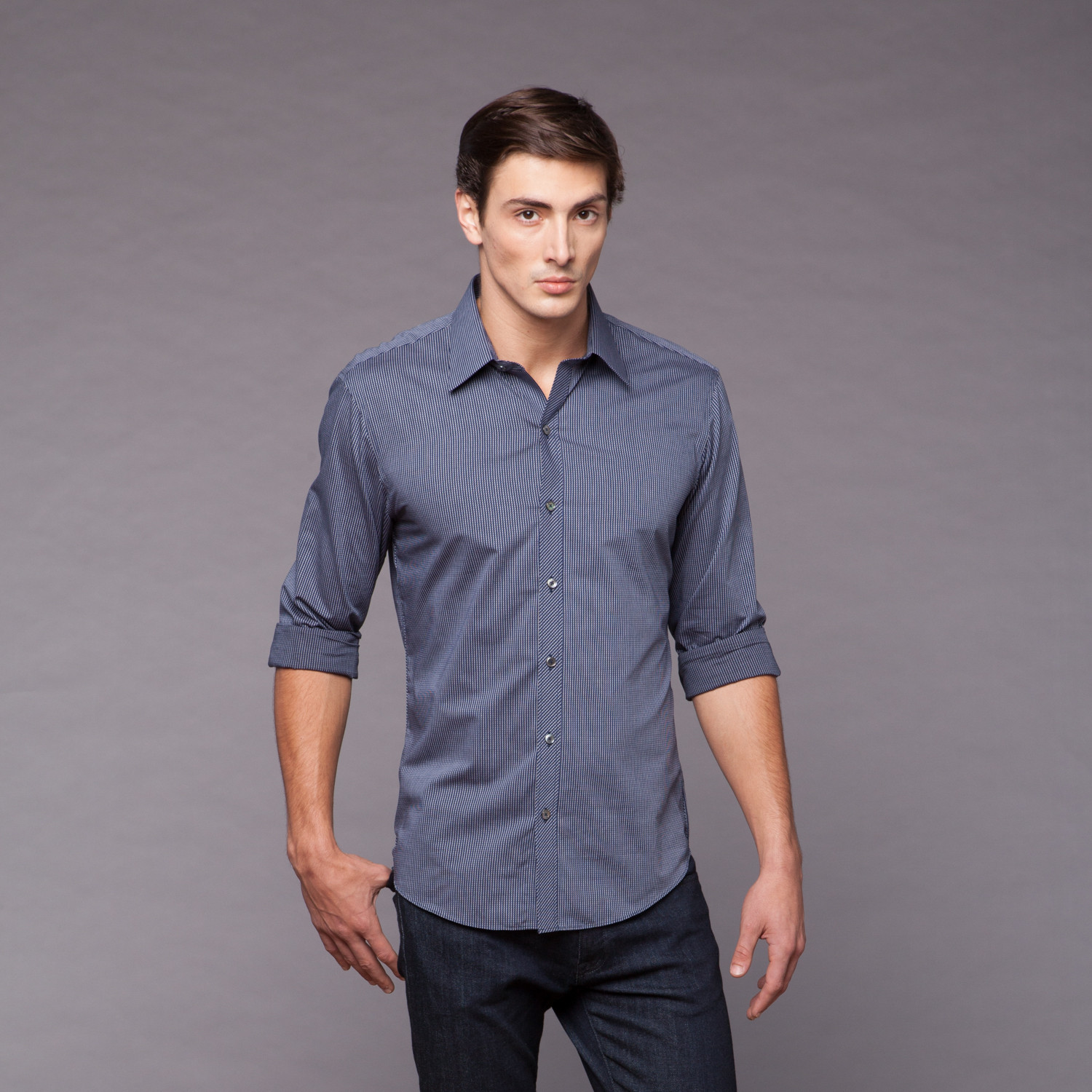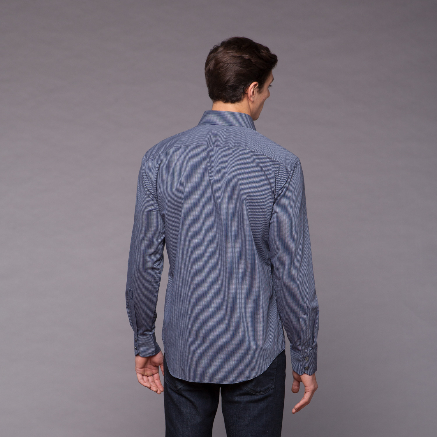 This Stephen Shirt by Zachary Prell features long sleeves, a double barrel cuff, signature sleeve-placket stitching, and a navy and white jacquard. Incredibly well made, with a perfect fit, its point collar makes it super versatile.