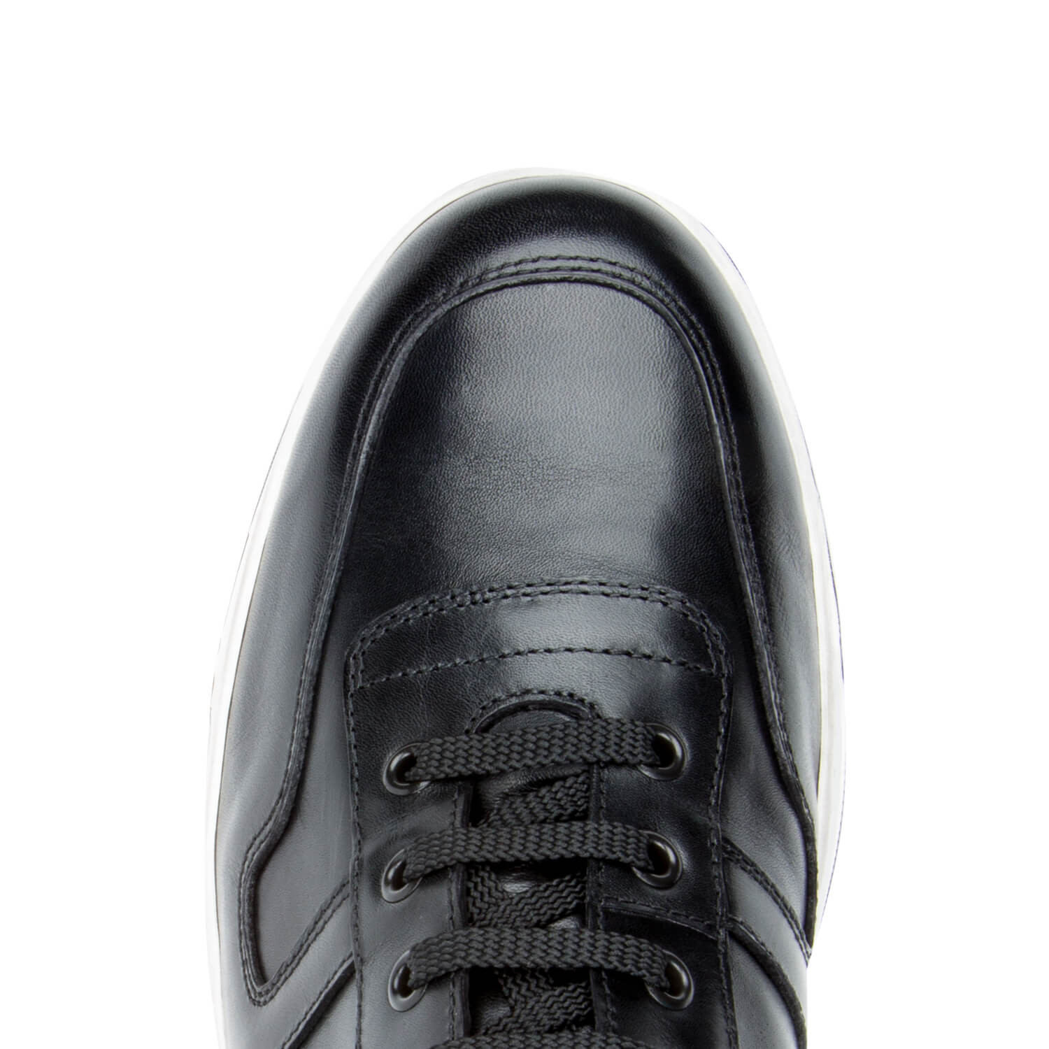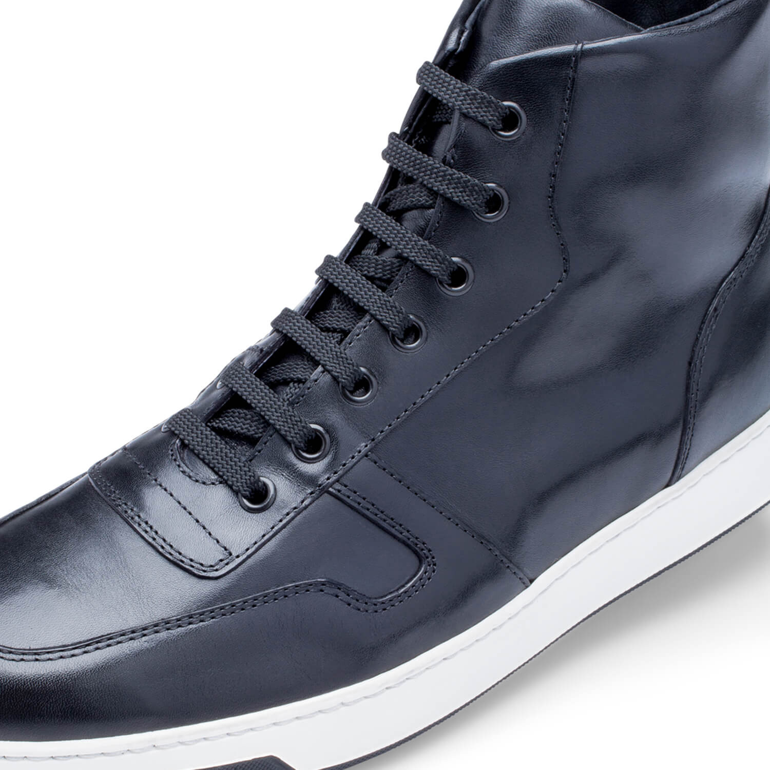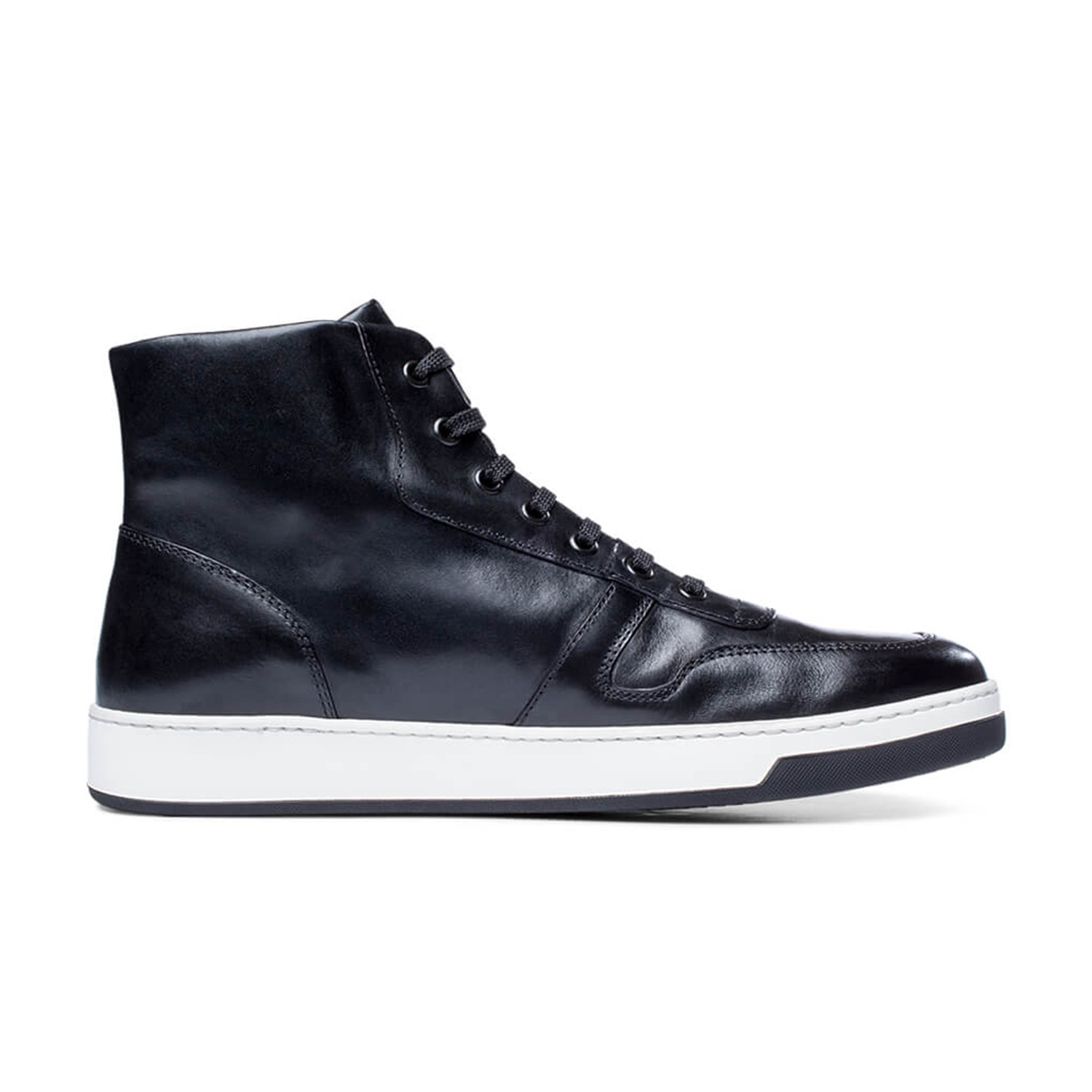 Sporty and street smart high top sneaker in smooth napa leather with a black tipped white sole. Hand crafted in Italy.
