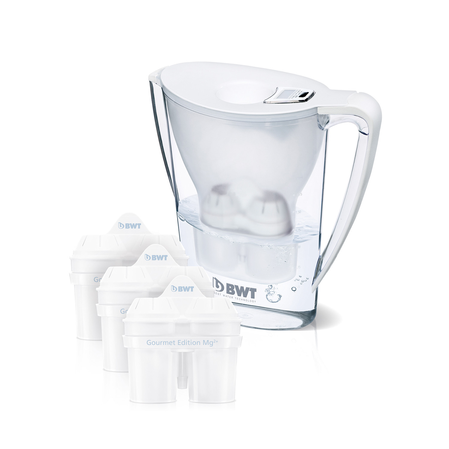 The innovative BWT Magnesium Mineralizer filter cartridges form the ‘core’ of BWT’s table water filter range and are exceptionally long-lasting. A single cartridge filters around 20 more litres than conventional systems, i.e. roughly 120 litres (with water hardness of 15–17.8° dH). This means 120 bottles of water you don’t have to carry around or 120 fewer plastic bottles to dispose of — and this kit includes four times that. Infusing water with magnesium adds health benefits for our cardiovascular system, maintaining our mental performance and for supplying our muscles with energy. Magnesium also aids our immune defense and is important for our nervous system, for reducing stress and ensuring a restful sleep.