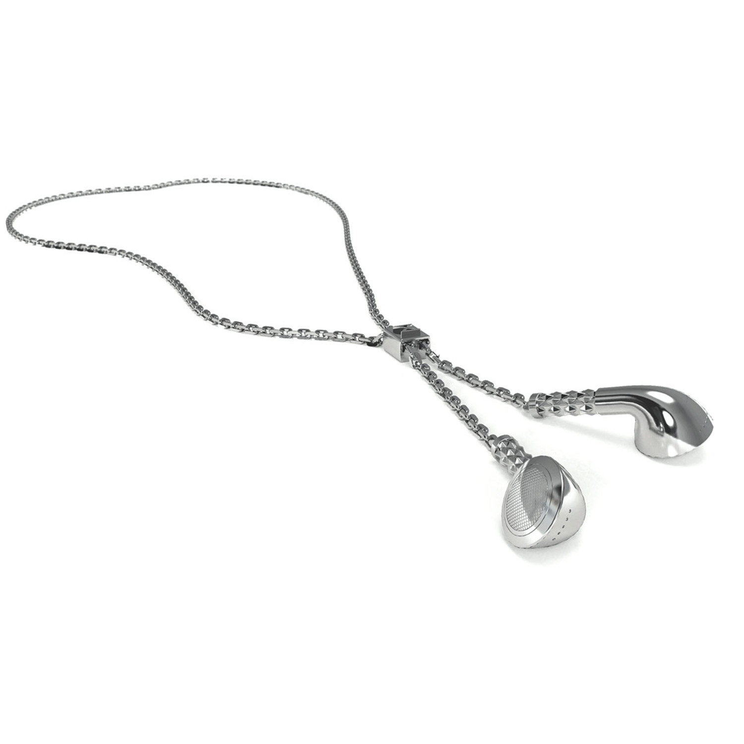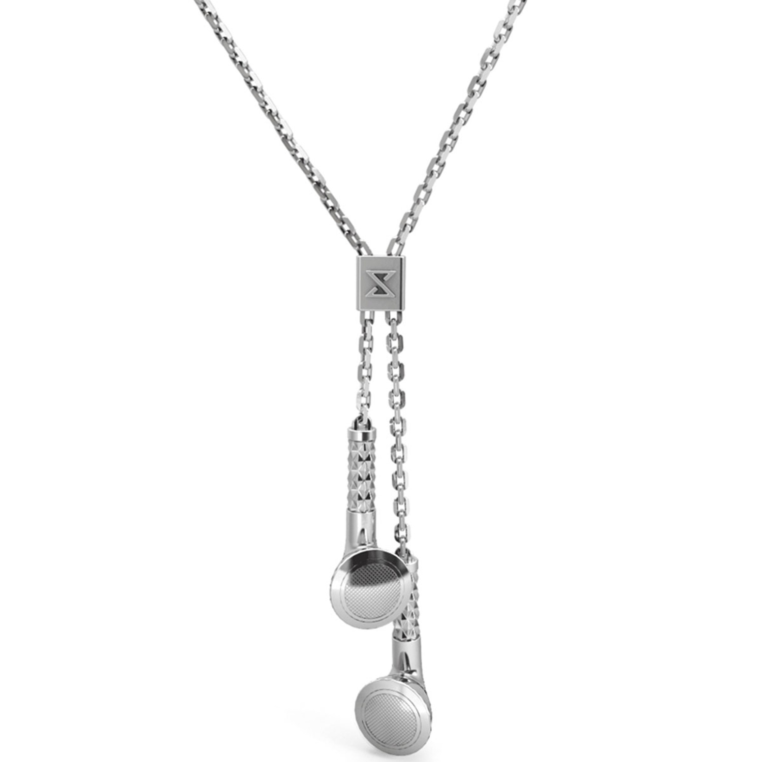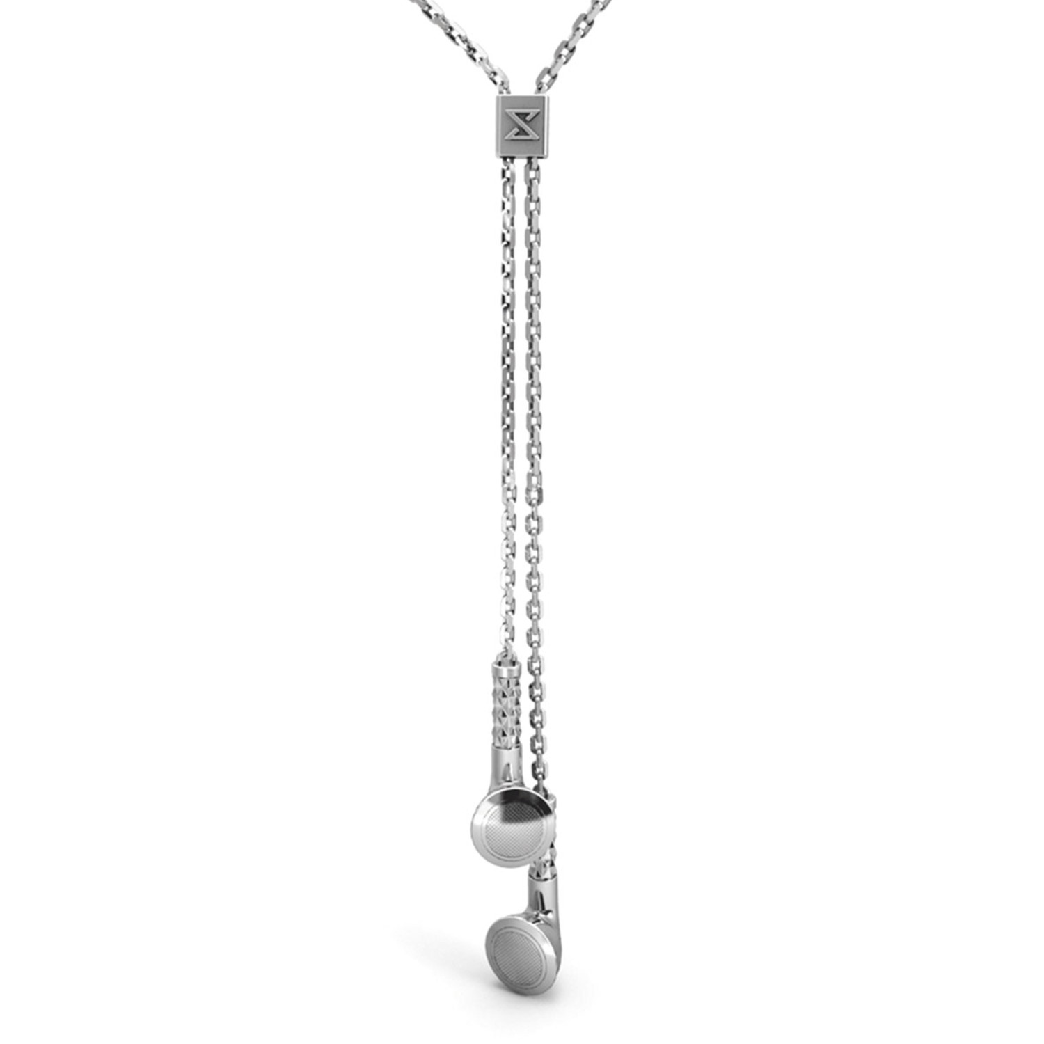 Cast from 35g of solid .925 sterling silver, this subversive, audiophile-inspired Earbud Necklace is handcrafted with the finest detail. The 3mm x 30" sterling silver chain is diamond cut with precision cutting tools to create a pattern of fine, sharp flat cuts across each chain link so that each element of the chain catches light. The necklace features a sliding bolo with a push button to adjust and hold the chain securely in place.