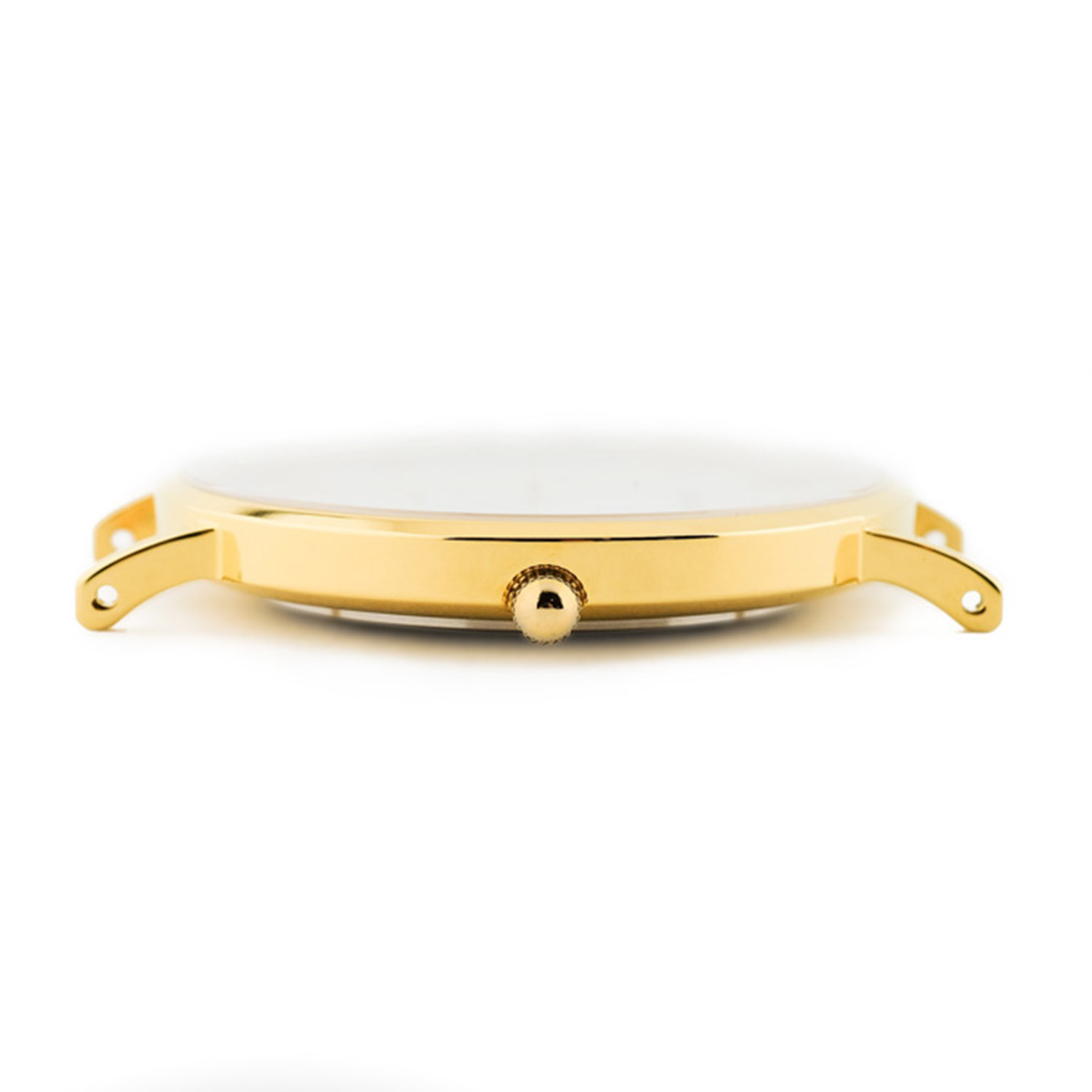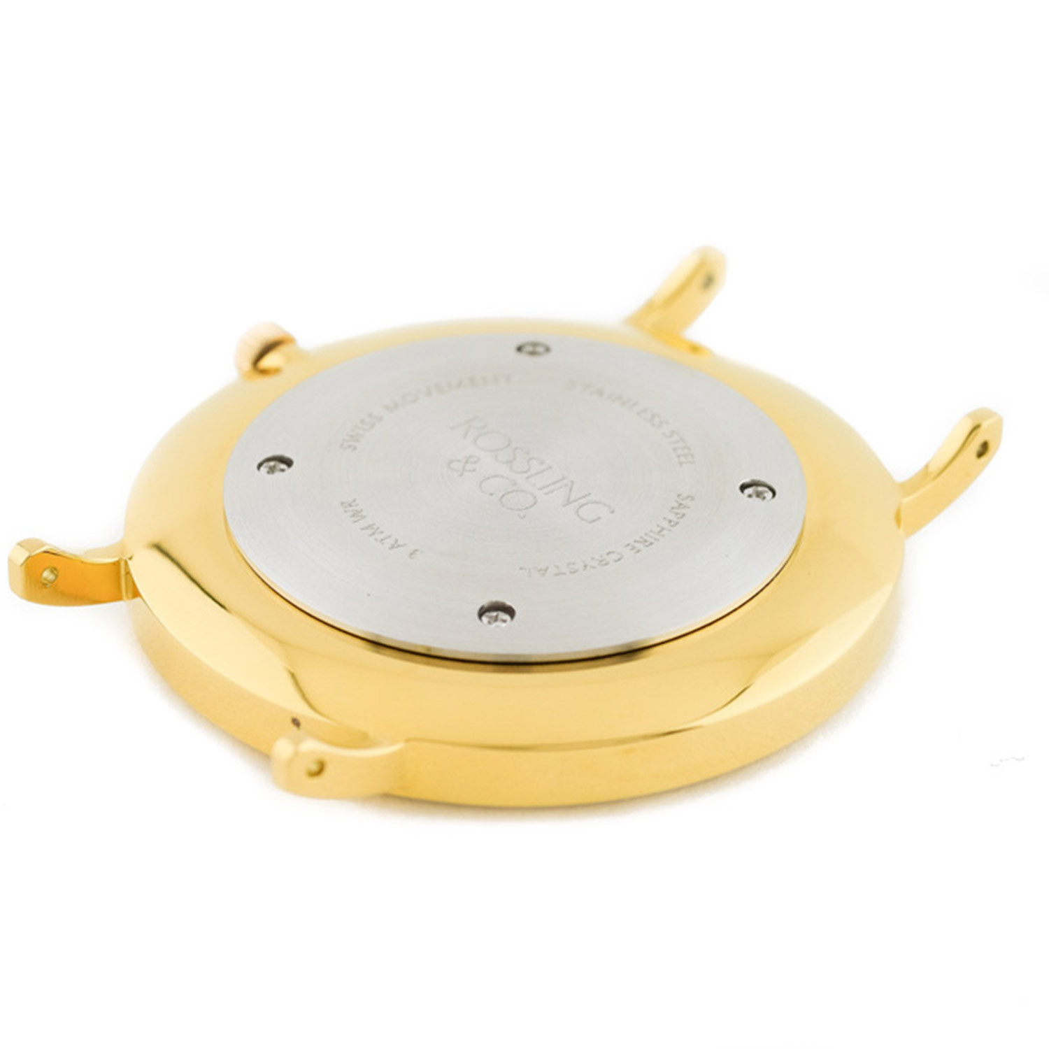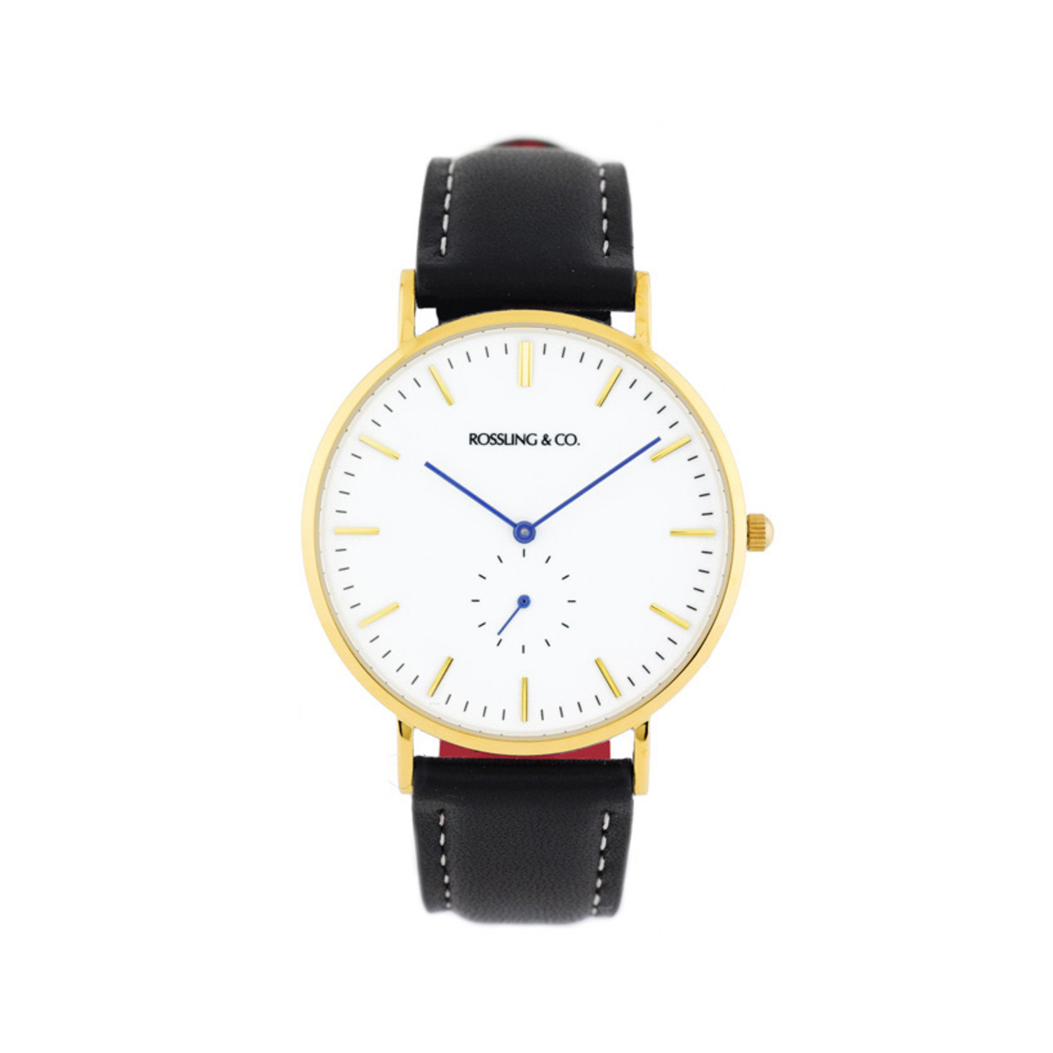 This classic ultra-thin quartz watch features the signature Rossling & Co's blue hands. A gold case with a white dial light up your choice of colored strap. This classic can be dressed up or down for formal or casual settings. It's truly a minimalist contemporary interpretation of a timeless design.