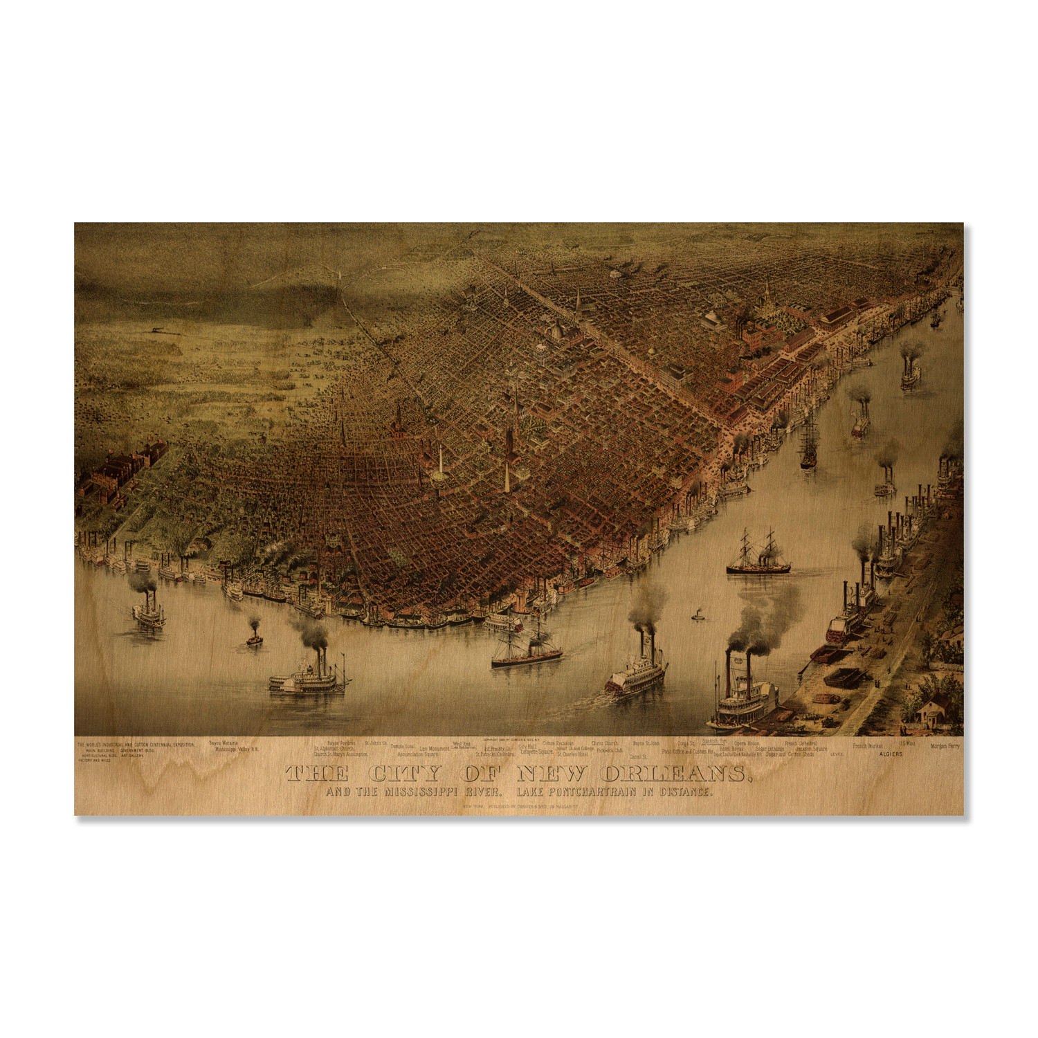 This physical map of New Orleans circa 1885 will imbue your home with the warmth and rich history of a fine antique. Printed directly on thick birchwood — whose grain is left in full to add texture and character — this piece is made with everlasting UV-curable ink so no matter where you live, it will make a timeless statement.