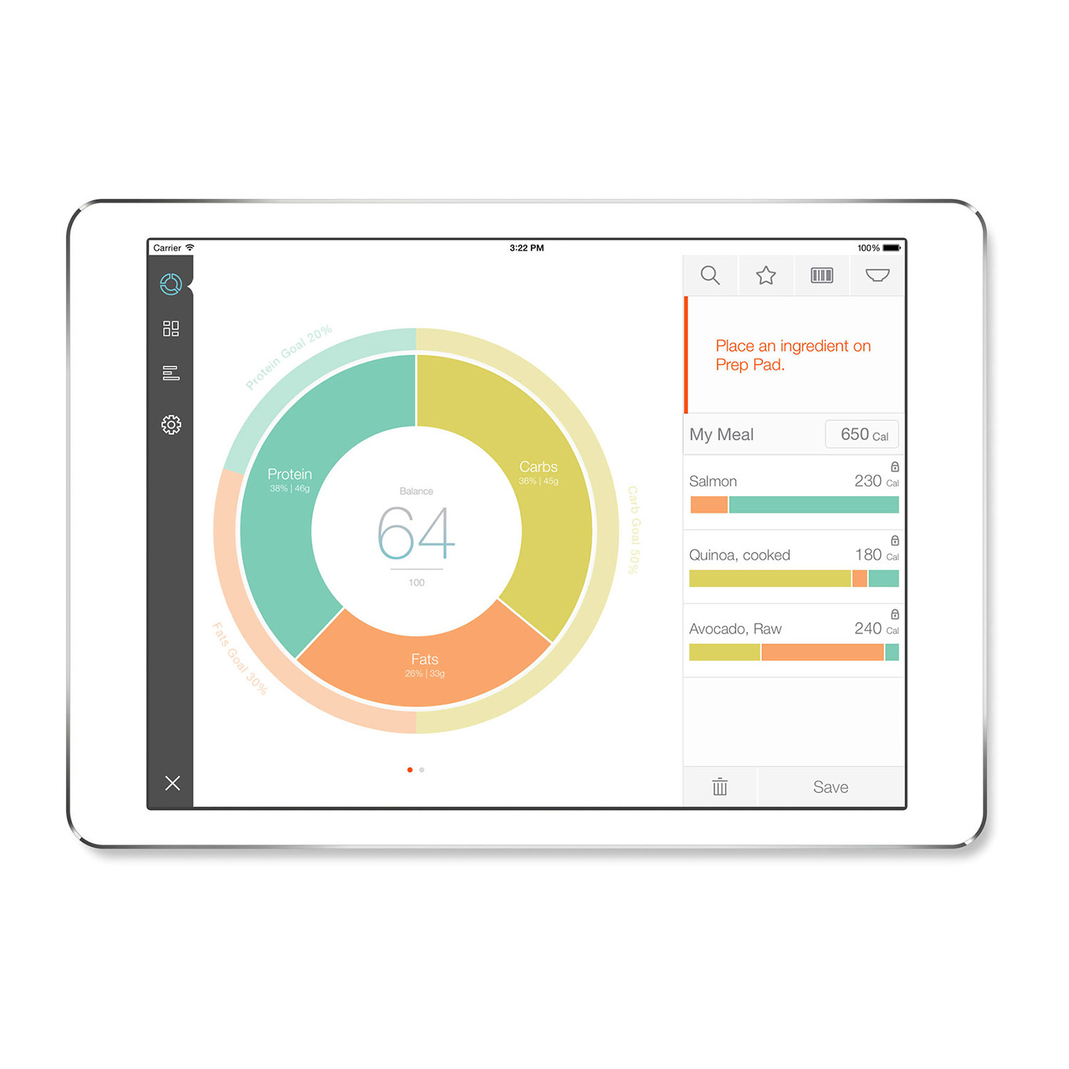 Prep Pad is the smart food scale that gives you real-time insight into the nutrition of the food you eat with an accurate breakdown of carbs, protein, fats and other essential nutrients. Designed for use with the Countertop app, this innovative scale allows you to create balanced meals, add up calories, and track your progress as you learn more about what you eat. Simply place an ingredient on Prep Pad and do a quick search or easy barcode scan to select your food type from a database of over 300,000 food types. Then, you can easily adjust your meal by adding or removing ingredients and portions to reach your personalized nutrition goals