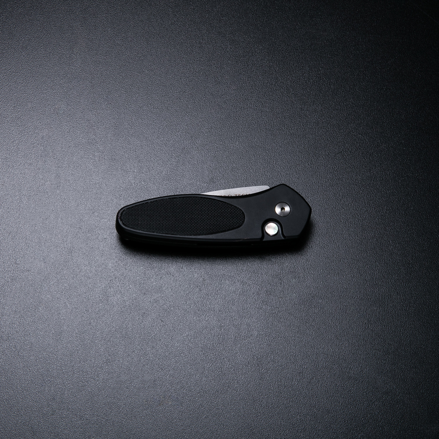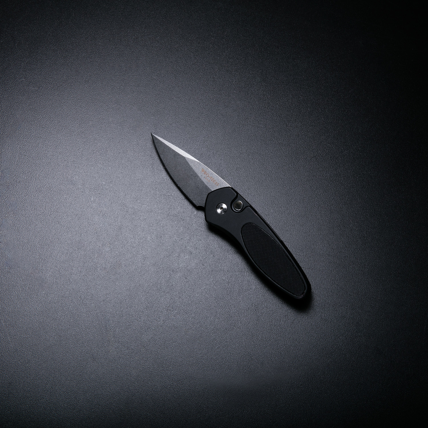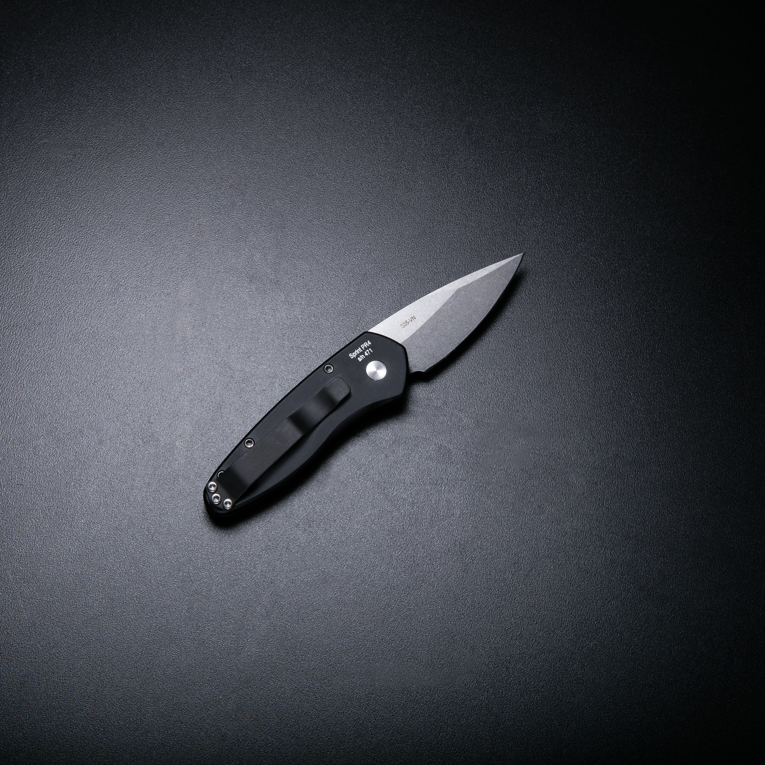 Black anodized aluminum handle, black G-10 inlay with micro-texture on front, back is solid with pocket clip, black lip pearl inlay push button, Stonewash S35-VN Blade.