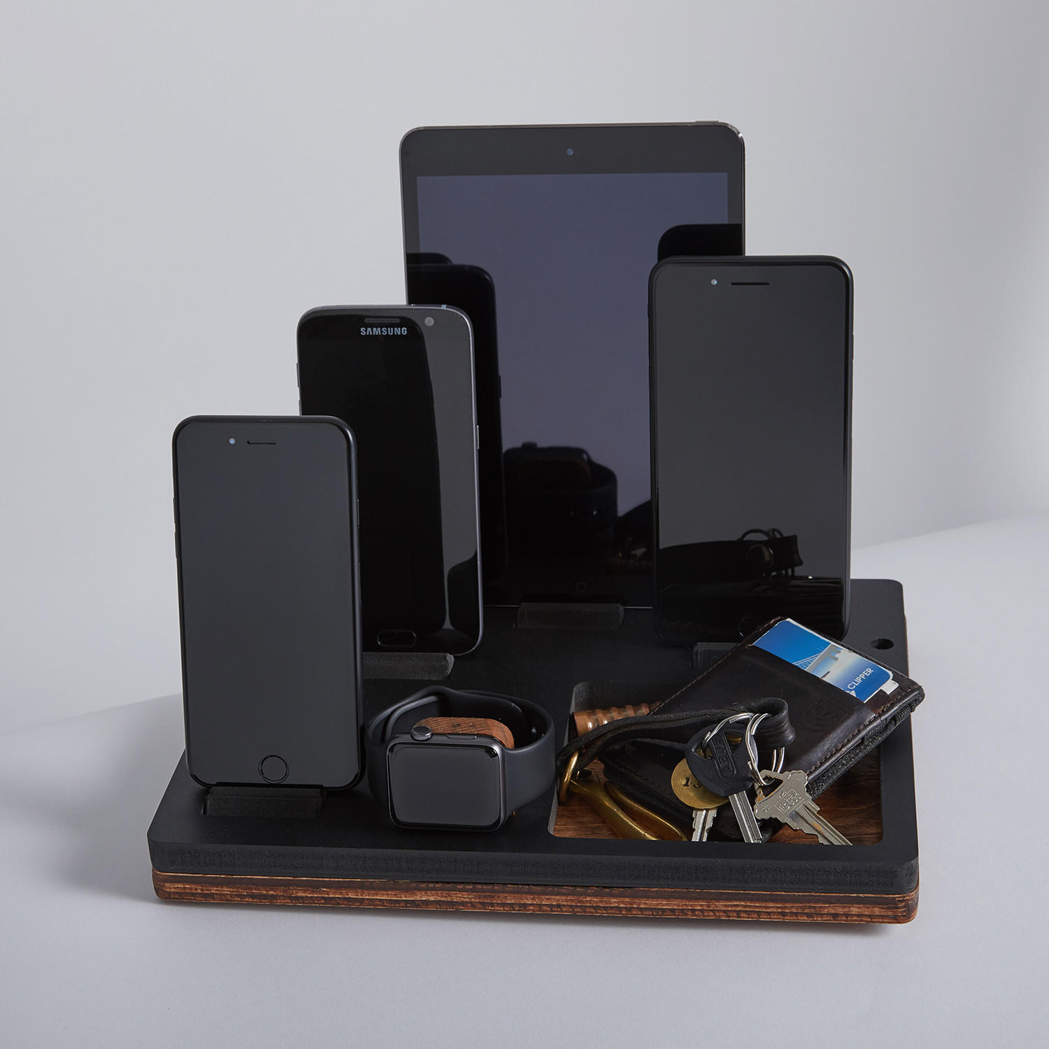 The NytStnd Collection features multi-device charging stations that look sleek and purposeful on a shelf, a table, or next to your bed, and are expressly designed to charge several devices all at once - especially for couples or families. Each variation is comprised of a solid base, with ports for all of your Apple devices, and sleek pieces to hold them upright, so you can organize them neatly and accessibly in one place. All you have to do is thread in your charging cords.