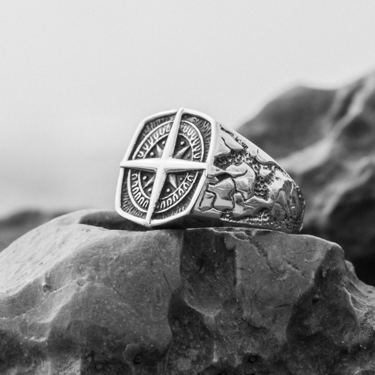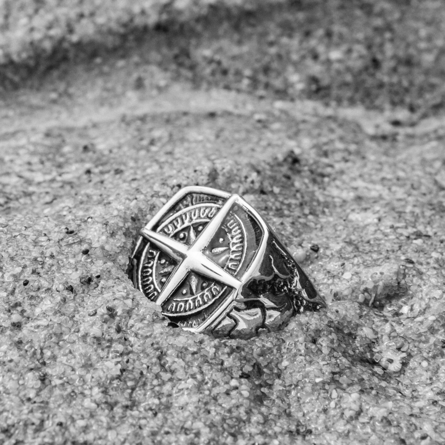 In the early 1600s, the Caribbean island of Tortuga was infamously known as a popular destination for pirates. Men of debatable moral character came from around the world to rob European ships blind while drinking rum by the barrel. Let this detailed compass ring help you steer clear of trouble on open waters.
