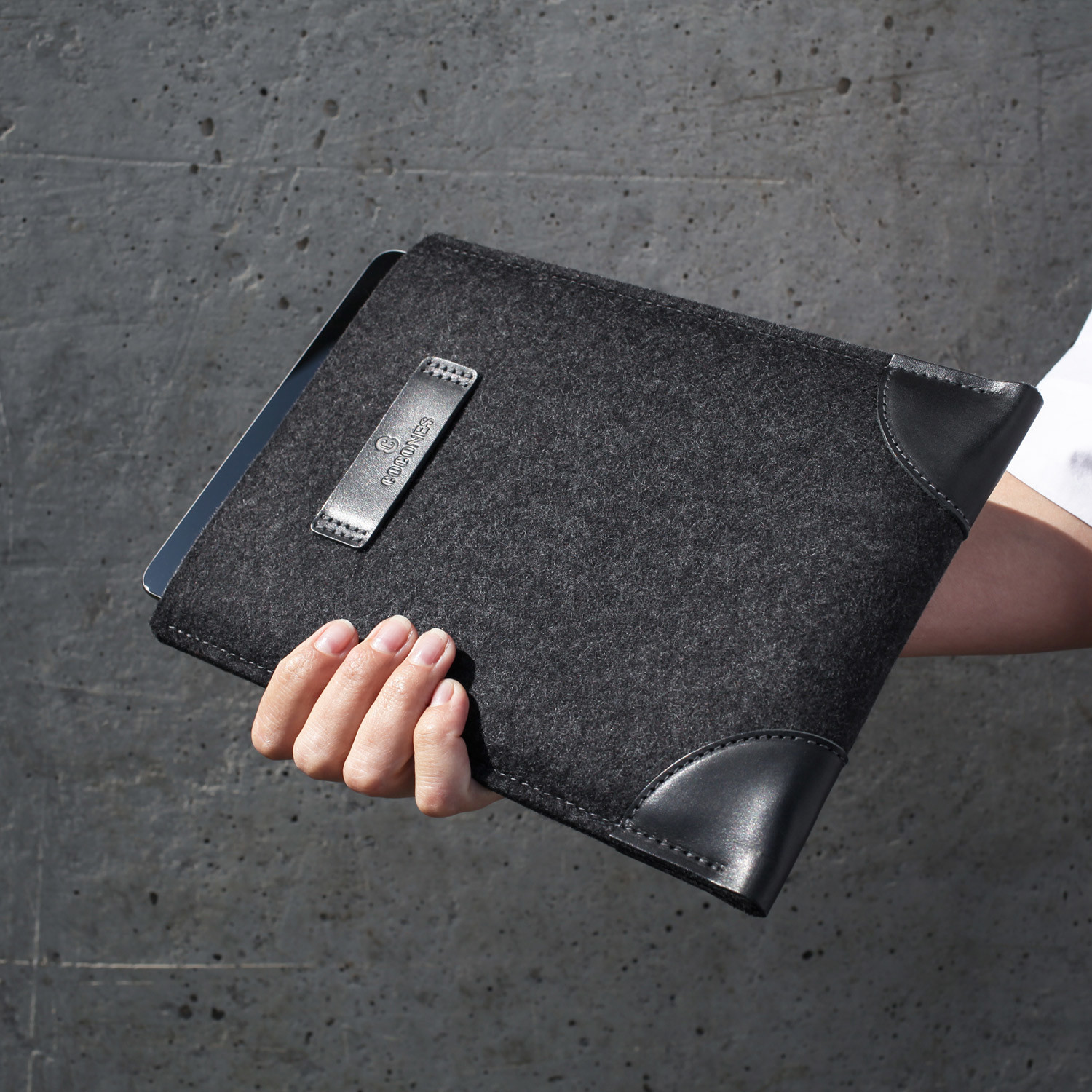 This Classic iPad Sleeve is designed for a fairly snug fit and features a combination of minimalist design and natural materials, with a luxury feel. The sleeve is made from vegetable tanned Italian leather and 100% Merino wool felt, with a rich, dense texture. It sports a leather patch embossed with the Cocones logo and leather patches in the bottom corners for reinforcement.