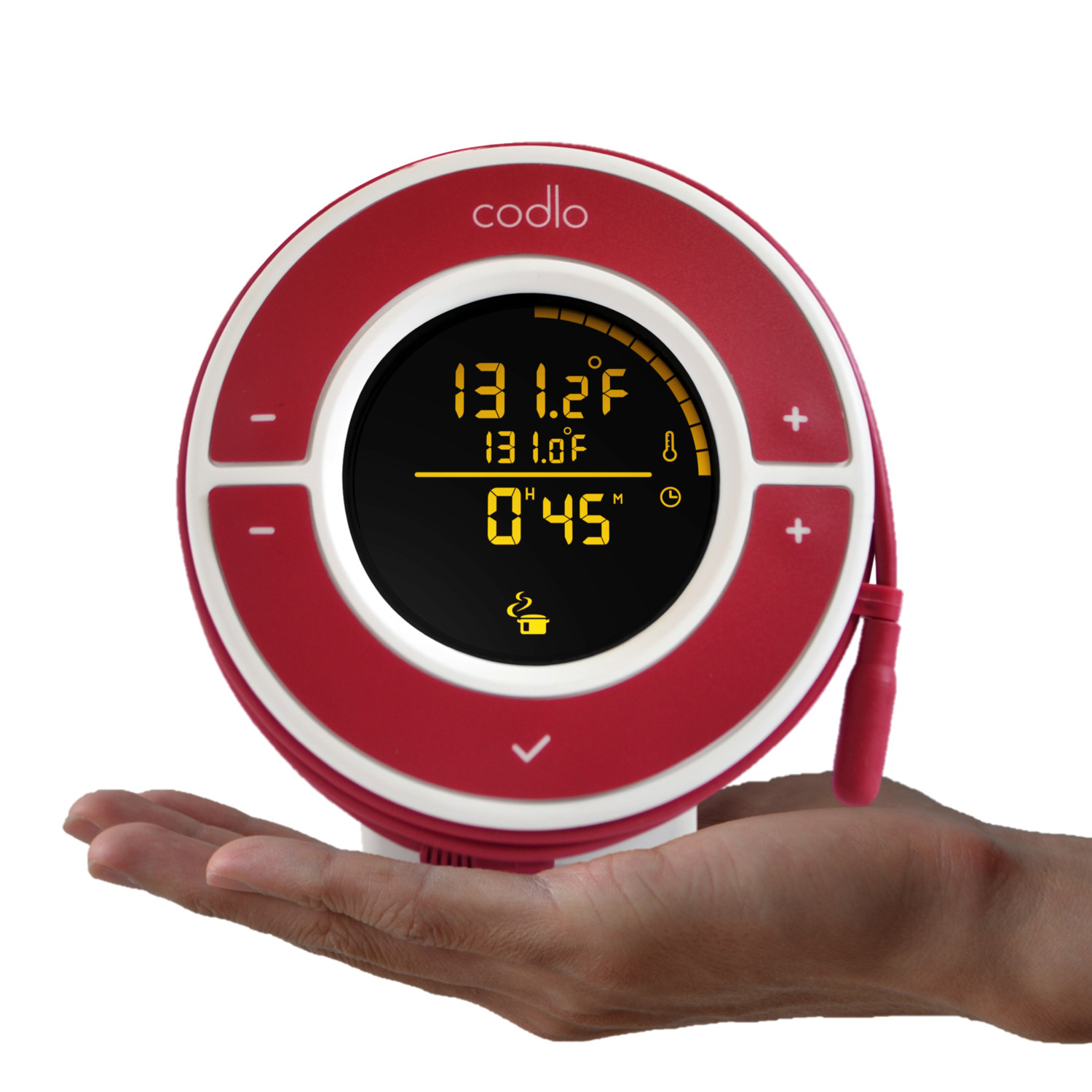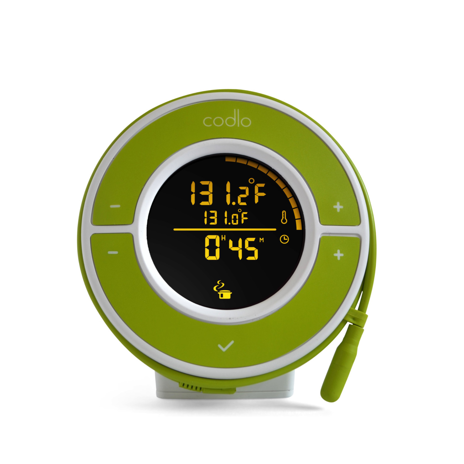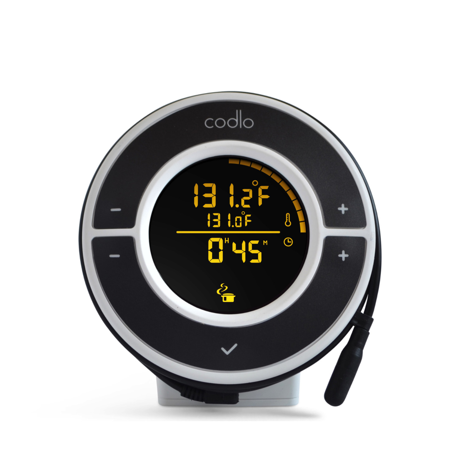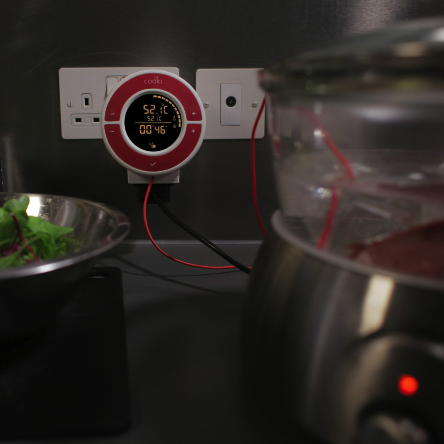 Codlo is designed for the practical home chef in mind. Super compact, it takes up zero kitchen countertop space as it plugs straight into your kitchen’s wall socket. Its large, crisp, 2.4” wide-angled LCD screen makes monitoring cooking progress a breeze from afar. Codlo is extremely energy efficient, typically using less than 60w during cooking, as pairing up with a well-insulated cooker minimizes heat loss and water evaporation. Cleaning up is easy too: simply pour away the water after cooking and give Codlo’s sensor a quick wipe and you’re done: no heating element lime scale issues to worry about.