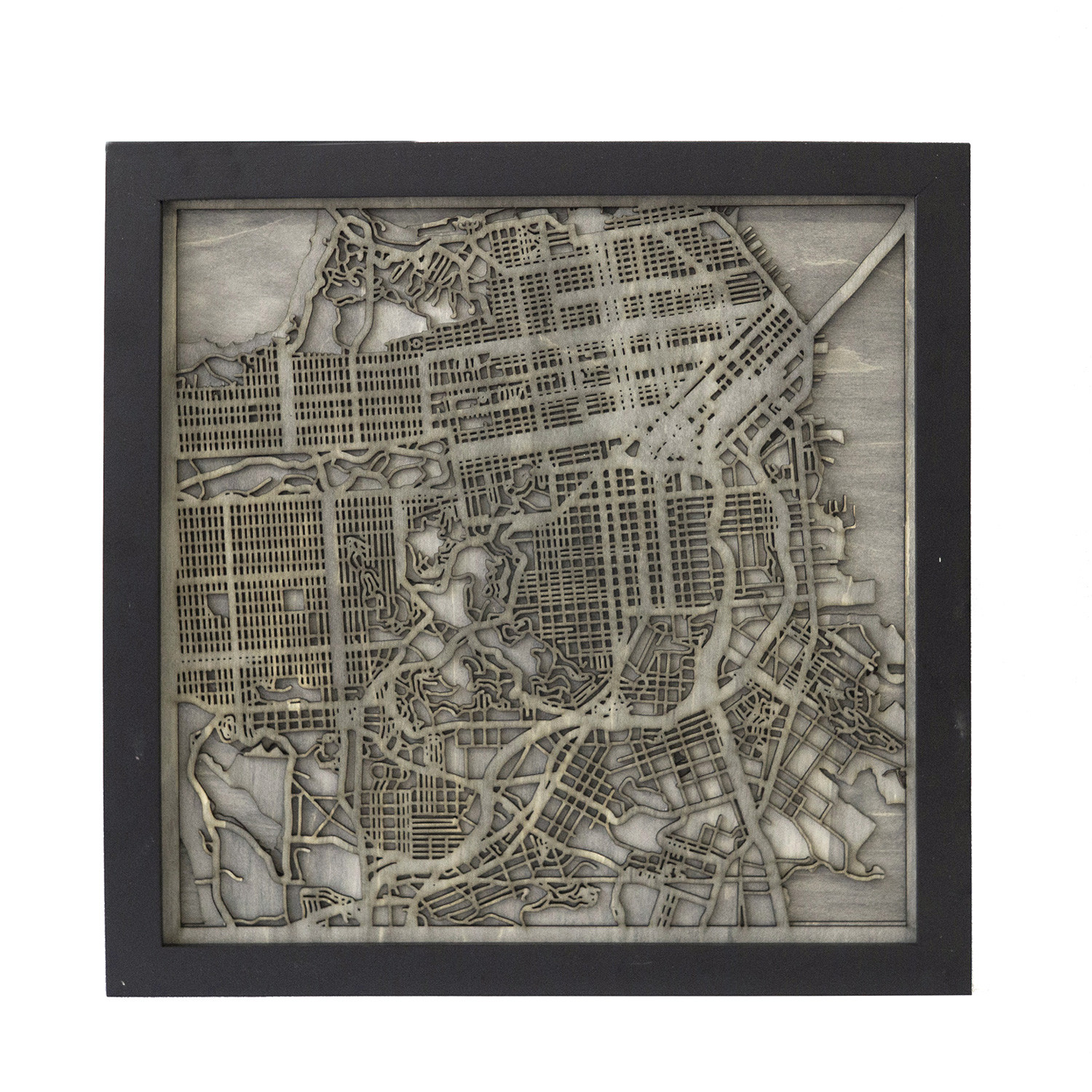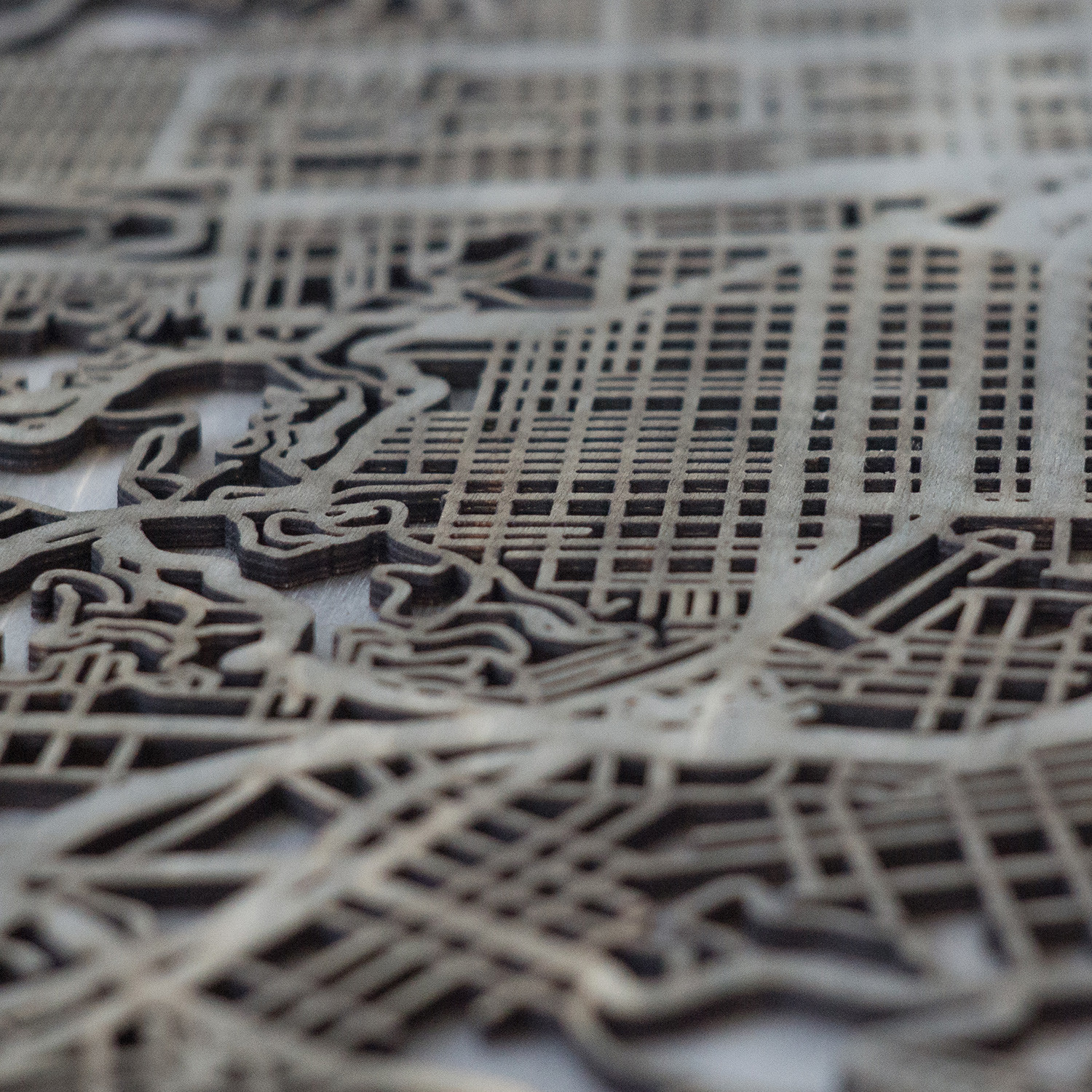This map of San Francisco is laser cut from multiple layers of plywood and assembled by hand. Natural birch wood is stained with gray wood dye to preserve the grain. Prove your love for the Bay with this intricate map from the minds and hands of designers Kasia Wisniewski and Nick Foley.