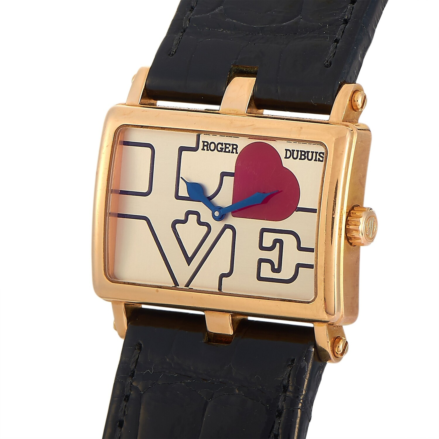It will be easier for you to make a powerful style statement when you have the Too Much Love Watch on your wrist. This quartz timepiece features a rectangular case in 18K rose gold. The dial has the word LOVE printed on it with a red heart replacing the letter O. Blue hour and minute hands point to the time in the numberless dial. Finishing the glam chic look of this timepiece is a leather strap in black.