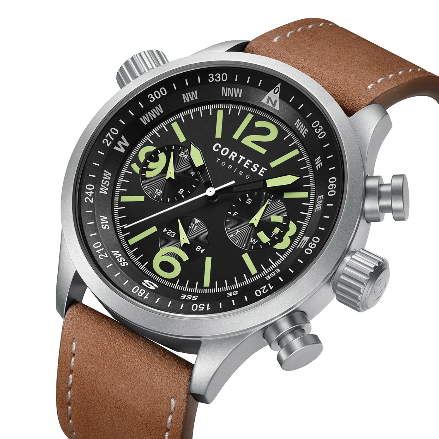 With a compass ring, day function, 24 hour function, and Seiko VX9J quartz movement, this Cortese Giramondo Multifunctiona offers the perfect fit for the many diverse moments in the life — it's got a utilitarian business look, but is sleek enough to outlast your suit and be worn well into the evening.