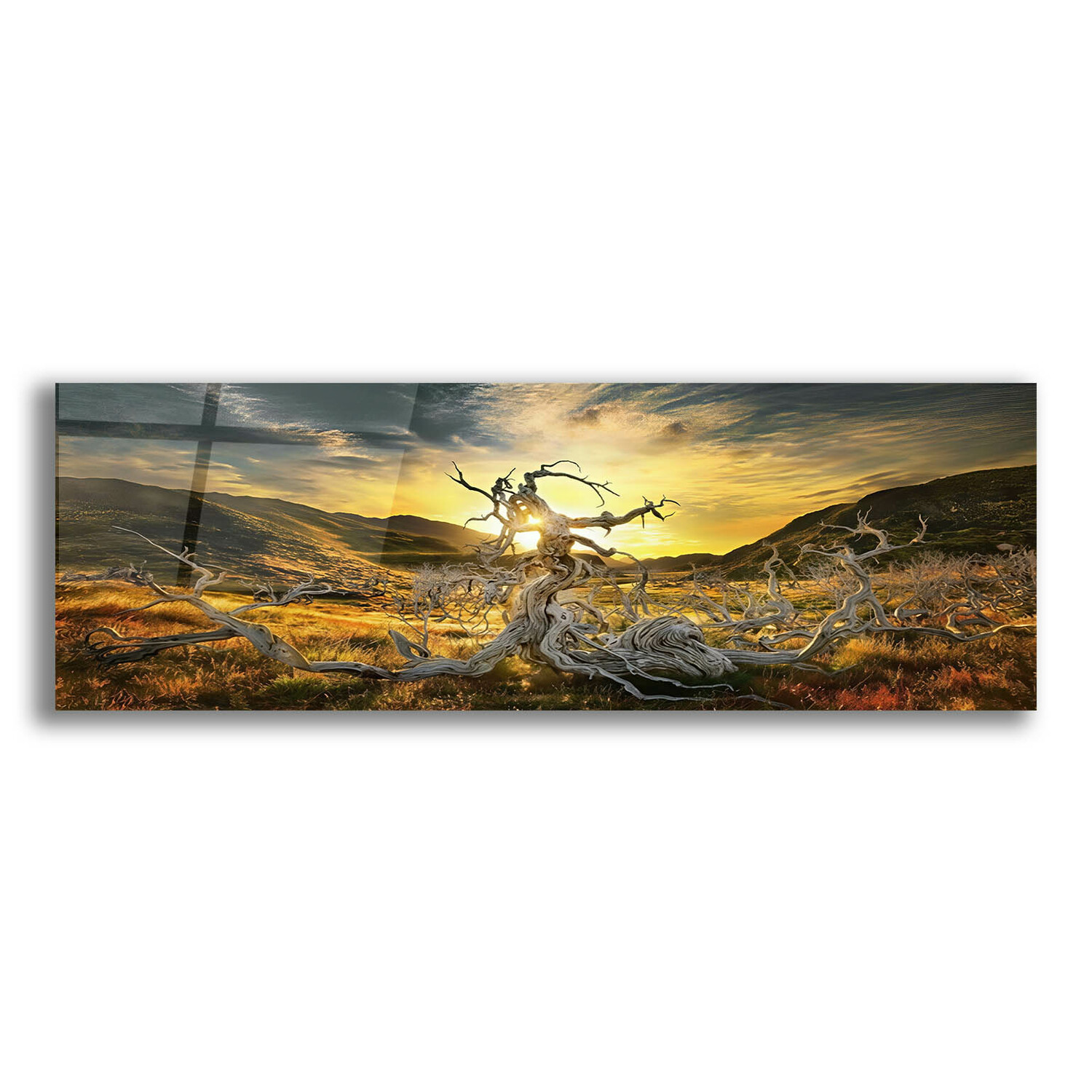 Enjoy the sunset setting over the hills and the ancient Bristlecone Pine tree in California's Inyo National Forest. Vivid colors on a large 60" x 20" acrylic surface, this wall art is perfect for your home or office. The pre-mounted frame on the back makes it ready to be hung right out of the box. The strong acrylic gives it an unparalleled gorgeous glossy finish.