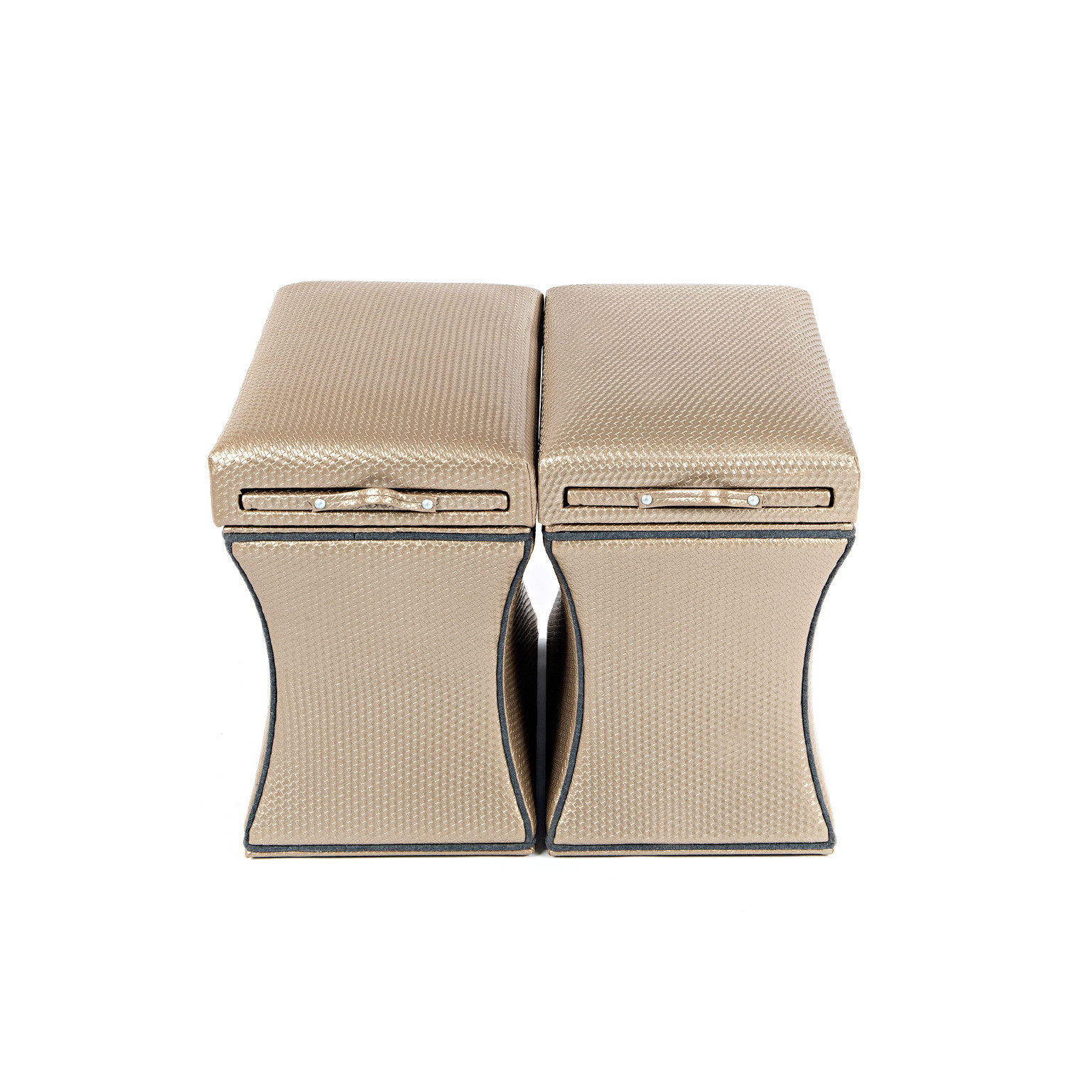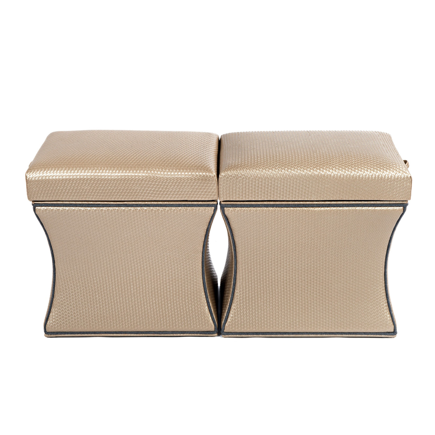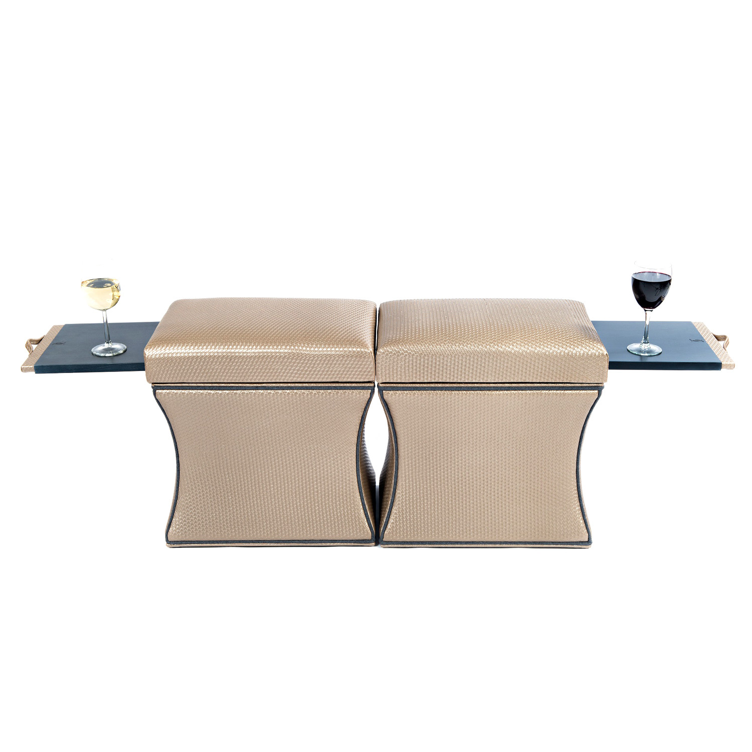 The Morgan Storage Ottoman featured in a champagne faux leather with gray piping is as stunning as it is practical. The wide-ranging functionality allows the piece to be utilized as a stool, ottoman, end table, foot rest, coffee table and great in pairs. The streamlined design can be dressed up or dressed down. Take advantage of the signature Label 23 pull out shelf finished in distressed dark gray wood, with storage in the base.