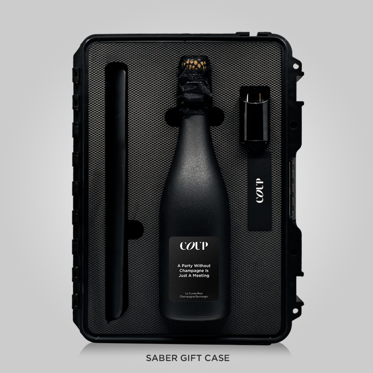 The set is shipped in the Saber & Collector's padded hard case that is dustproof, waterproof, shockproof, and weatherproof. It is designed to safely transport a bottle of Coup Champagne anywhere in the world. The inside of the case is laser cut fit all the components.