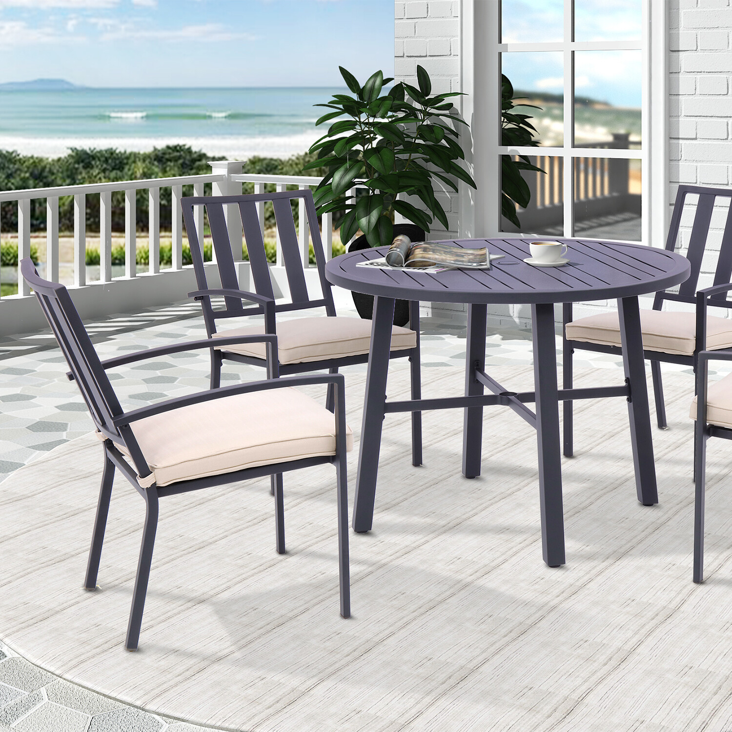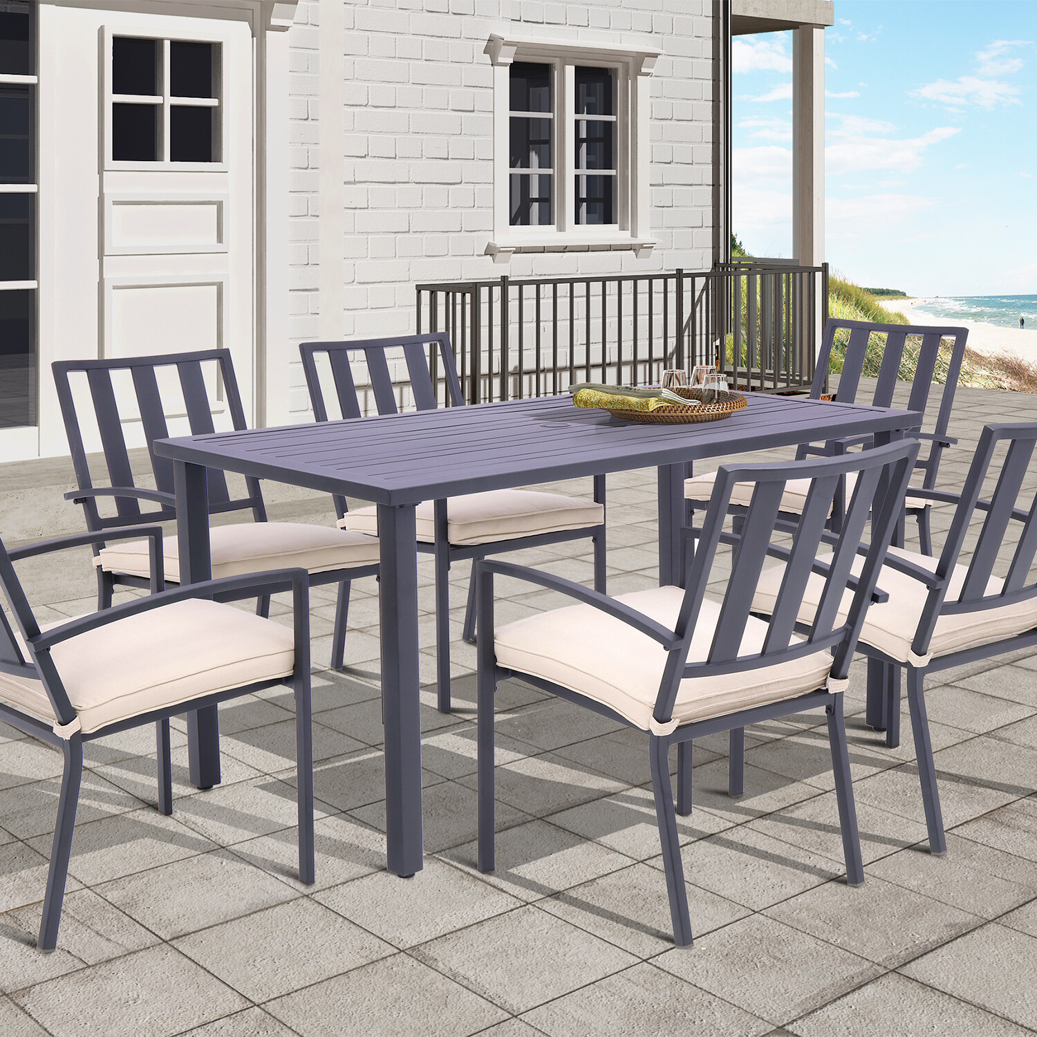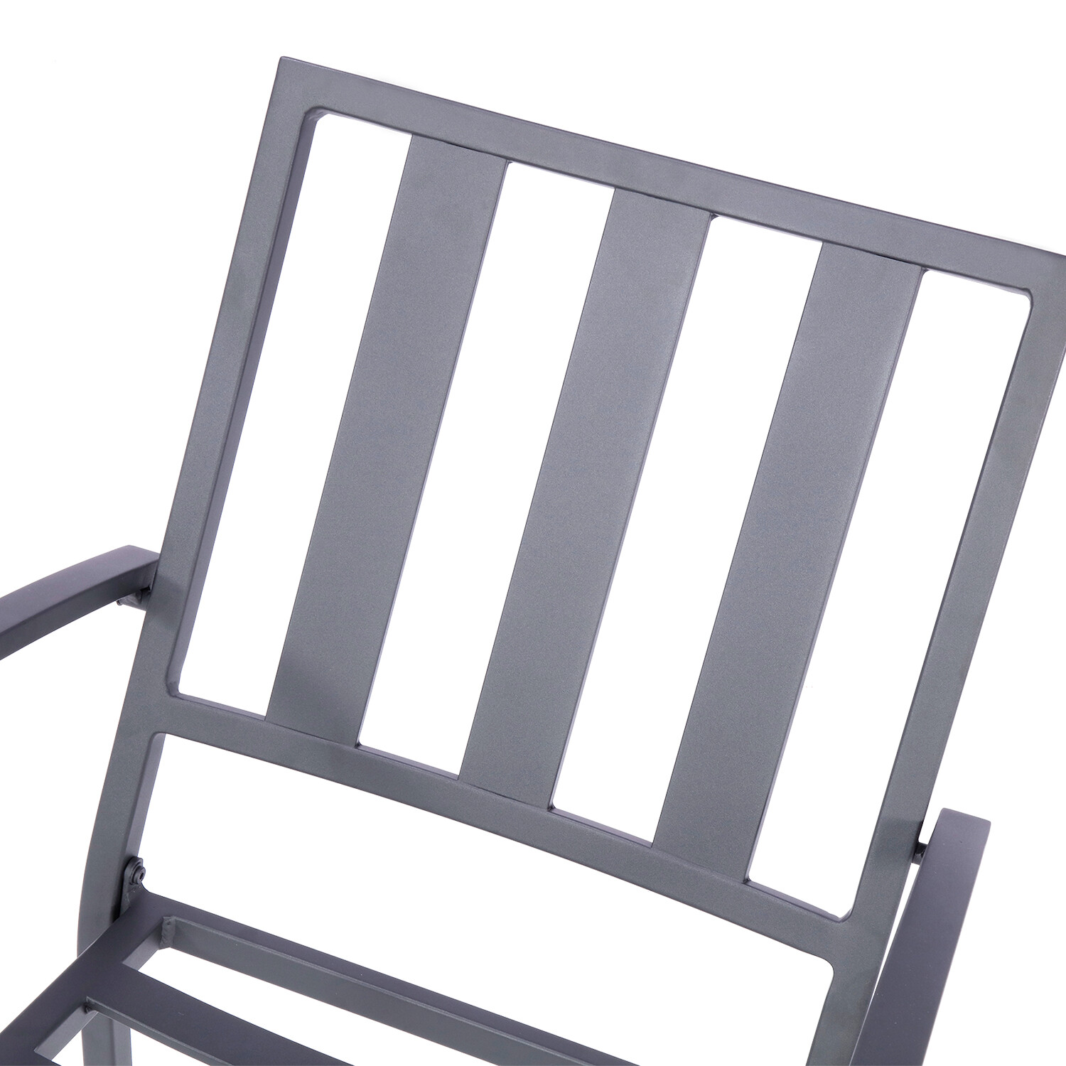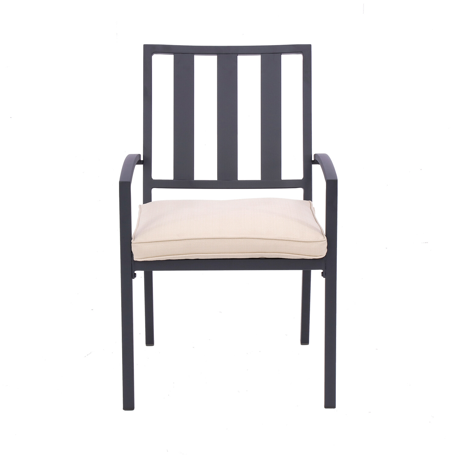 Whether you use it indoors or out, the Nusa Ladder-back Dining Armchair effortlessly layers your sunroom or anchors your dining space with a classic appeal. Crafted using a special stamping process, the decorative ladder-style chairback is complemented by a sleek frame and four clean-lined legs for a transitional look. The patio chairs feature removable seat cushions and curved arms for cozy and comfortable seating.