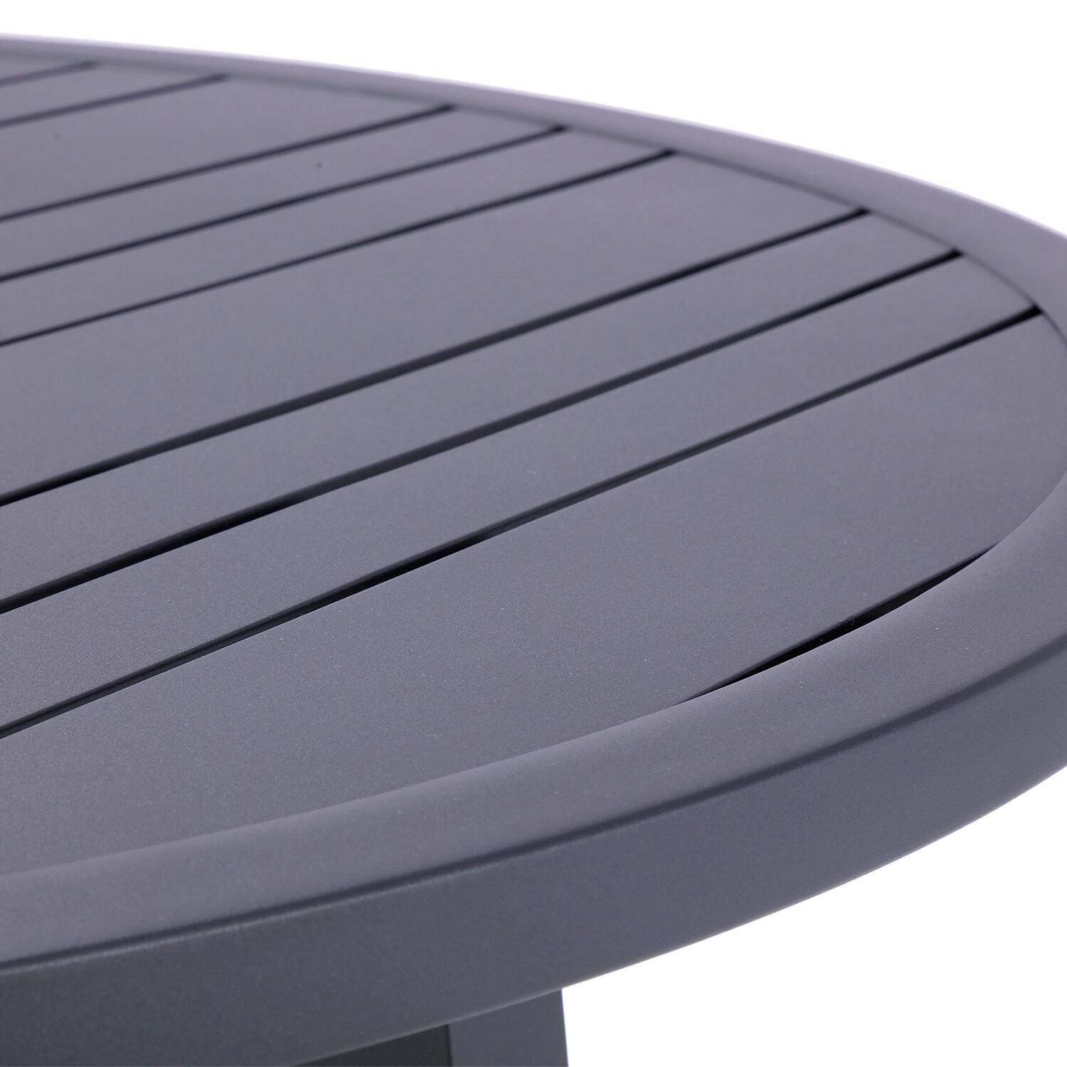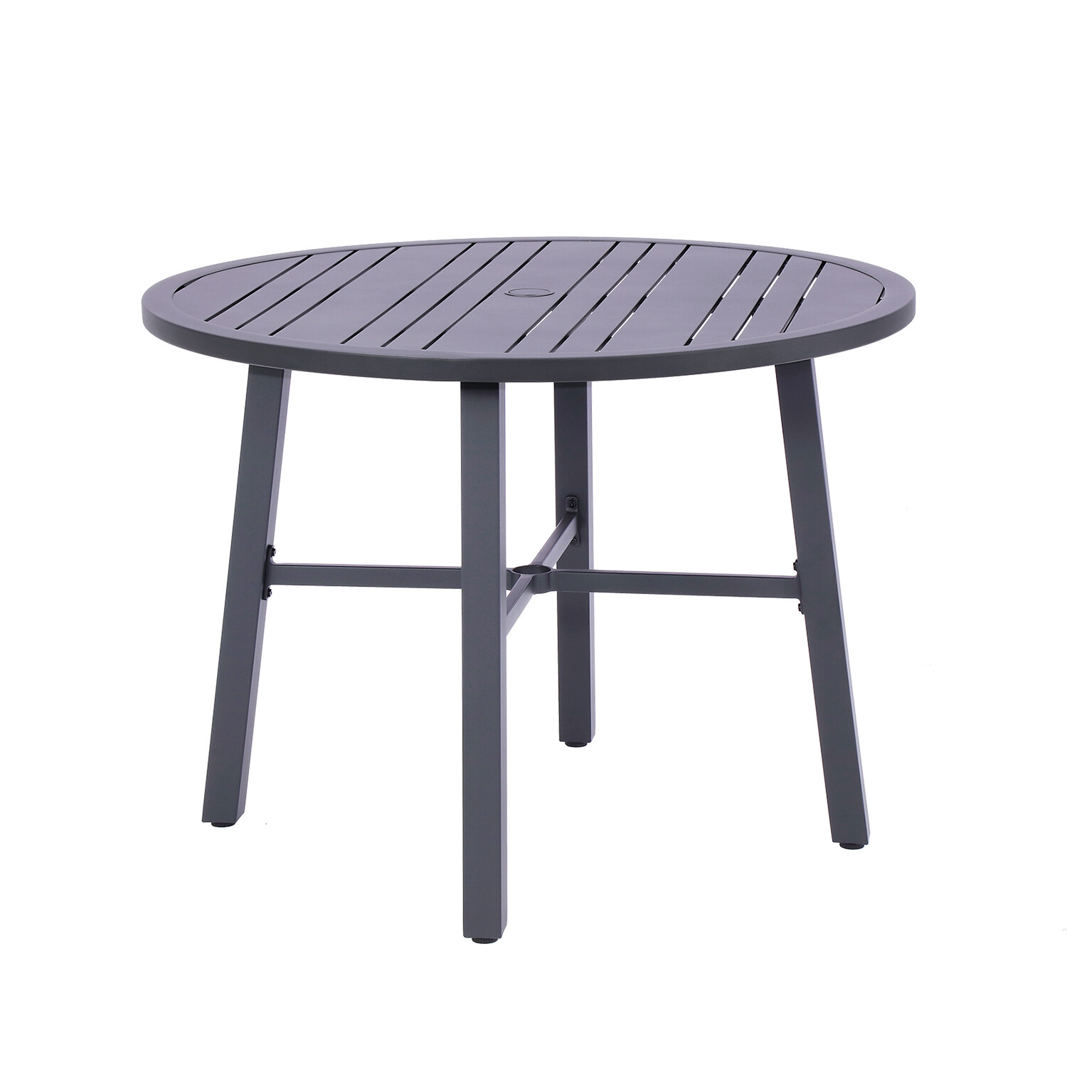 Whether you use it indoor or out, the Nusa Round Slat Dining Table effortlessly layers your sunroom or anchors your dining space with transitional appeal. Crafted of weather-resistant e-coating aluminum, four metal-pipe constructed legs offer reliable stability with the added benefit of being rust and scratch-resistant. The umbrella hole in the center of the table allows you to further customize your lounge space for ultimate comfort.