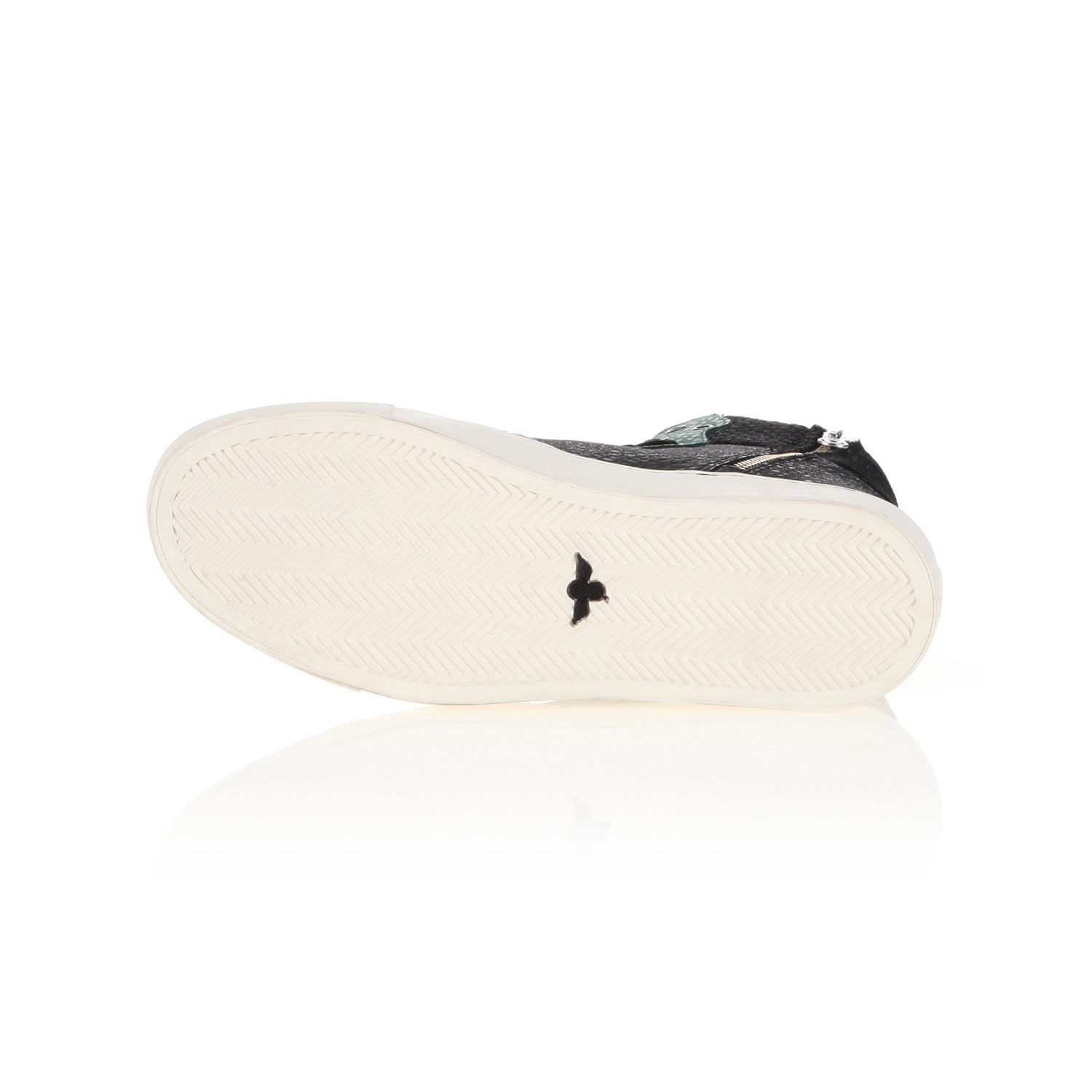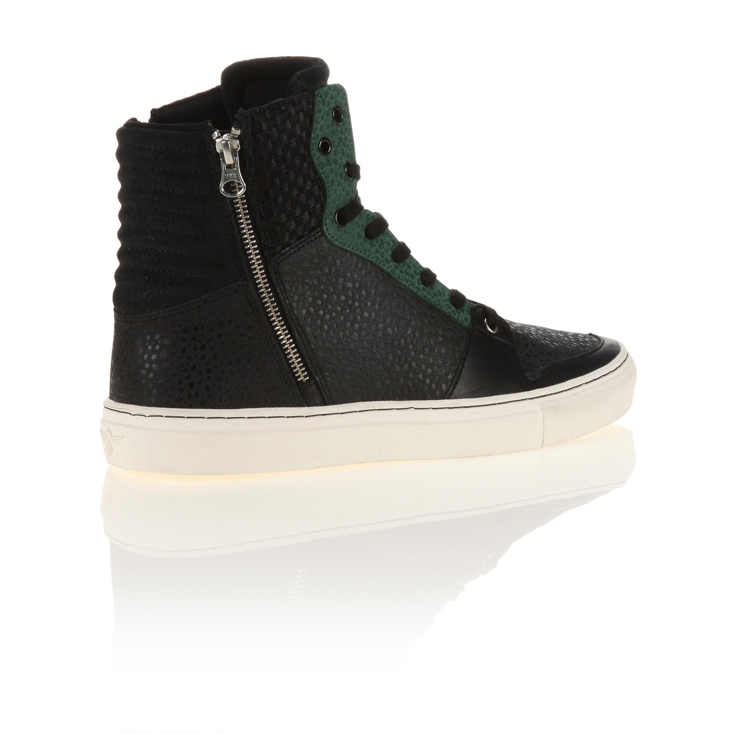 These Black + Green Adonis sneakers feature YKK zippers on the medial and lateral sides for easy access. They come equipped with a custom padded tongue, leather patch logo, and top heel counter. The fashion high tops are a standout style from Creative Recreation's new collection and can be worn either day or night.