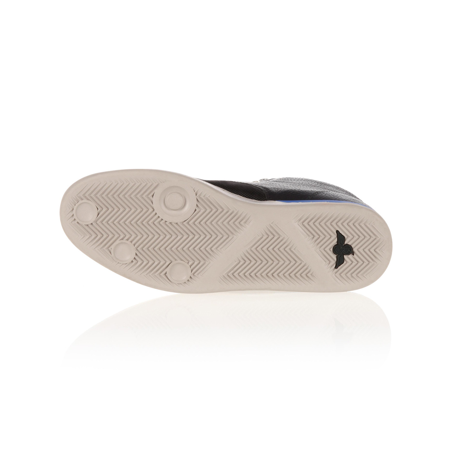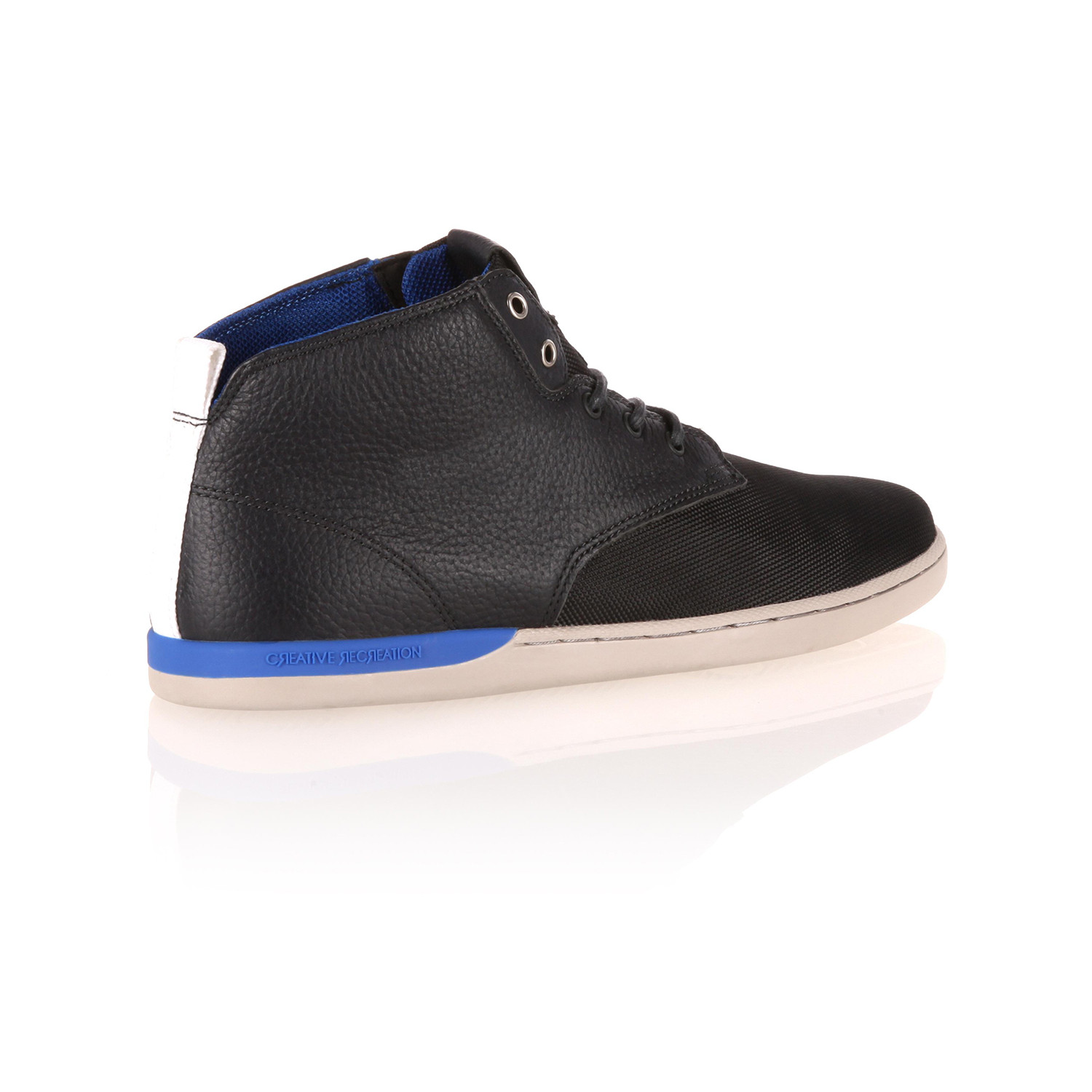 The Vito's clean, classic, casual look takes you everywhere. A low-profile outsole pairs well with the clean blucher-styled toe vamp and minimal eye row. This navy and black mid-top shoe features tumbled leather and woven nylon. It has a color-pop TPU heel clip in sea blue. The interior has a soft poly-mesh lining.