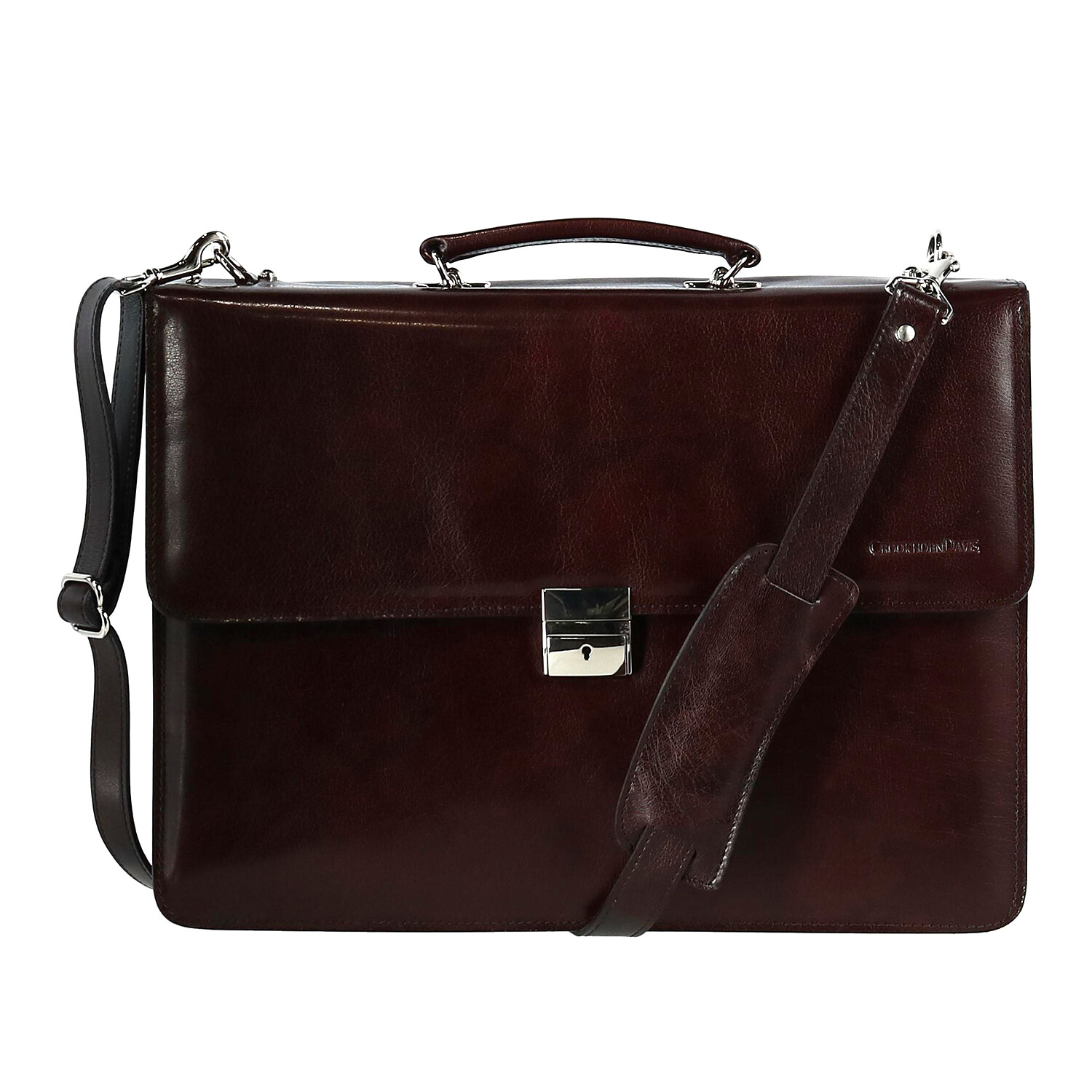 Organize in elegance with this leather briefcase from Crookhorn Davis. Keep your items safe with optional lock closure and suede lining for a gentle touch. Double gussets provide plenty of room and the interior zip divider pocket along with the 3 pockets, 5 pen holders, a business card holder, and an exterior long slip pocket allow for neat sorting of your essentials. The top handle and the removable shoulder strap make it convenient to carry.